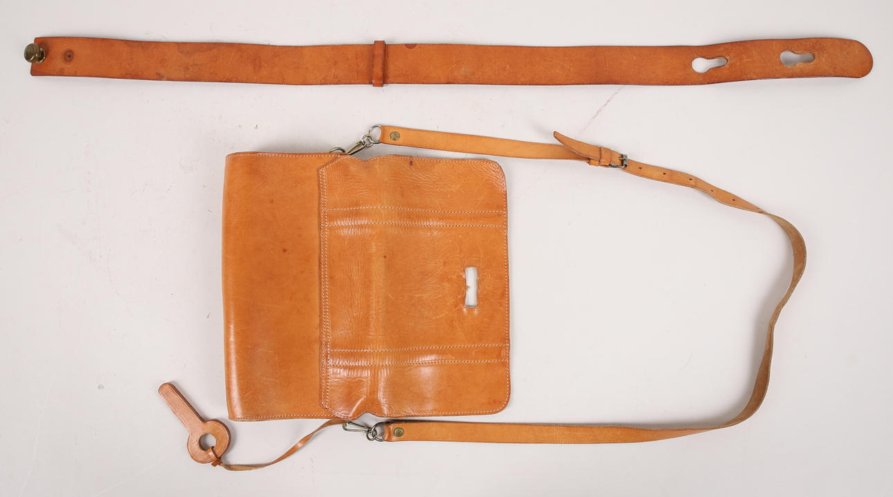 Bag, shoulder strap, dimensions approx. 17x29x4 cm Belt, clasp with brass button, length approx. 102 cm, to clasp 84 & 94 cm, width approx. 5 cm. Condition Leather with patina, marks and minor scrapes. 125328