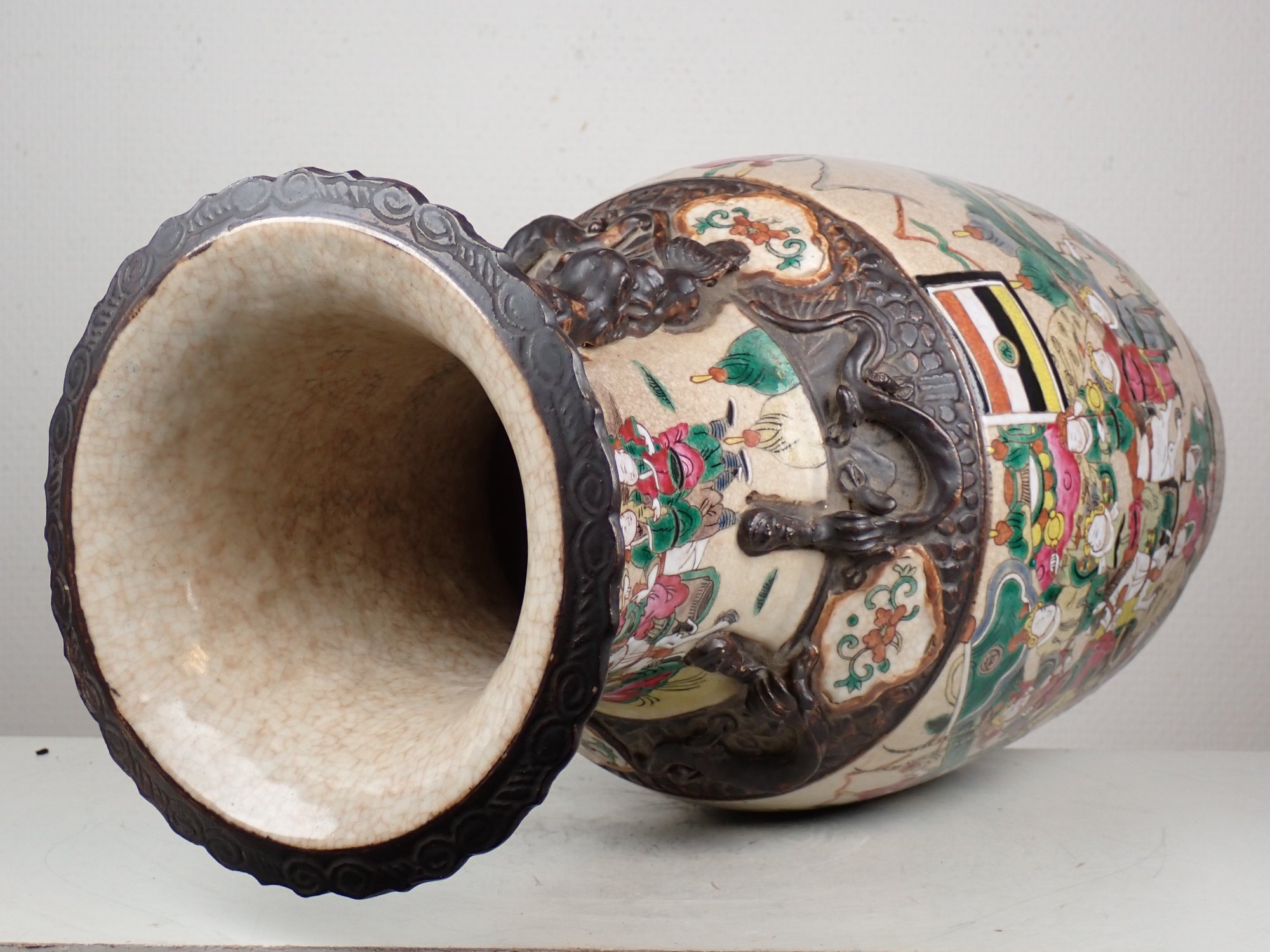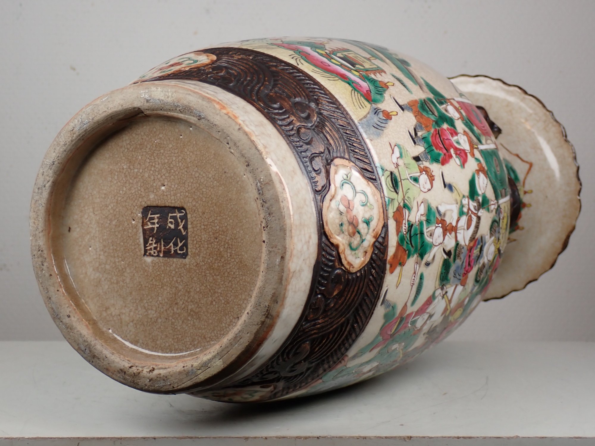 A good quality Nanking porcelain vase, of baluster form, standing 43.5cm tall and weighing 4770g, finely painted in polychrome enamels on a beige crackled ground to depict warriors on foot and horseback, engaged in battle. The shoulders adorned with chilongs, the collar with finely sculpted foo dogs. Marked to the underside with the usual apocryphal Chenghua reign mark, inscribed in the clay. Condition: Very good, no significant damages or repairs. Minor wear commensurate with age. 33031037