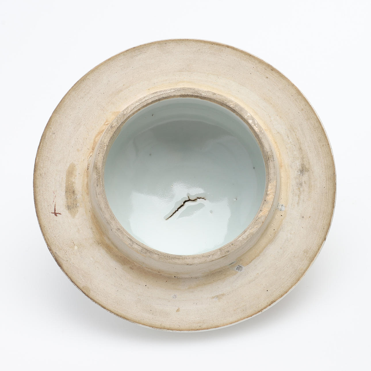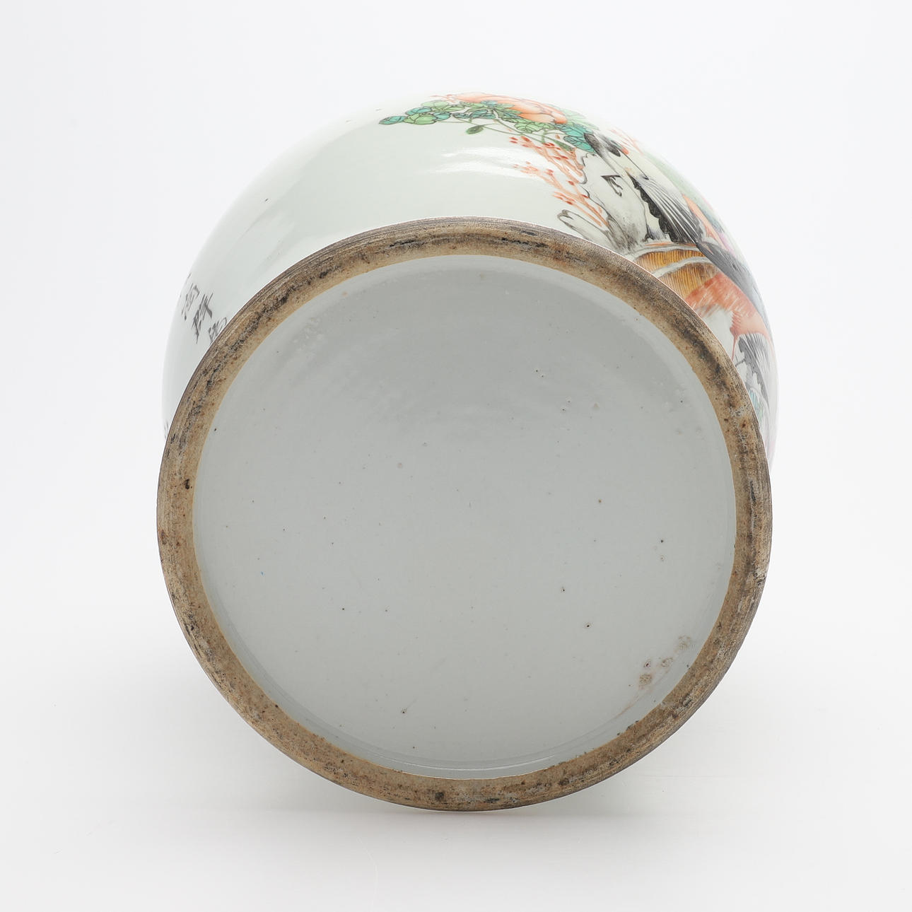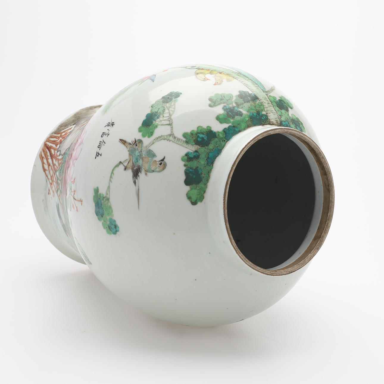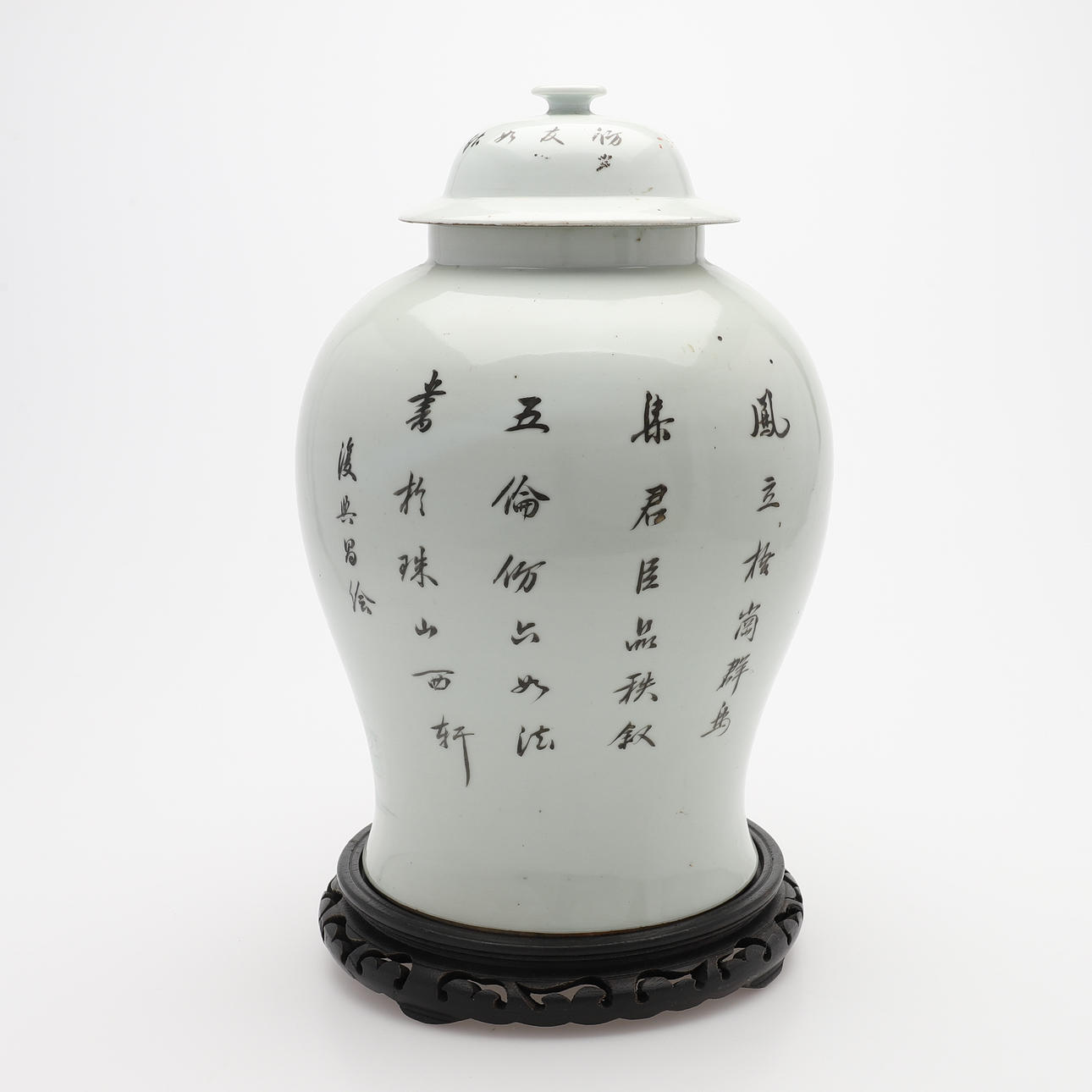 Porcelain with paintings in colors depicting birds and vegetation as well as calligraphy, China, around the year 1900, height 39 cm. Later stands of carved wood. Condition report Lid knob with notch. 120458