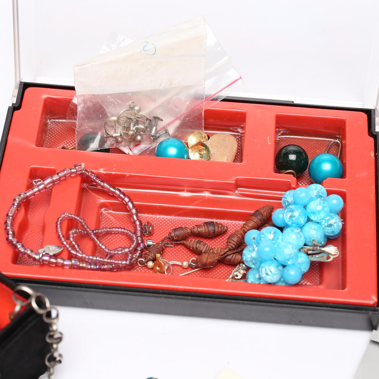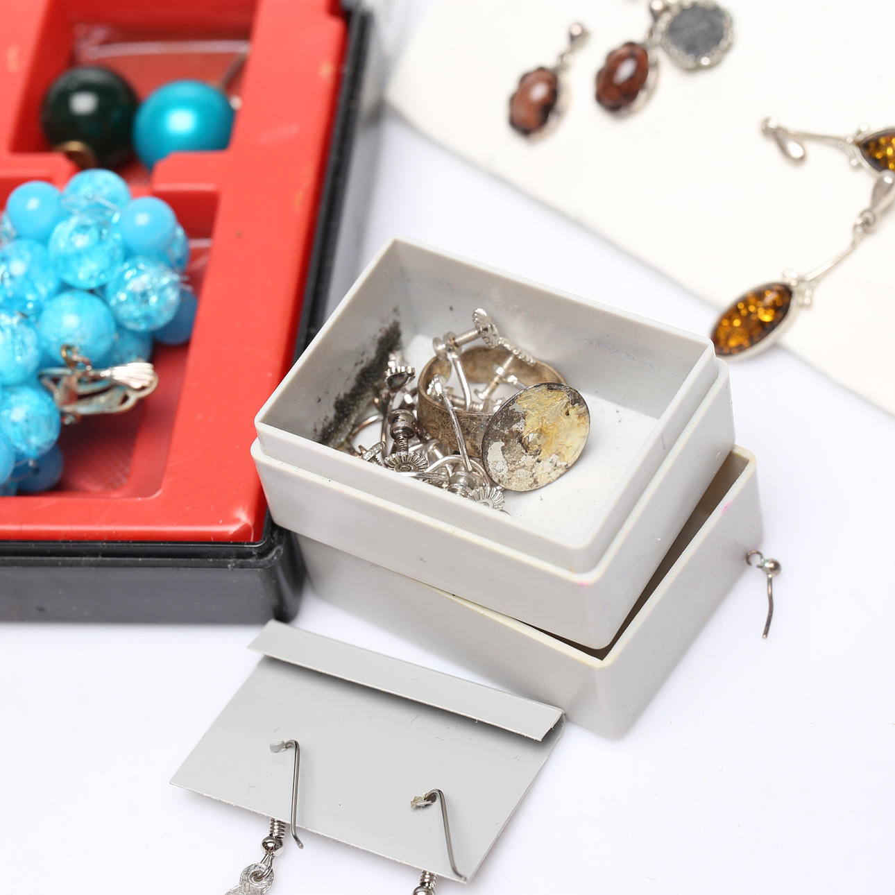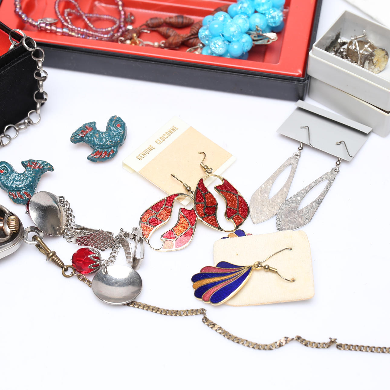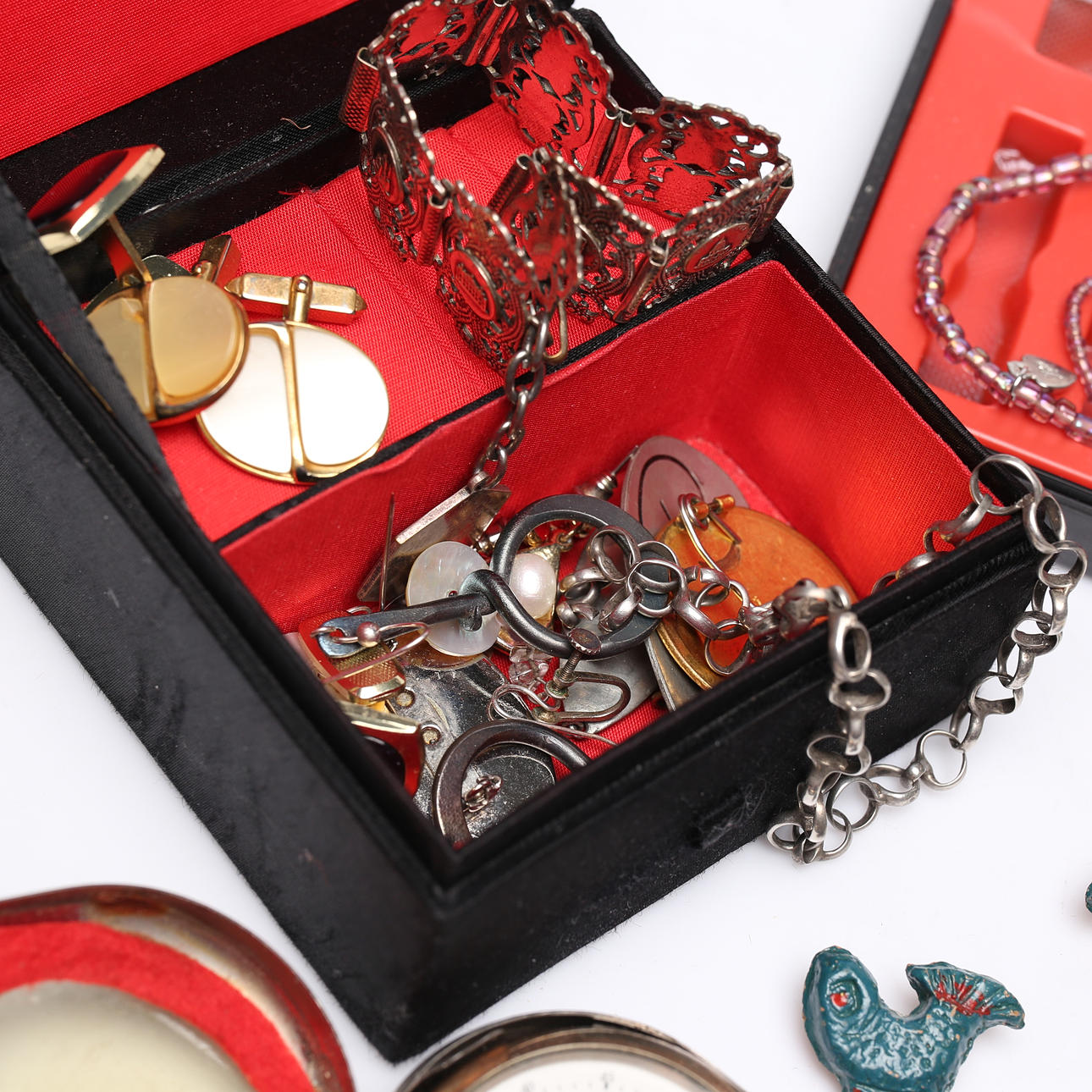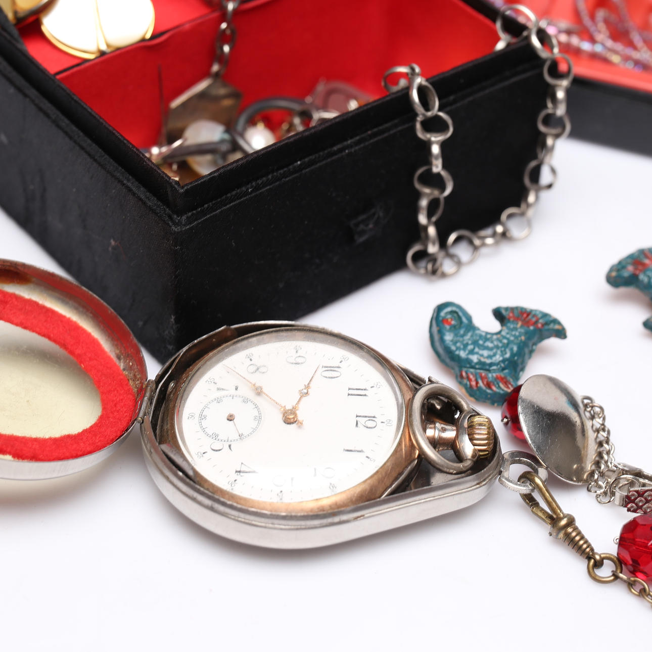 Pocket watch, silver, Earrings, bracelet, etc. Embroidered box, dimensions approx. 10x10x8 cm. Condition Wear, damage, not passed through. 354898
