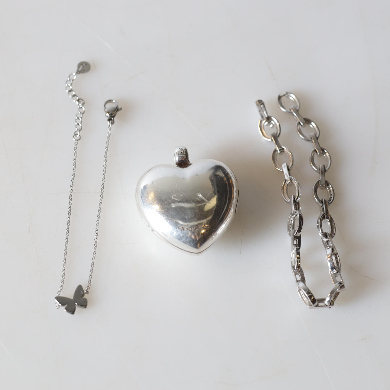 Including pendant “Heart” by Thomas Sabo in silver, contemporary. 1 pendant “Heart”, Thomas Sabo. Silver, total weight approx. 30 g. 1 bracelet, silver, length approx. 18 cm. Total weight approx. 11 g. 1 chain with pendant. Chain gold plated silver. Length approx. 52 cm, pendant length approx. 3 cm. 1 chain, yellow metal. Length approx. 50 cm. 1 bracelet, length approx. 20 cm. From the Police Authority's Division of Seizures and Found Goods. NO 2023-HG64779 NO 2024-HG42854 NO 2024-HG1846 NR 2023-HG53230 (chain) NO 2024-HG4589. Condition Sold on behalf of the Police Authority. Sold as is, no warranties exist. Defects may occur that are not reported in the object description or image. The buyer is responsible for inspecting the object before bidding. 67752