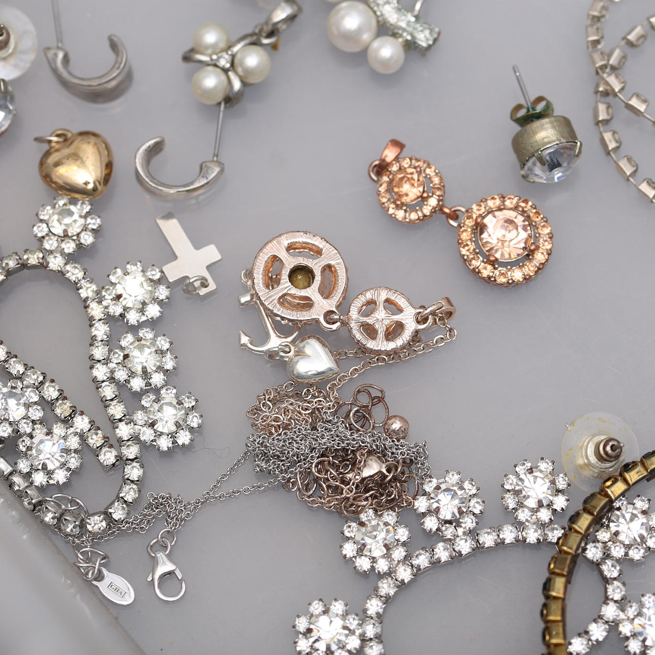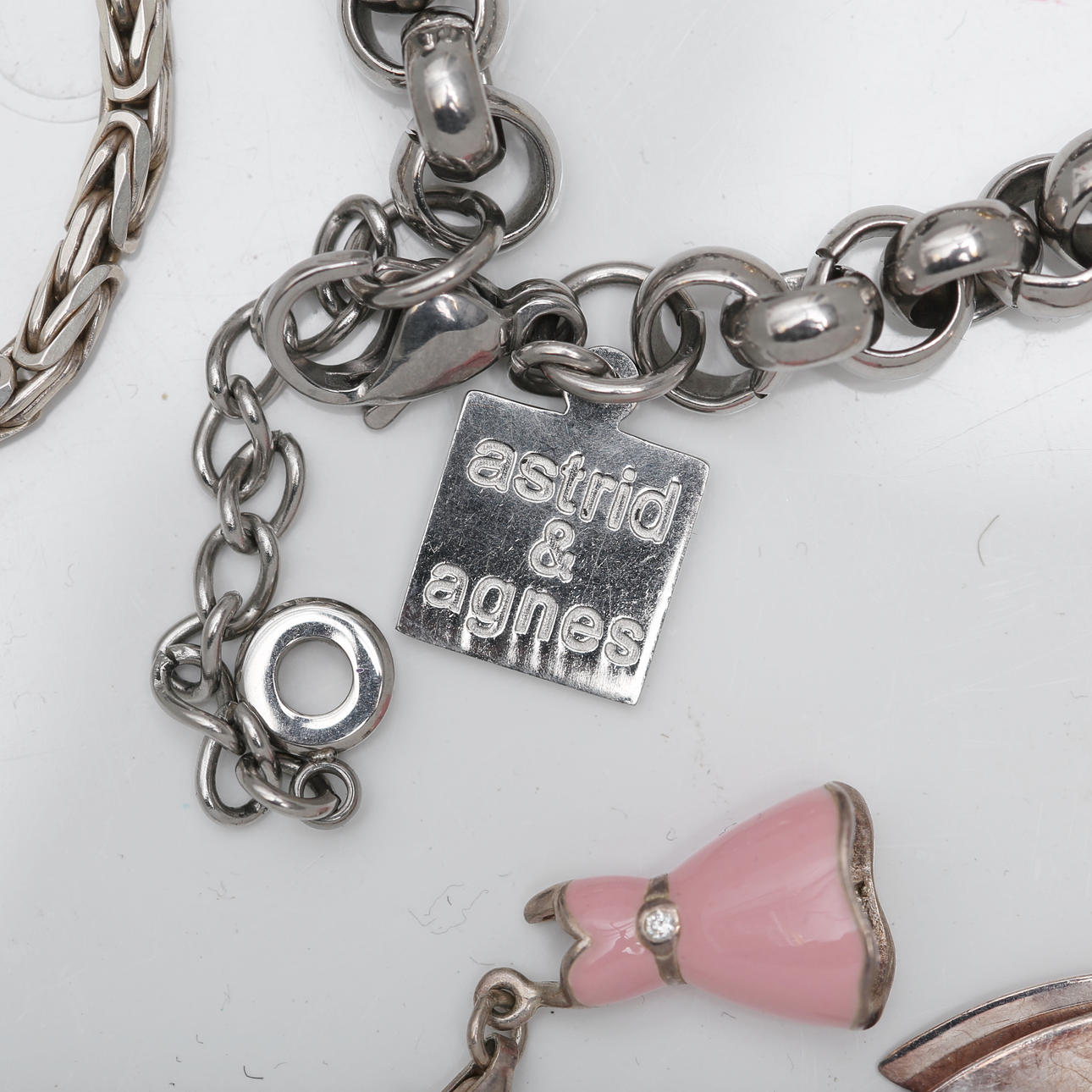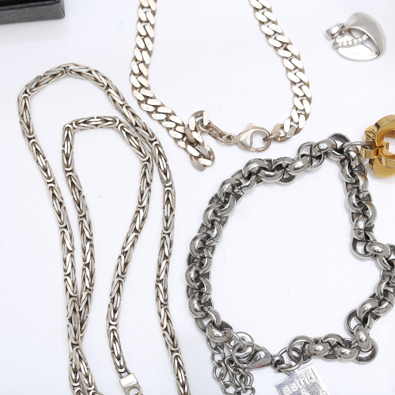 Necklace, earring, bracelet Chain, emperor link, silver, length approx. 43 cm, diameter approx. 3 mm Bracelet, armored bracelet, silver, length approx. 18 cm, width approx. 5 mm Pendant in the shape of a heart, silver, width approx. 13 mm Pendant, bronze, Kalevala Koru, length approx. 21 mm Bracelet, “Astrid & Agnes”, steel, length, approx. 19 cm, Earring, a pair, silver, in the form of leaves, length, approx. 7 cm m, m. Condition Not fully reviewed Defects may occur. 131234