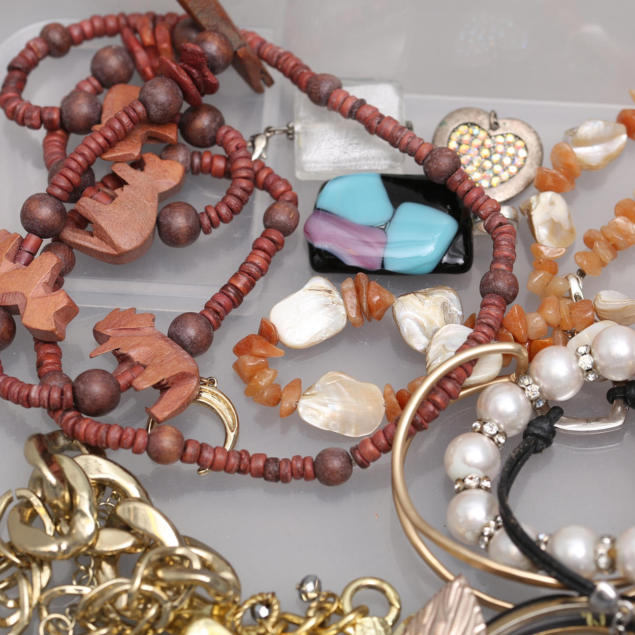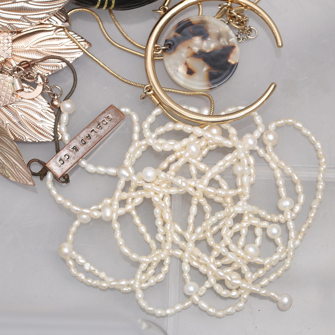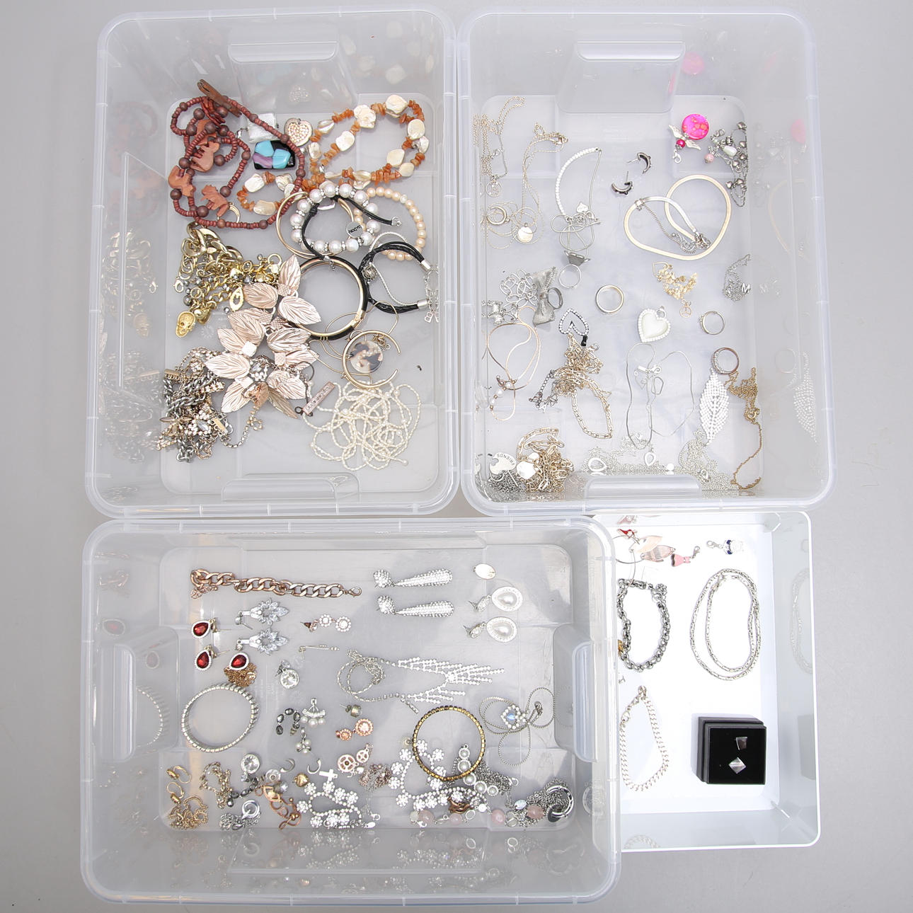 Necklace, earring, bracelet Chain, emperor link, silver, length approx. 43 cm, diameter approx. 3 mm Bracelet, armored bracelet, silver, length approx. 18 cm, width approx. 5 mm Pendant in the shape of a heart, silver, width approx. 13 mm Pendant, bronze, Kalevala Koru, length approx. 21 mm Bracelet, “Astrid & Agnes”, steel, length, approx. 19 cm, Earring, a pair, silver, in the form of leaves, length, approx. 7 cm m, m. Condition Not fully reviewed Defects may occur. 131234