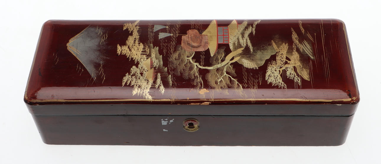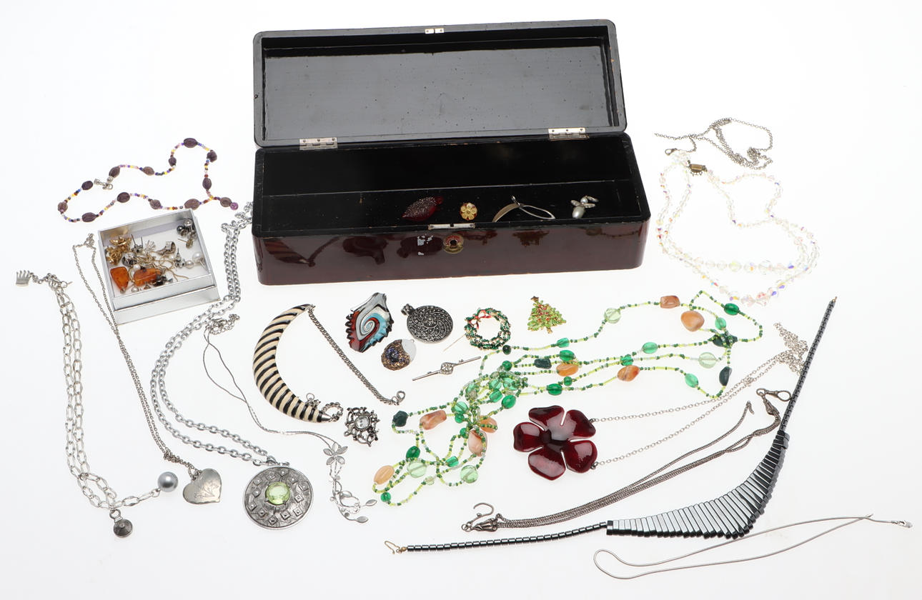 Necklace, including green glass beads & agates, tangled. Necklace, hematite, length approx. 42 cm. Watch chain, silver, length approx. 32 cm, weight approx. 15,6 grams. Earrings. Total weight of parts in silver about 30 grams. Ash, lacquer work, approx. 30,5x10,5x7,5 cm. Condition Variable wear. Several broken parts. 138277