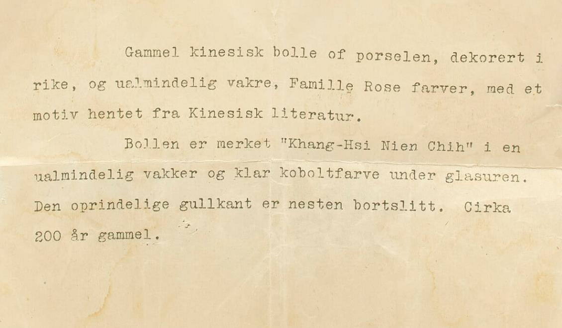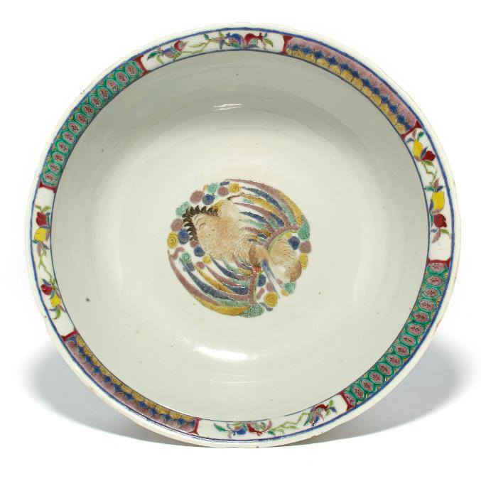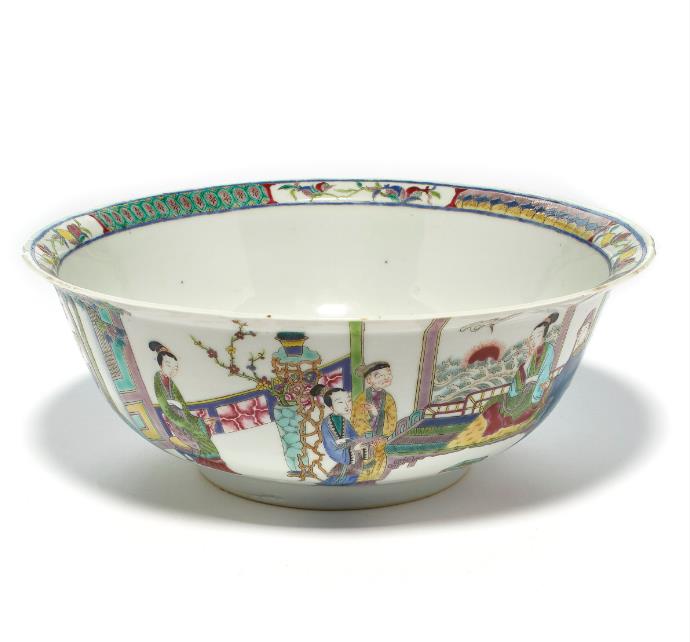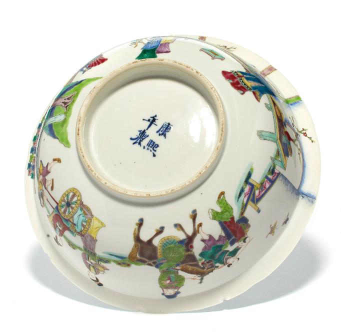 Height 9.5 cm Diameter 25.5 cm Bowl standing on high foot with unfolded, flower-shaped mouth. Hand-painted décor in polychrome enamel colors with ruby red (inspired by imperial phalangcai ware). The outside depicts a continuous figure scene. The inside depicts a phoenix in the center. Rich table on the wide mouth with stylized plants and branches with fruits. Four-character apocryphal Kangxi badge under the bottom in cobalt blue. Age-related wear and tear. Four edge bites, one with an associated crack (about 1 cm), as well as some minimal edge bites.