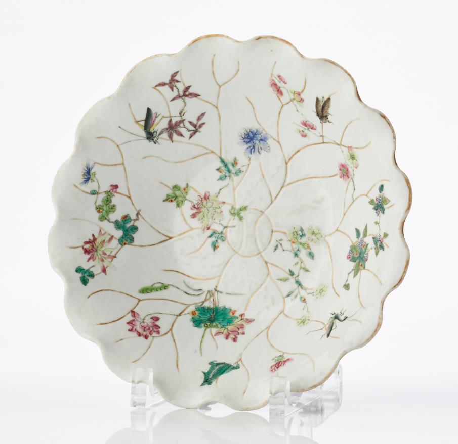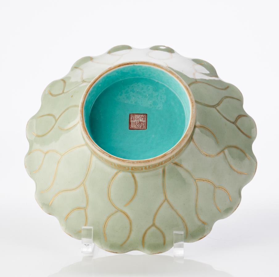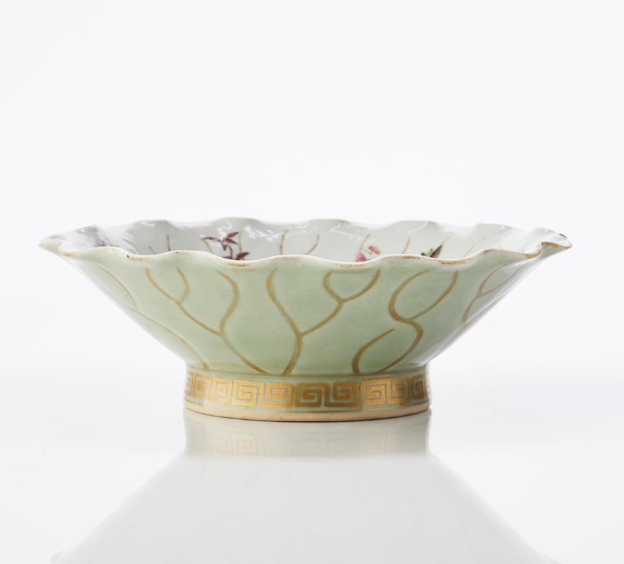 Bowl Porcelain. China, mark and period of Daouguang (1821–1850). Lotus shaped with external celadon glaze and gilt decoration, interior decorated with insects, peonies and famille rose flowers. H 8 cm, Ø 25 cm (approx). CONDITION REPORT Wear and tear. Scratches. Occasional minor edge nicks. 78999