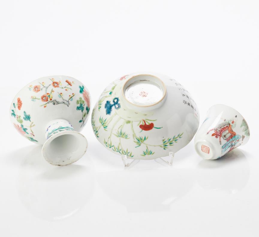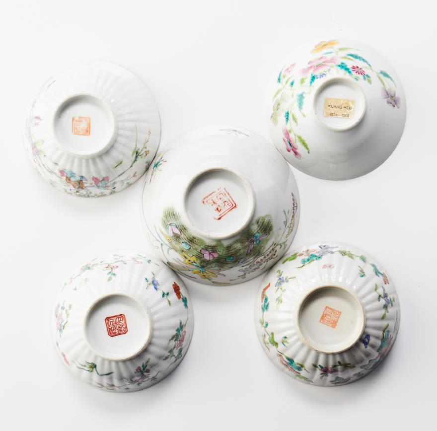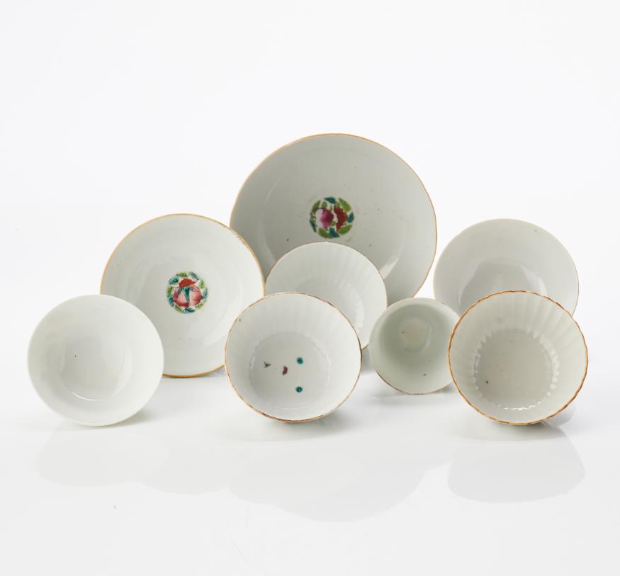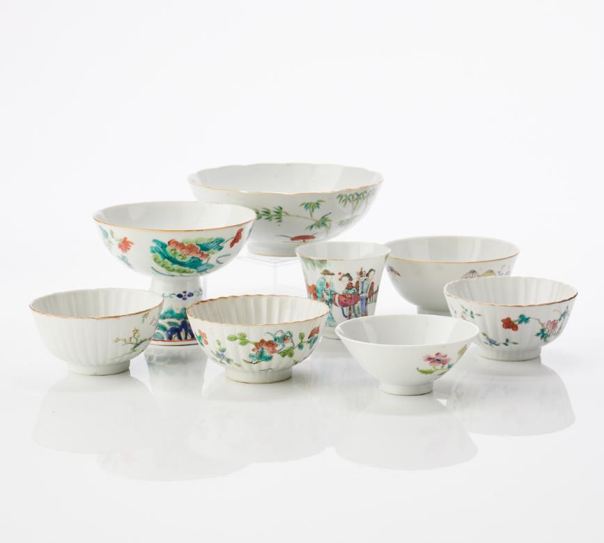 bowls, eight pieces Porcelain. China, late Qing (1644–1912). Decoration of figure scenes in garden landscape and flowers in famille rose. H 4.5–10.2 cm. CONDITION REPORT Wear and tear. Three bowls with nag. A bowl with crack. 78999
