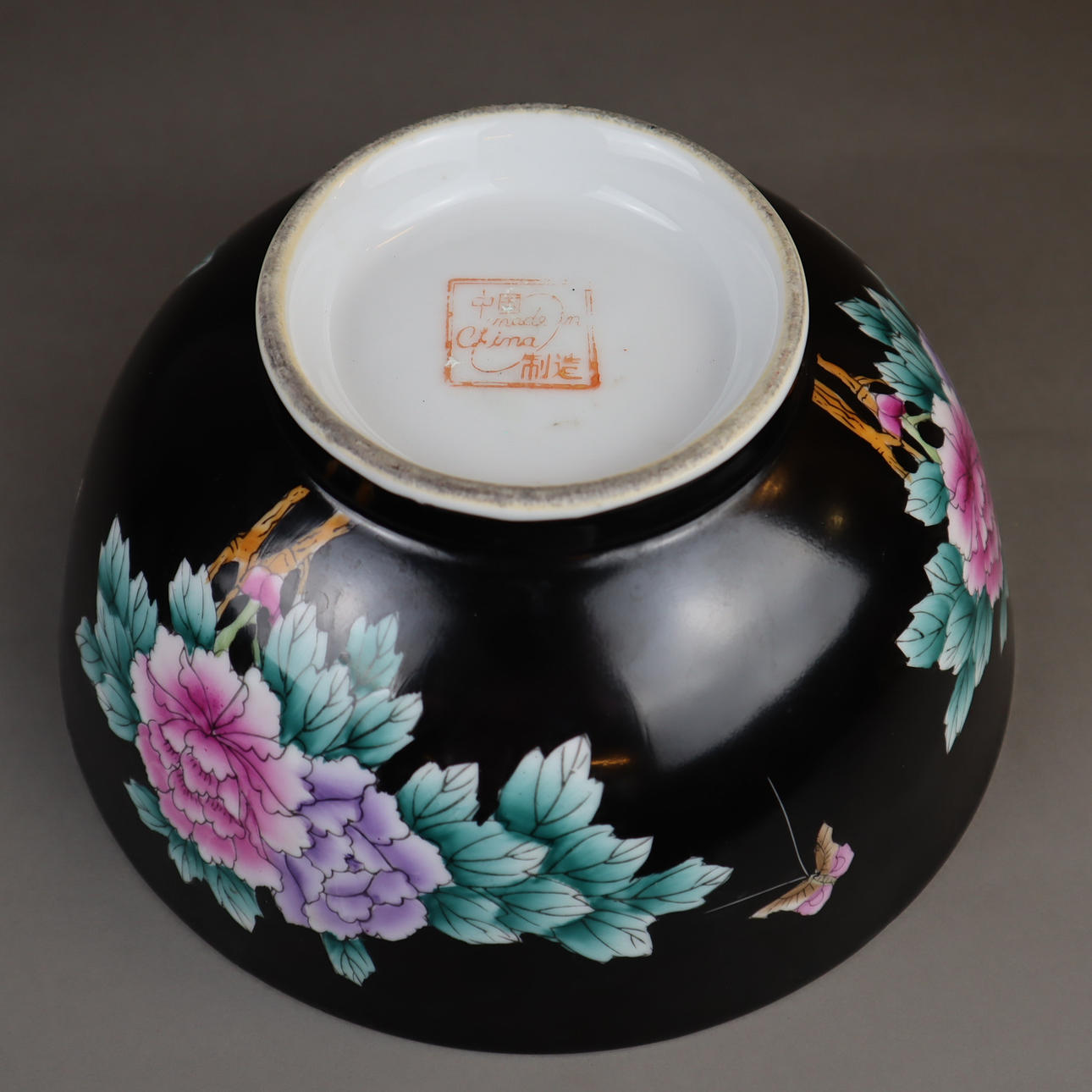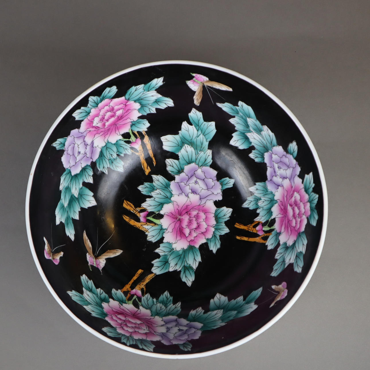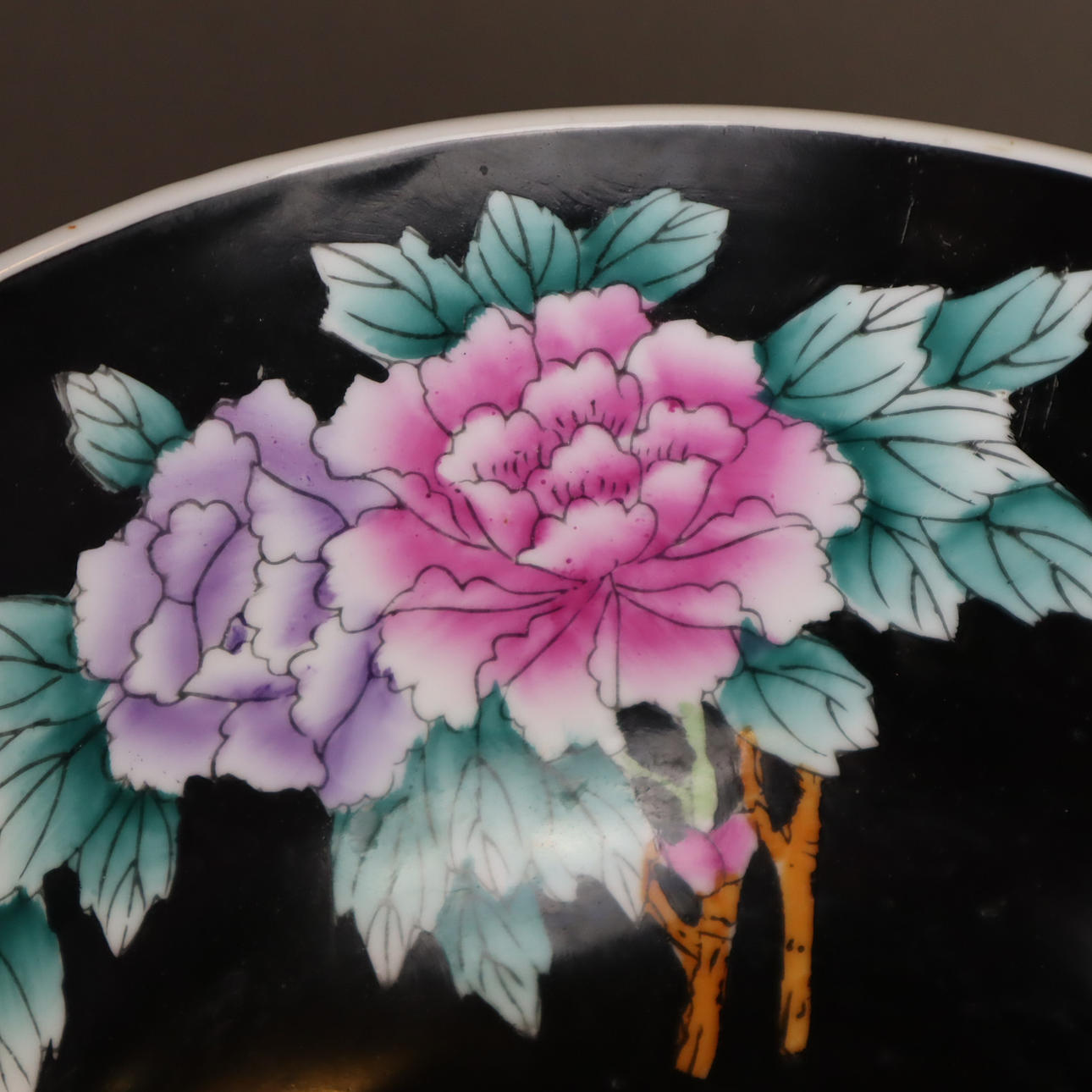 Black background with peony painting and depictions of butterflies in enamel colors, h./dm.ca.11.5/25cm. Fitness report good condition with minor signs of wear. 20180