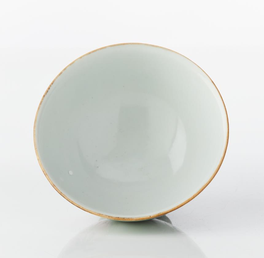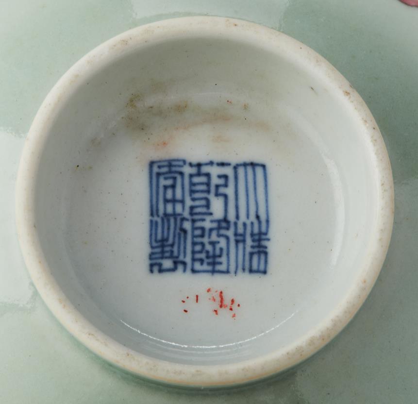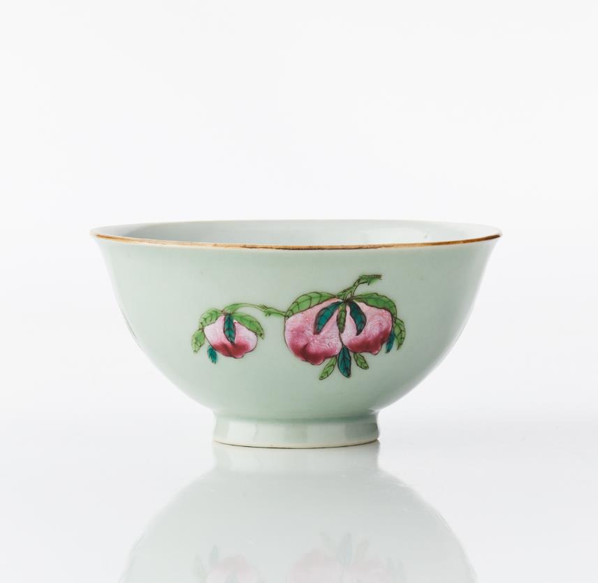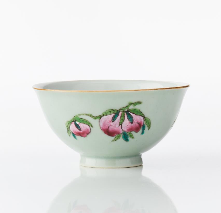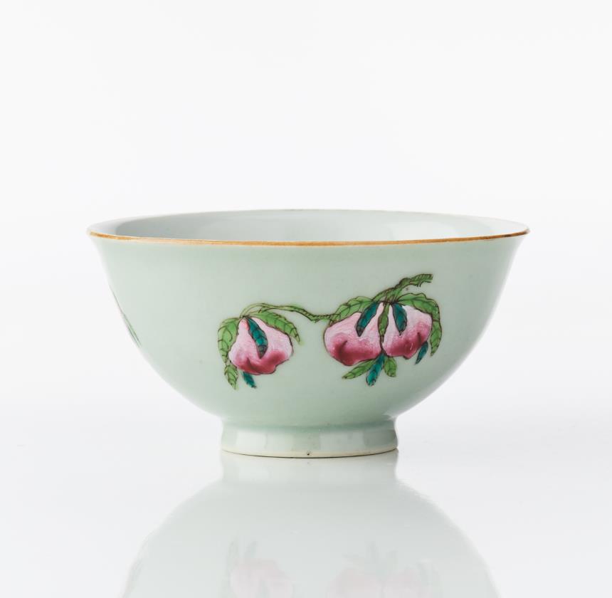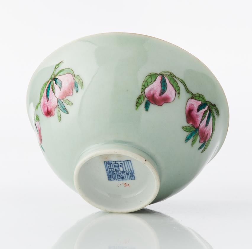 Celadon glazed with décor of peaches in famille rose. Seal mark of Qianlong in blue and white underglaze. H 5.7 cm, Ø 11.7 cm. Condition report Minor wear. A very small and insignificant chip.