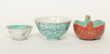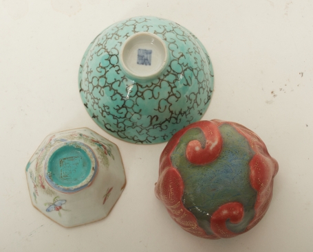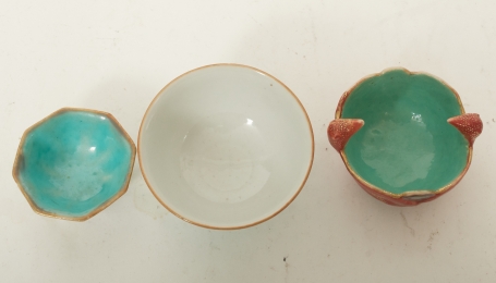 3 parts, diam. 6.5 - 9 cm, wear and tear, largest bowl with hair crack, smallest with edge chips.