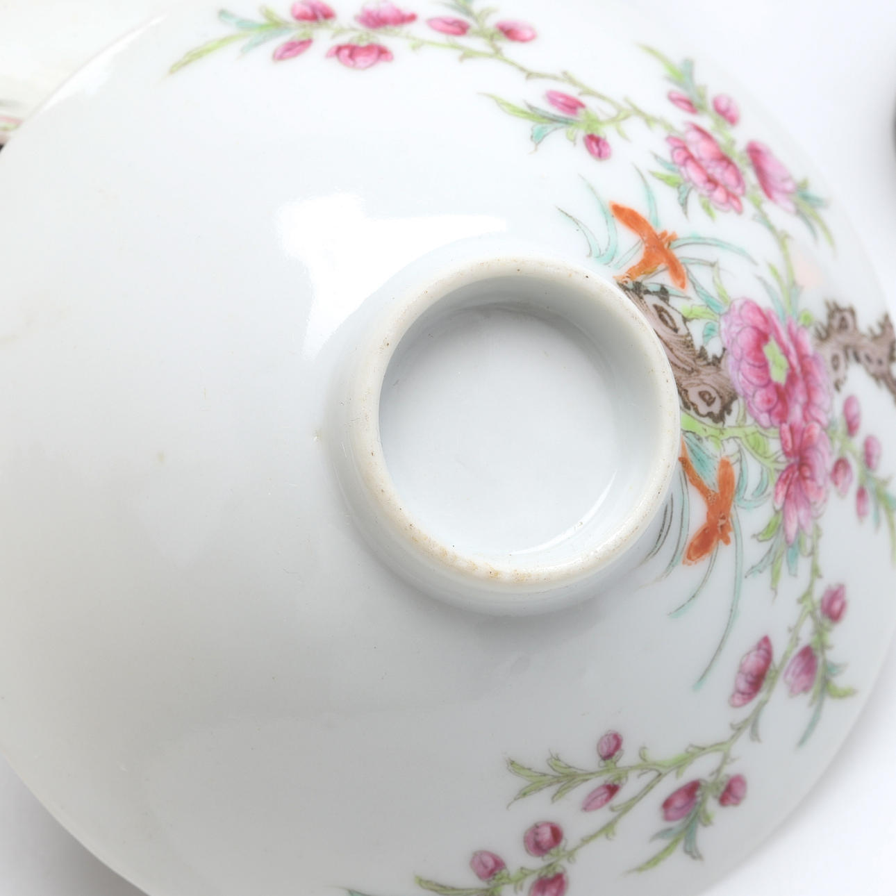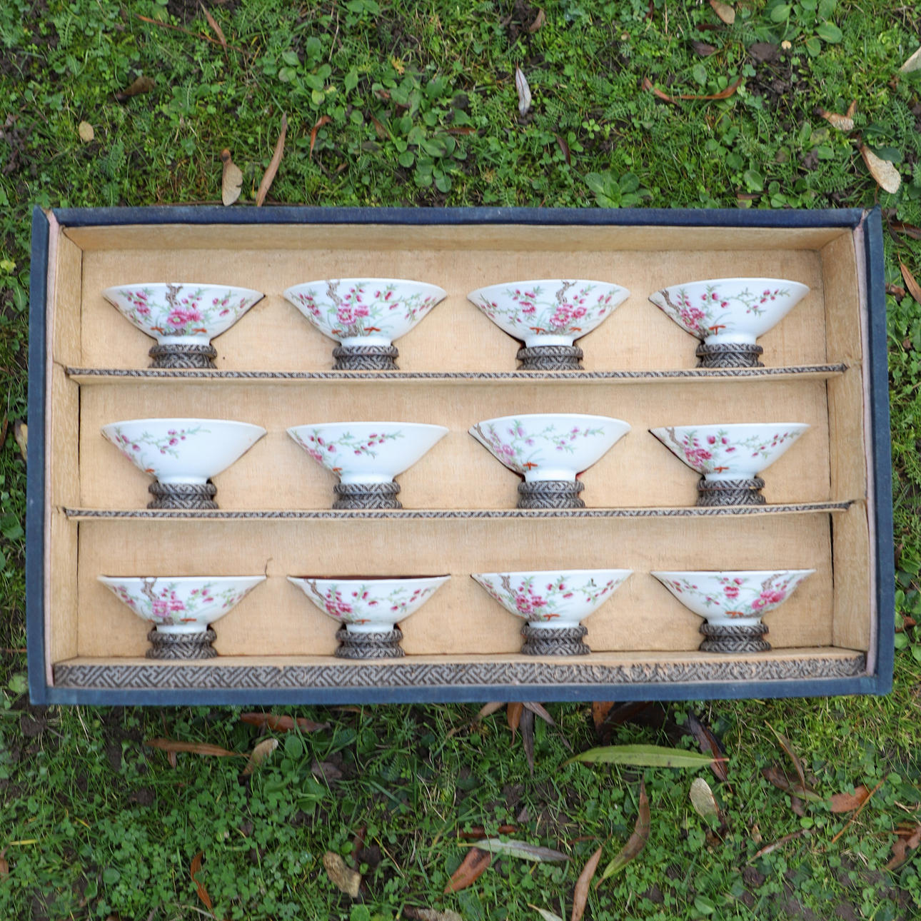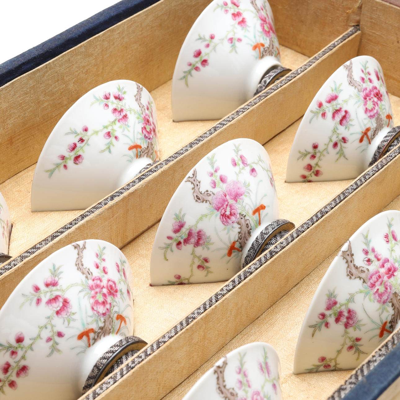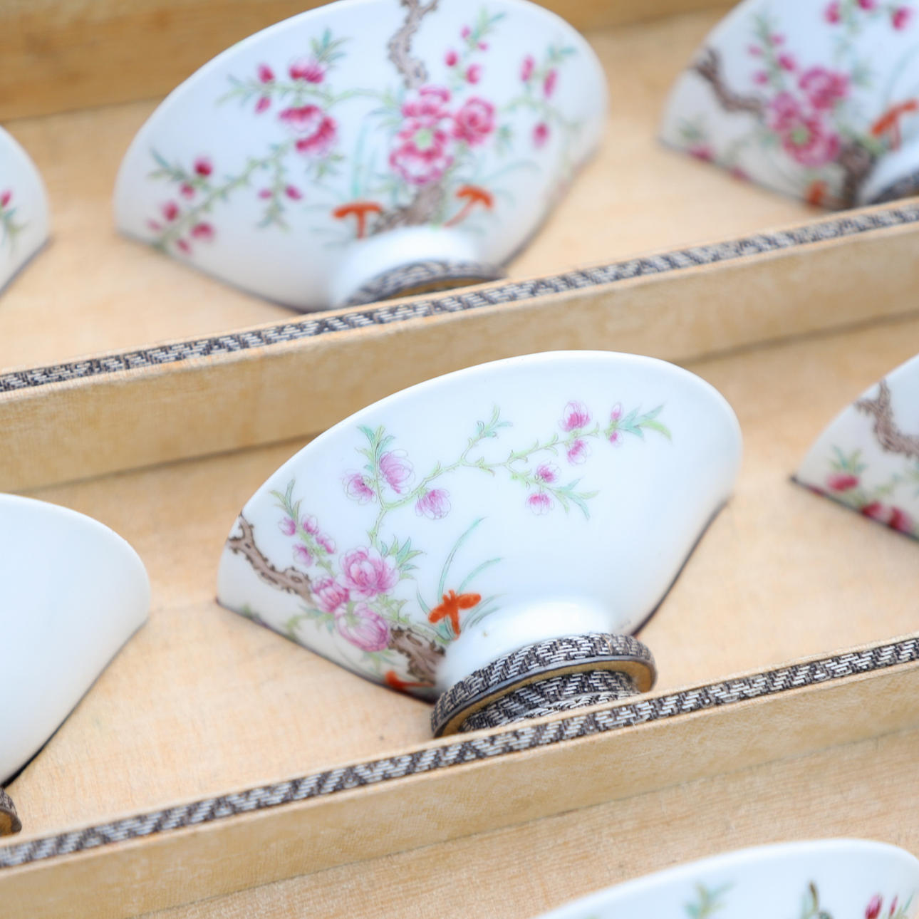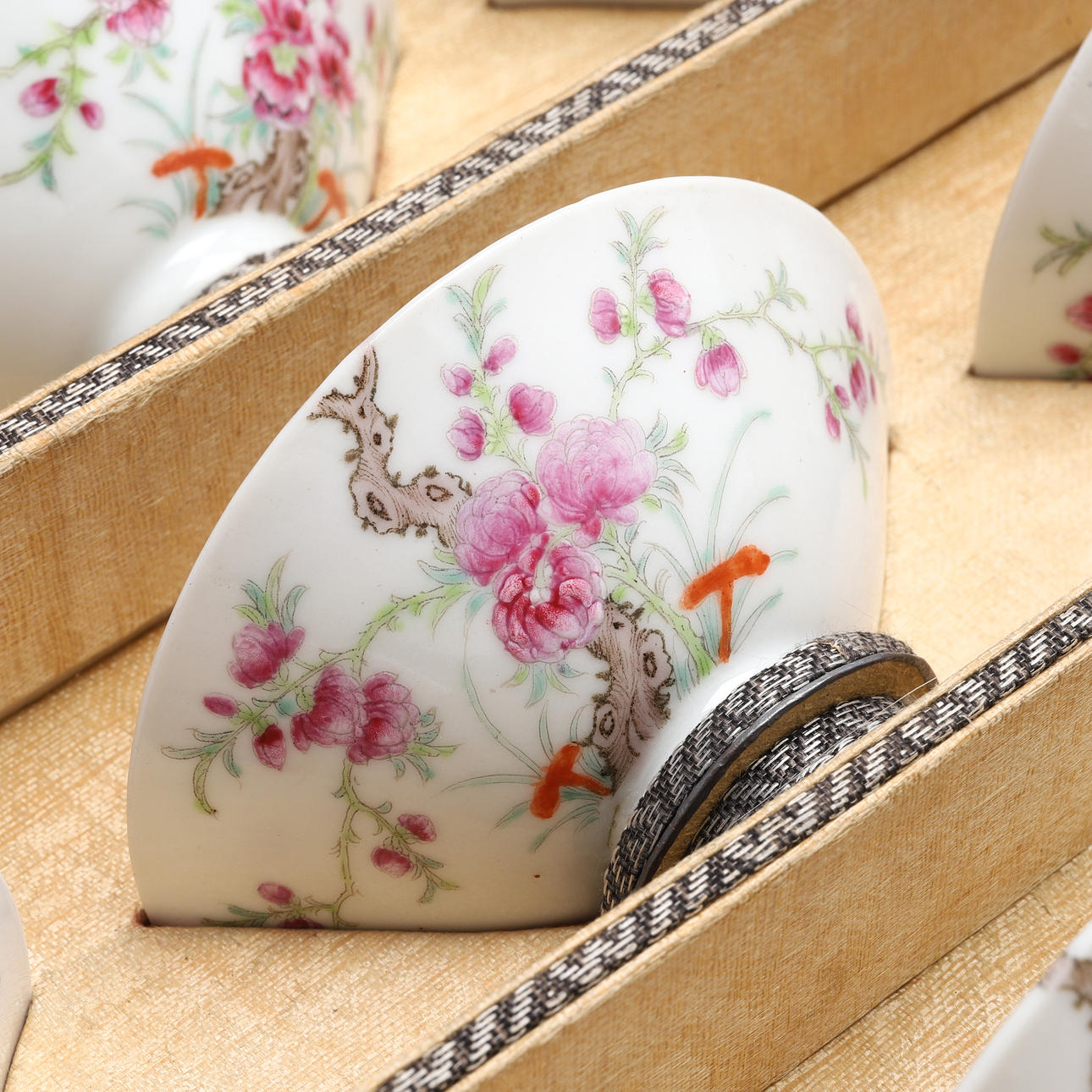 Decor in famille rose. Diameter 3.9 cm. Height 3 cm. Case with glass top. 44x26x12 cm. Condition Insignificant wear and tear. Manufacturing defects.