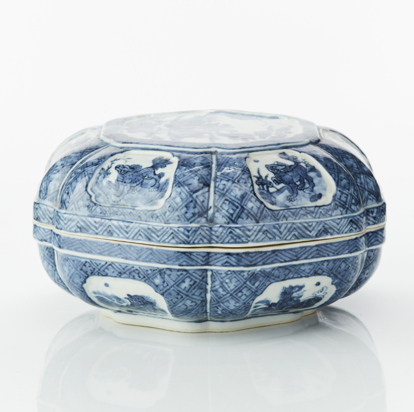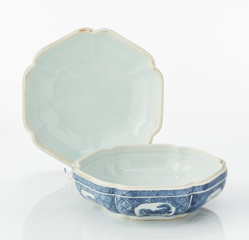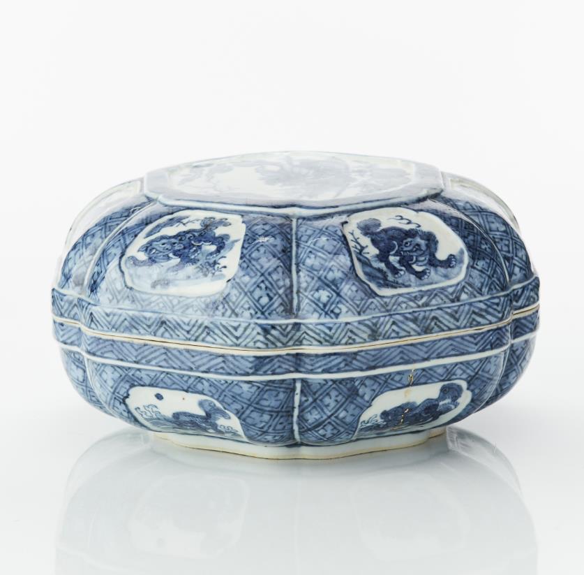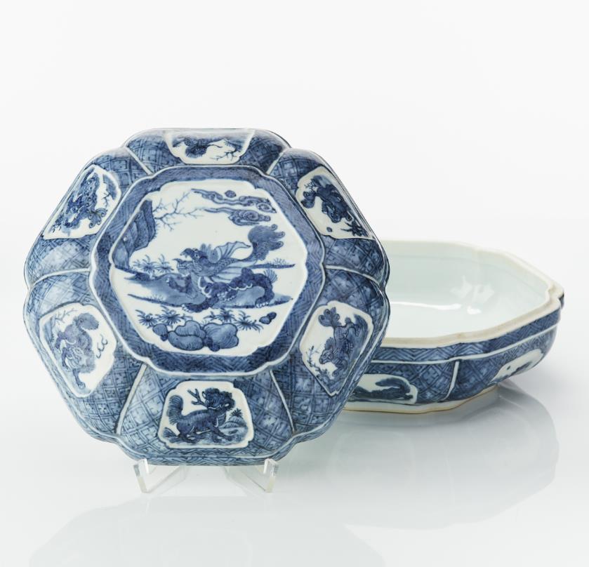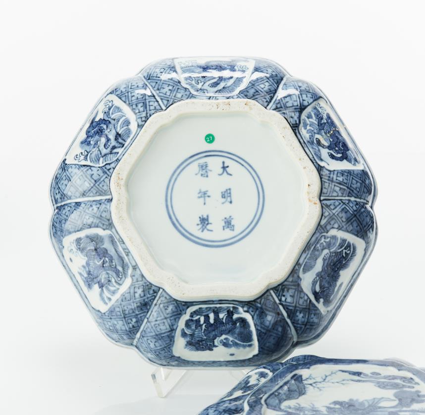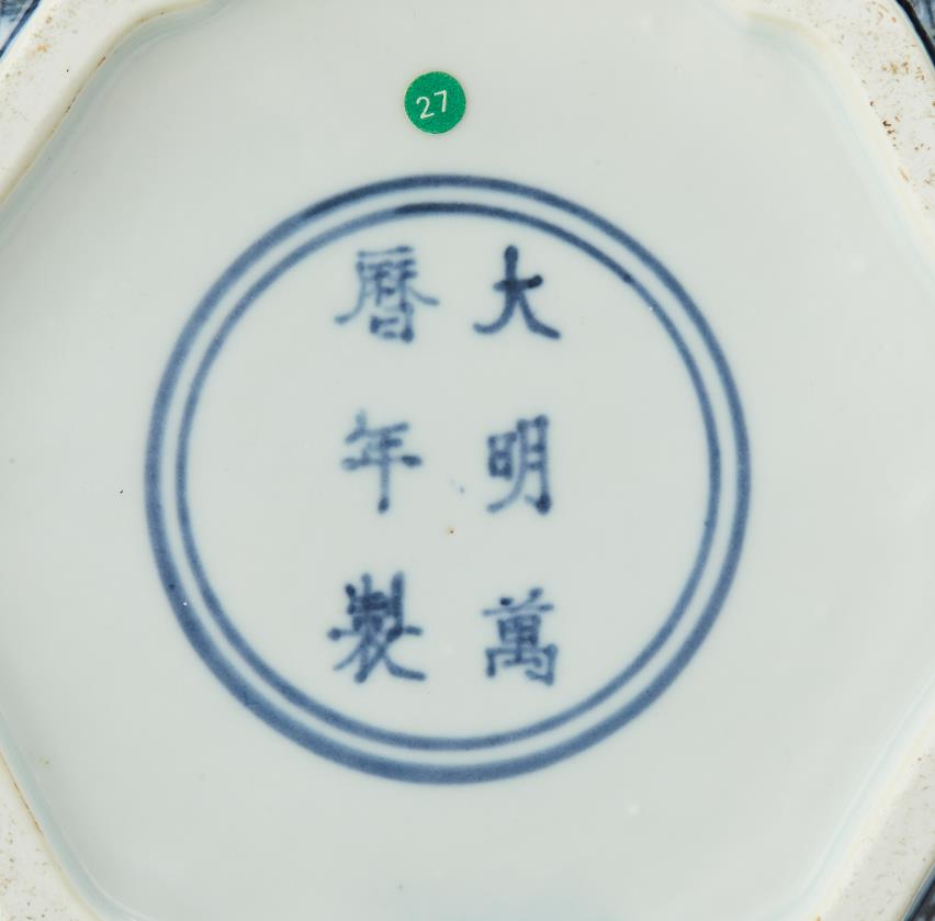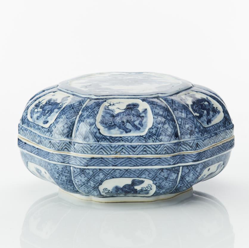 Decoration of fabulous animals in blue-and-white underglaze. Six-character badge by Wanli. H 10.7 cm, Ø 21 cm. Provenance A Swedish private collection, thence by descent. Condition report Minor surface wear. Crisp. Insignificant firing defects.
