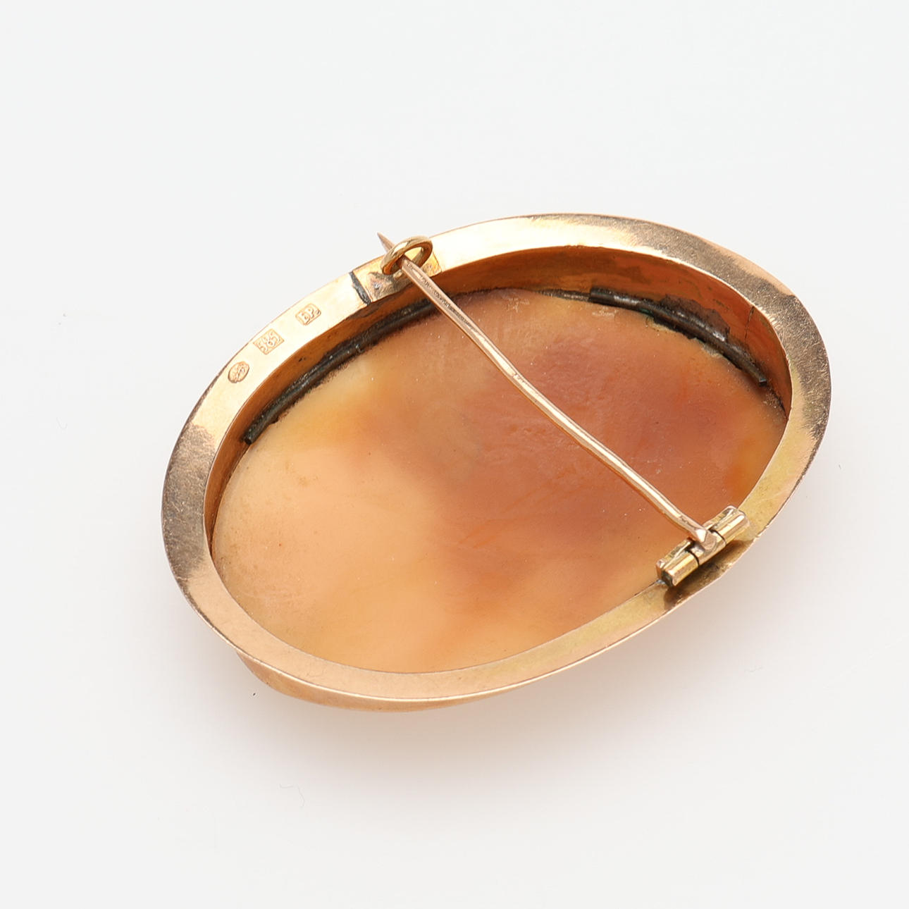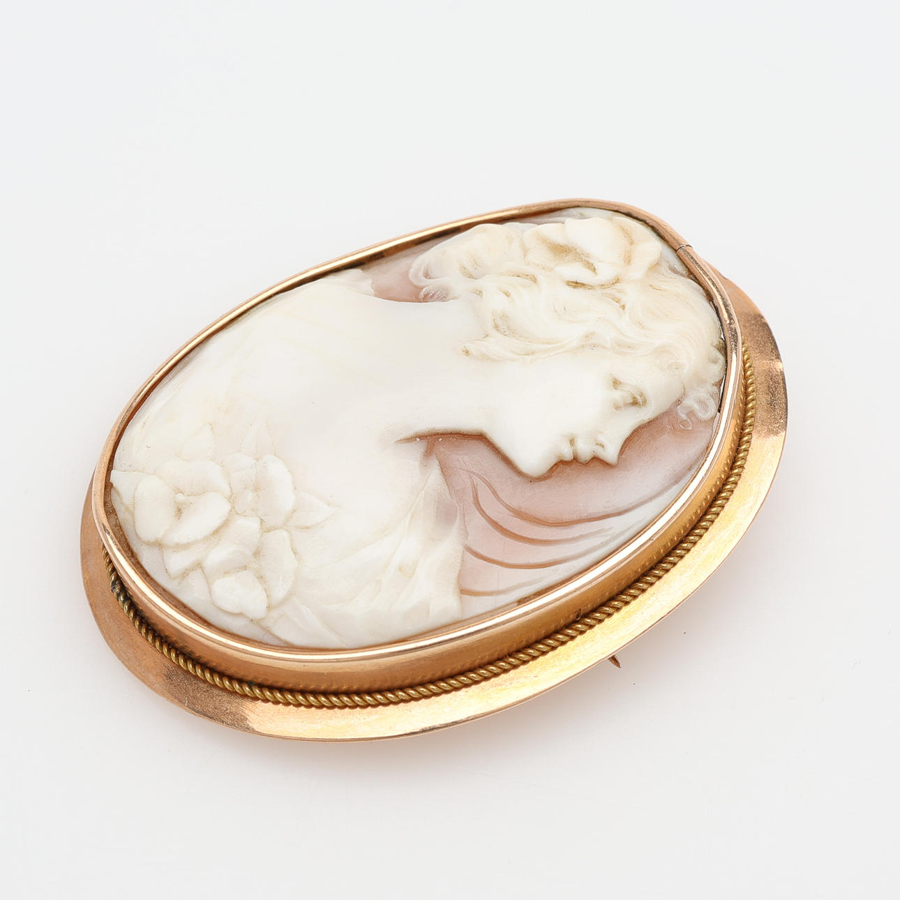 Shell camel with cut out female representation, set in 14k gold with Estonian stamps, height 55 mm, weight 14 grams. Condition Normal wear and tear. 123435