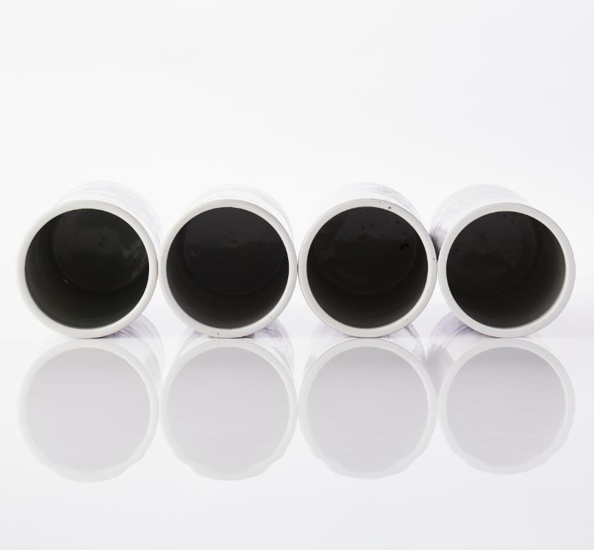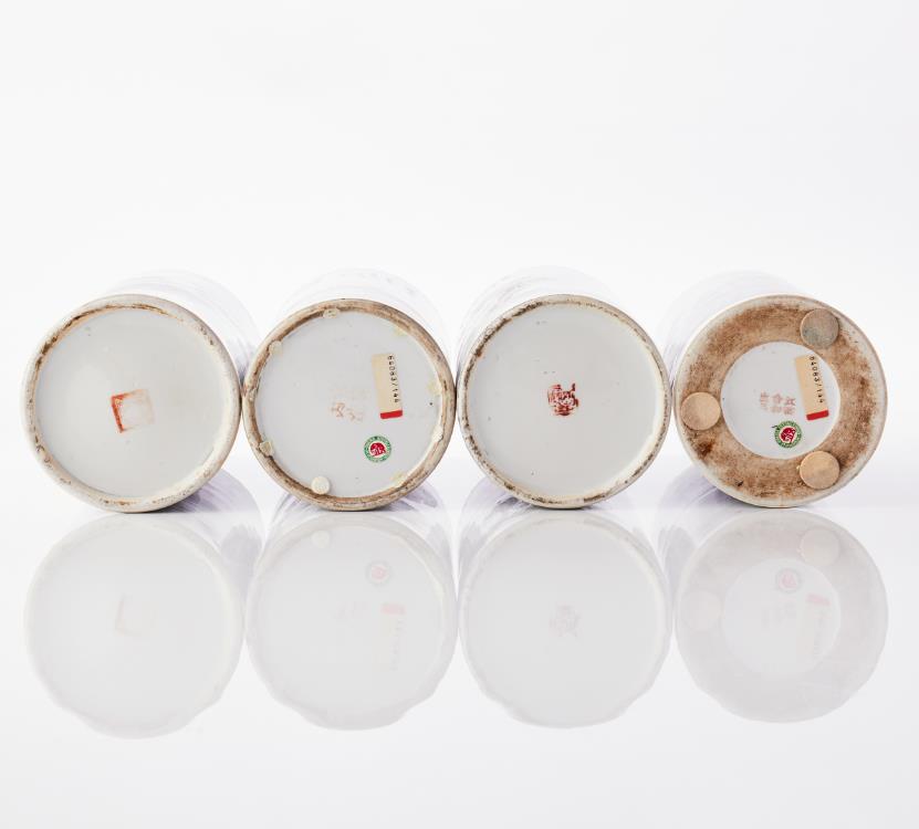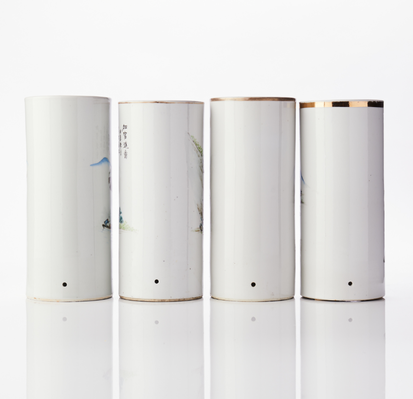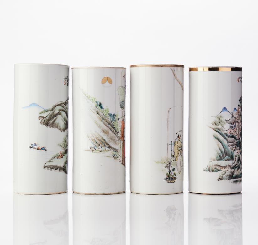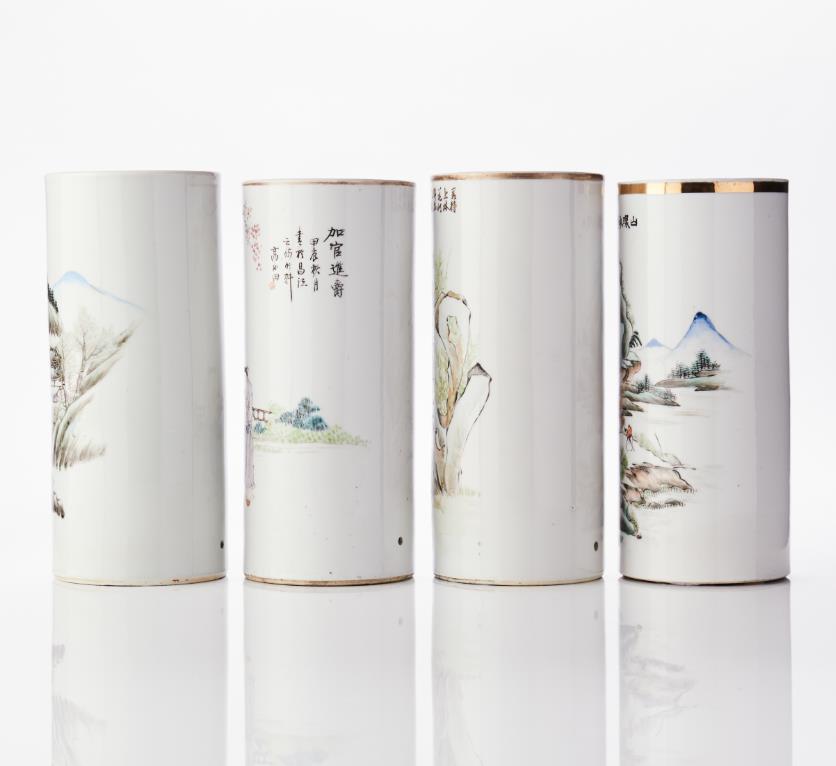 Brush cases, four pieces of porcelain. China, Republic (1912–1949). Decoration of riverscapes and figure scenes in garden landscapes in enamel colors and qianjiang and calligraphy. H 27.5–28 cm. CONDITION REPORT Wear and tear. Minor nags. All with drilled holes for lamp cords, previously mounted as lamps.