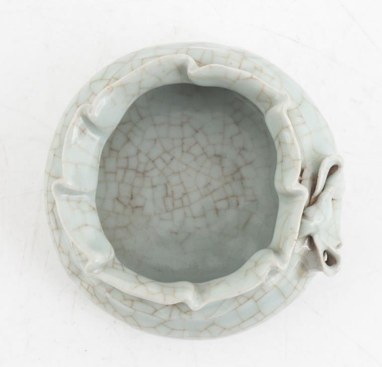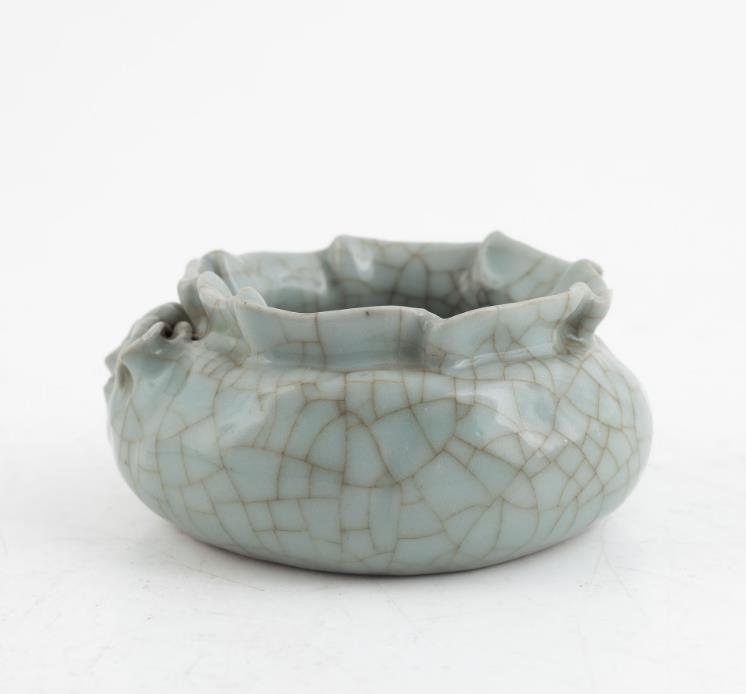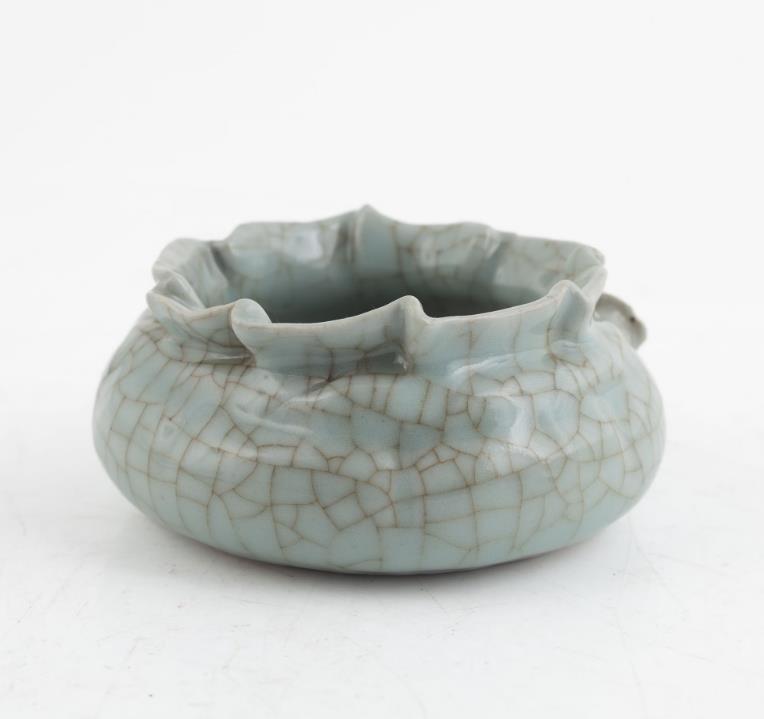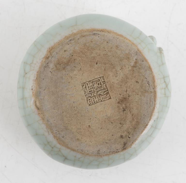 Rosette decorated glazed vessel. Diameter widest part 10.2 cm. Wear and tear.