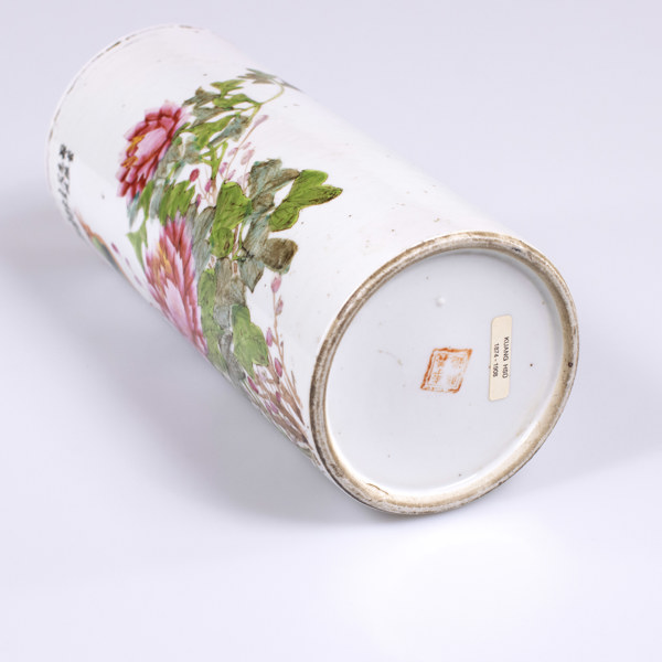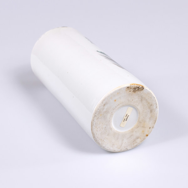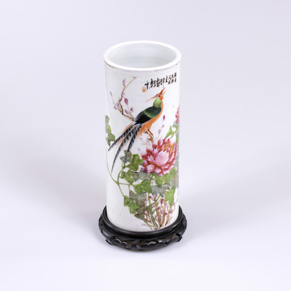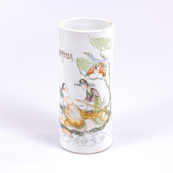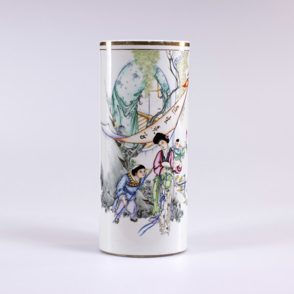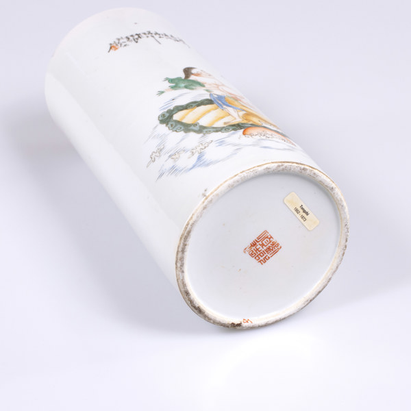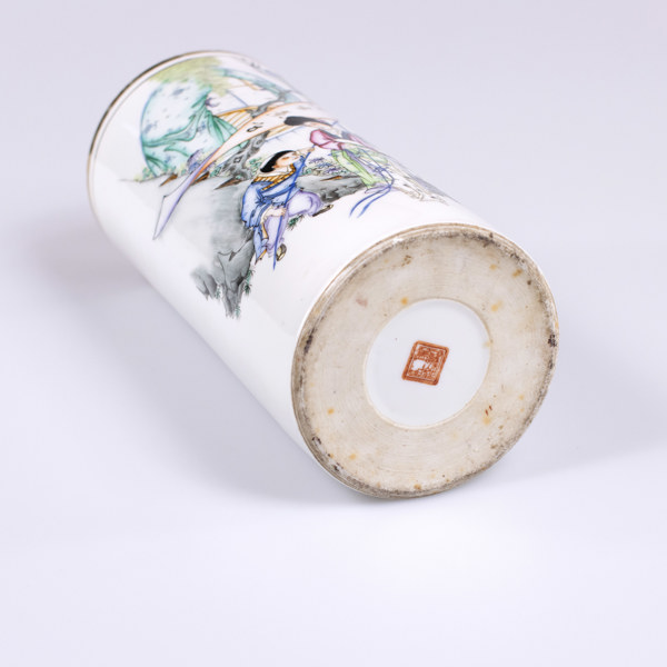 Brush cases, 3 pcs, porcelain, decorated with figure scenes, China, two vases stamped with square stamps, height approx. 29 cm, comes with wooden stand Condition: Some decorative wear, two vases with minor dents on the inside mouth