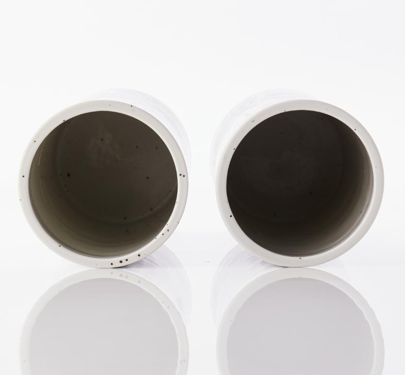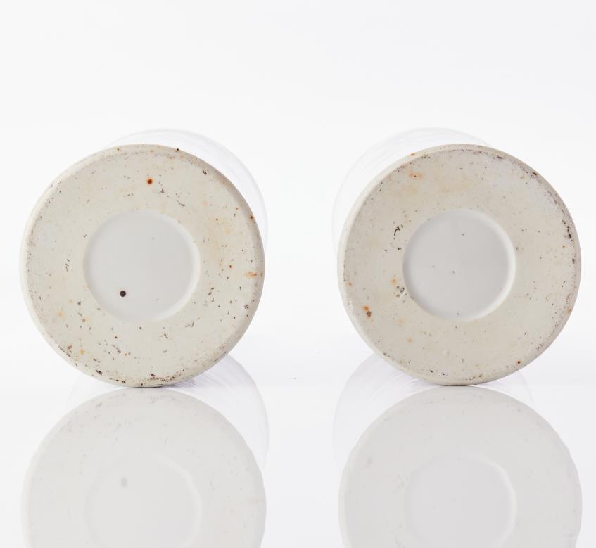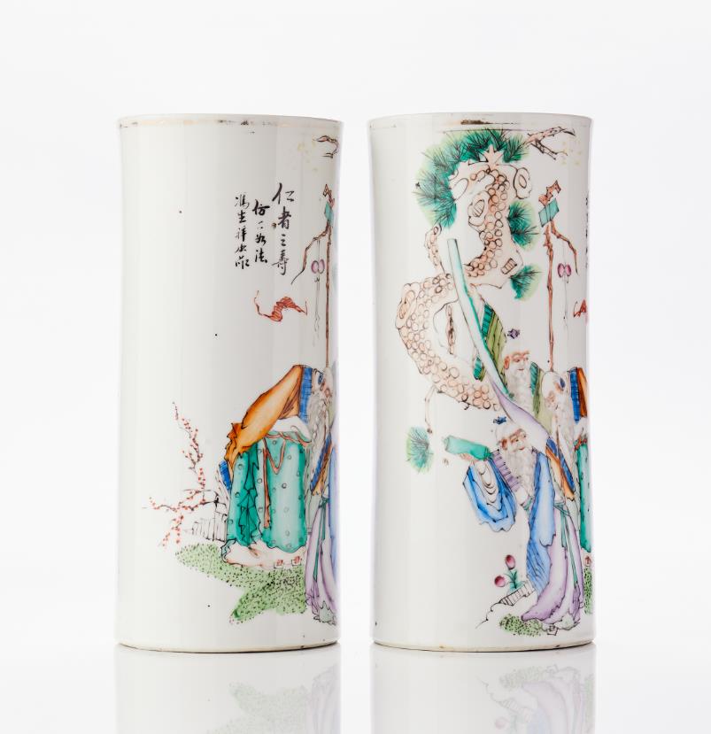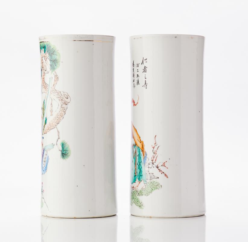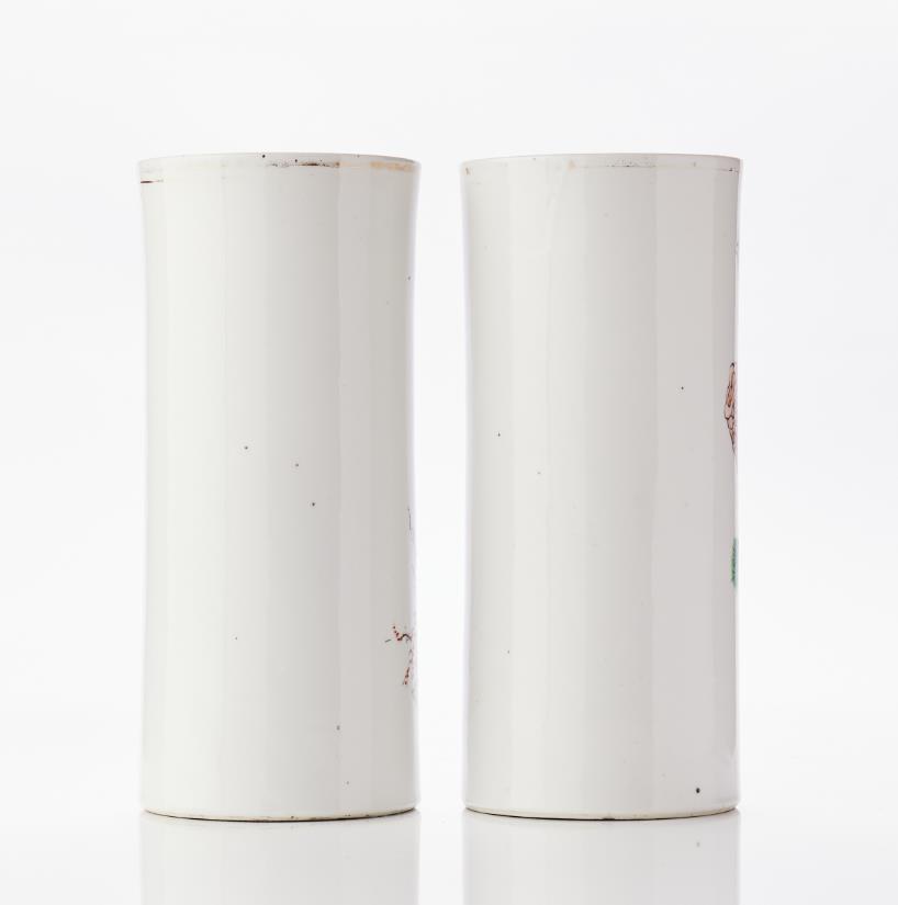 Brush cases, a couple of porcelain. China, early 1900s. Paired décor of figure scene in garden landscape in famille rose as well as calligraphy and gilding. H 27.5 cm. CONDITION REPORT Wear and tear. Insignificant burning defects.