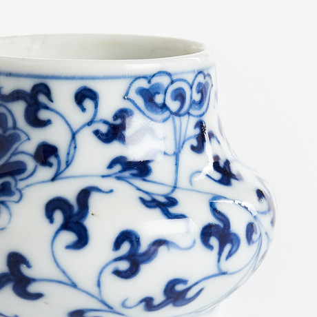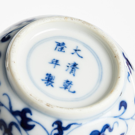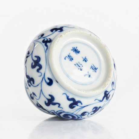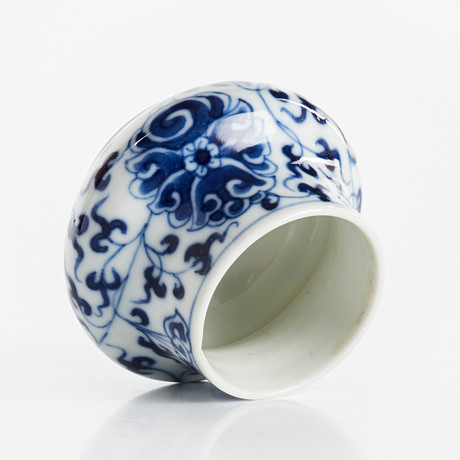 lotus decoration in blue-white underglaze, mark of Qianlong. Height: 4 cm, diameter: about 6 cm. Fitness report Minor wear, small muzzle chip. Provenance: Hans Olwaeus (1929–1998). He worked as a diplomat at the Ministry of Foreign Affairs in Stockholm, Sweden. In the 1950’s and 1960’s he worked in China and Japan, during which time his collection grew. By traveling around the world he was able to collect and bring back high quality porcelain, bronzes, snuff bottles and textiles. In the 1970’s and 1980’s his work continued mainly in France and Denmark. 67270