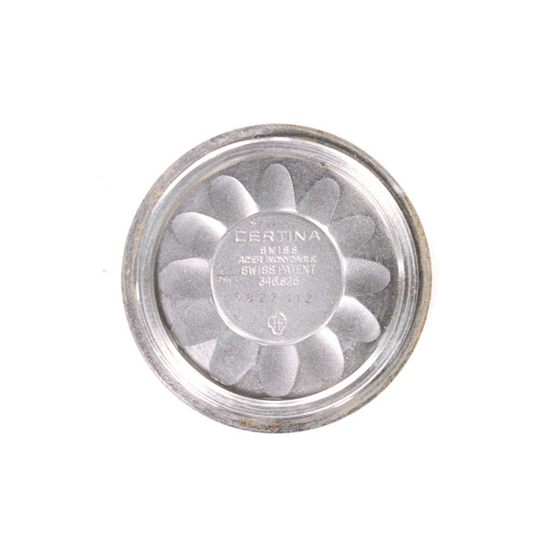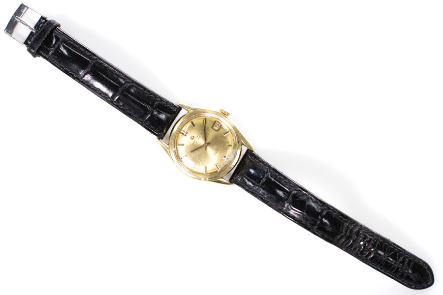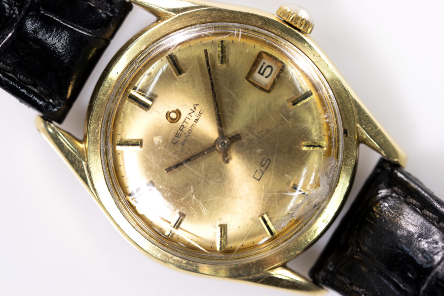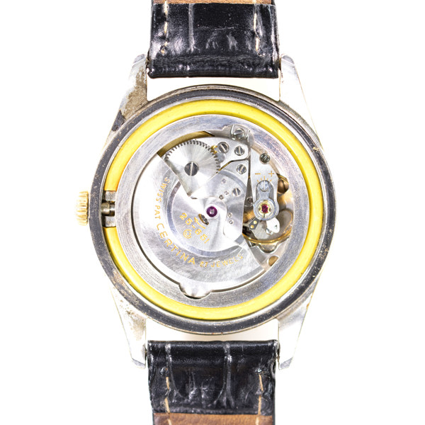Case Approx. 36 mm excl. crown (45 mm lug-to-lug), gold on steel, screw case, signed crown, plexiglass Dial/Hands Gold-tone dial with applied gold-tone bar indices with black inlays, 3 o'clock date display, gold-colored hands with black inlays Clockwork Automatic, calibre Certina 25-651 Ribbon/link Black leather strap with alligator embossing, 18 mm, not original Serial Number/Case Number 5428282 Condition: Apparently working, harder wear and tear, cracked plexiglass, loose second hand