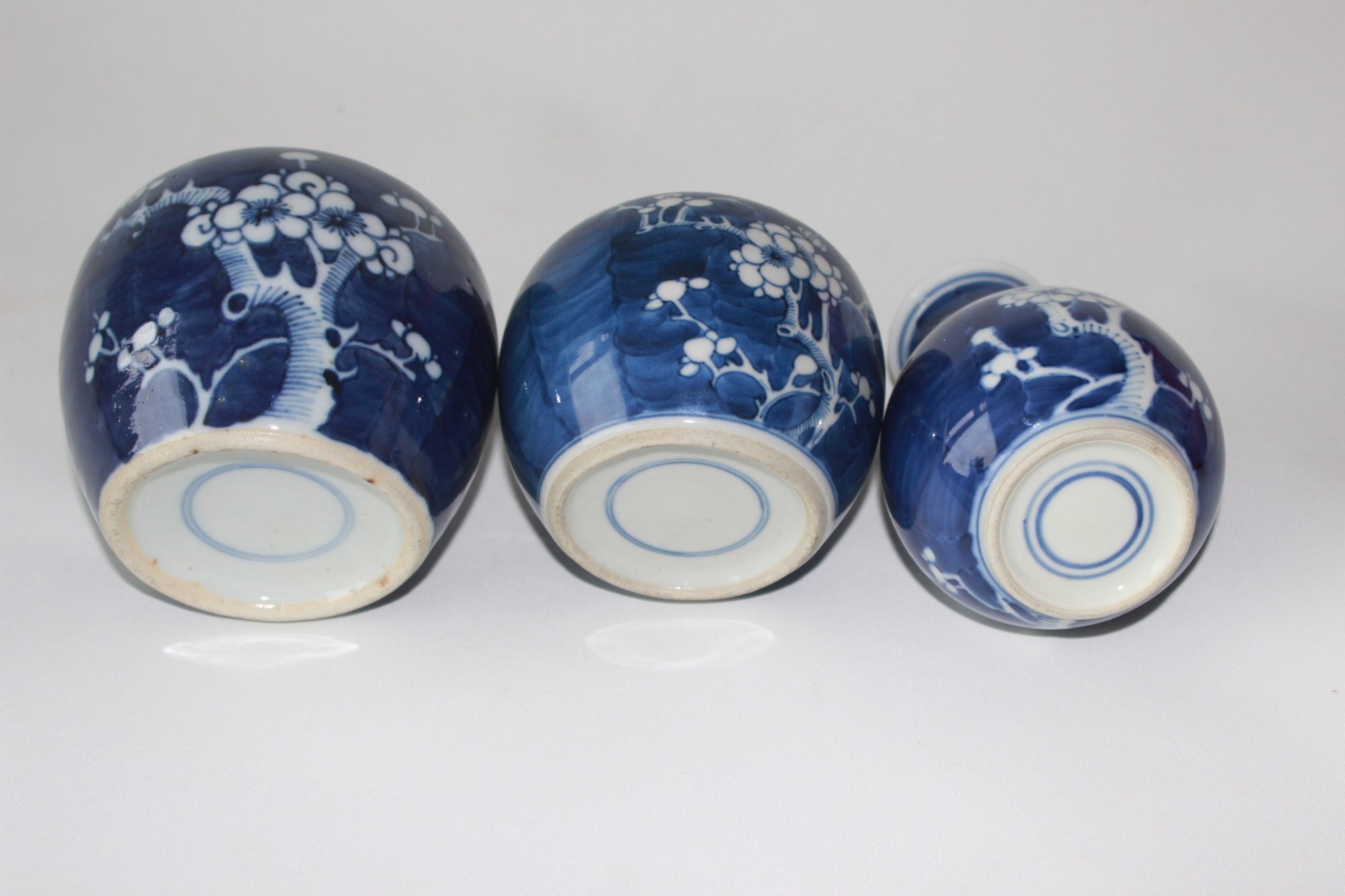 2 beautiful prunusblossom decor ginger jars and 1 vase. All 3 are intact, but 1 ginger jar is missing its lid. Vase is 11.5 cm high, ginger jar without lid is 10 cm high and 10.5 cm wide and the jar with lid is 10.5 cm high and 9 cm in diameter. 33031047