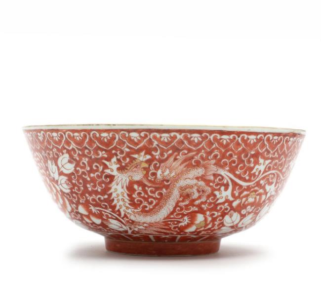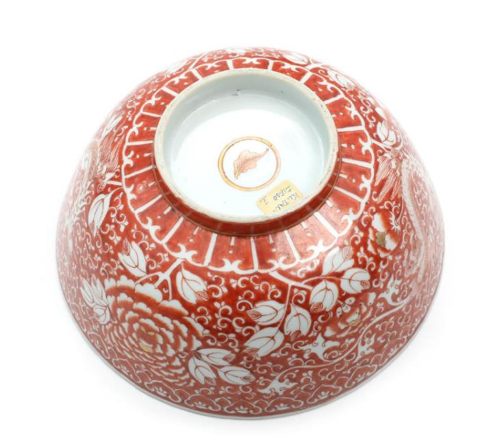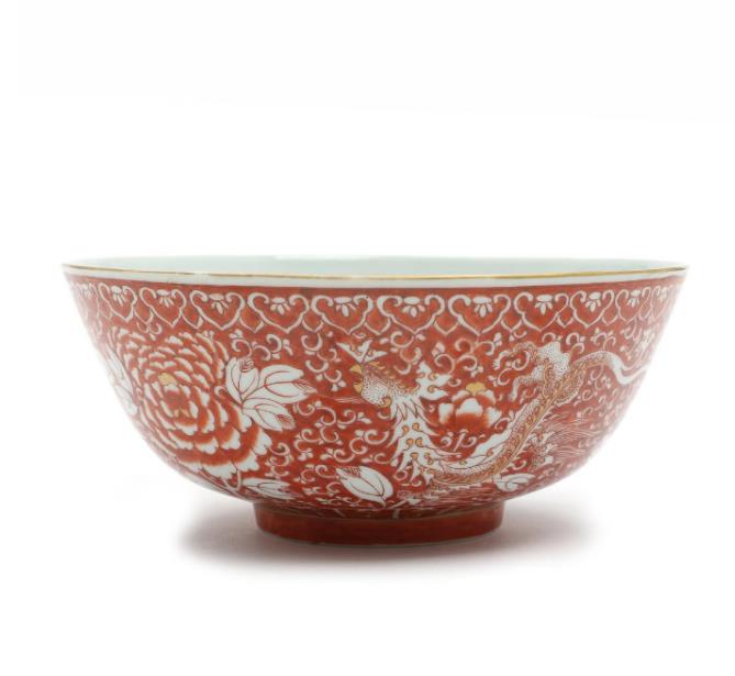 Chinese porcelain bowl decorated in iron red and gold with Phoenix and peonies.
