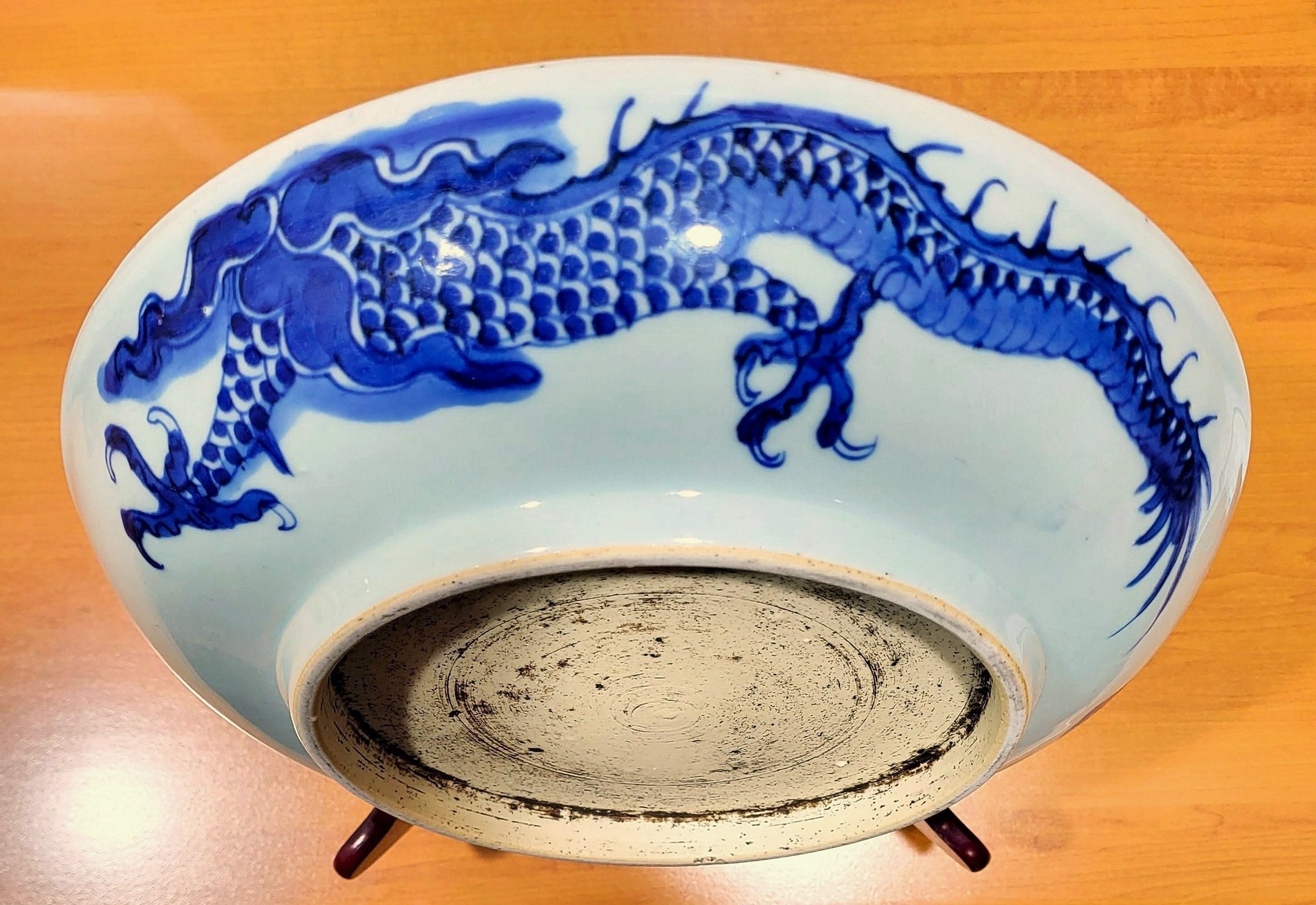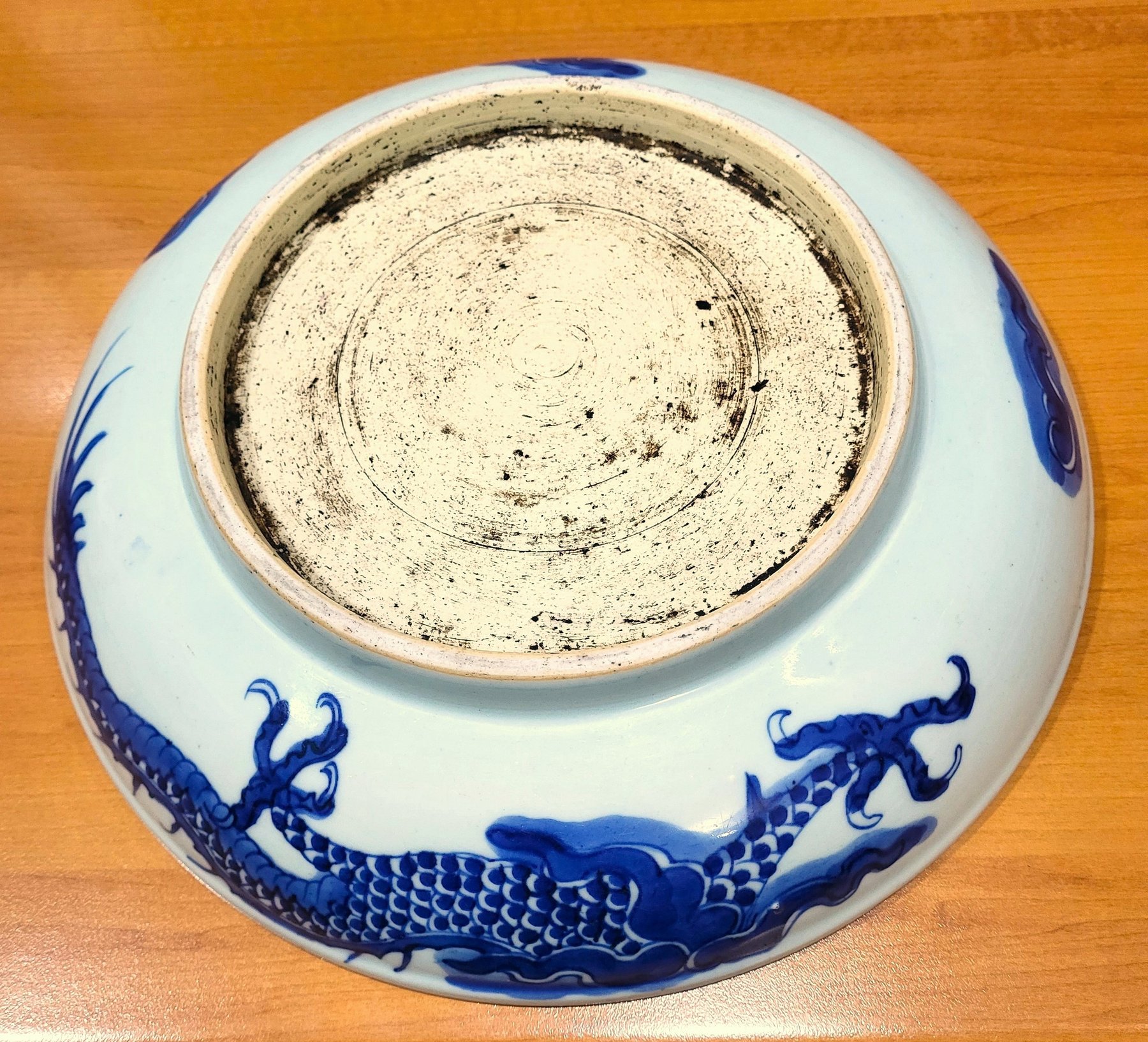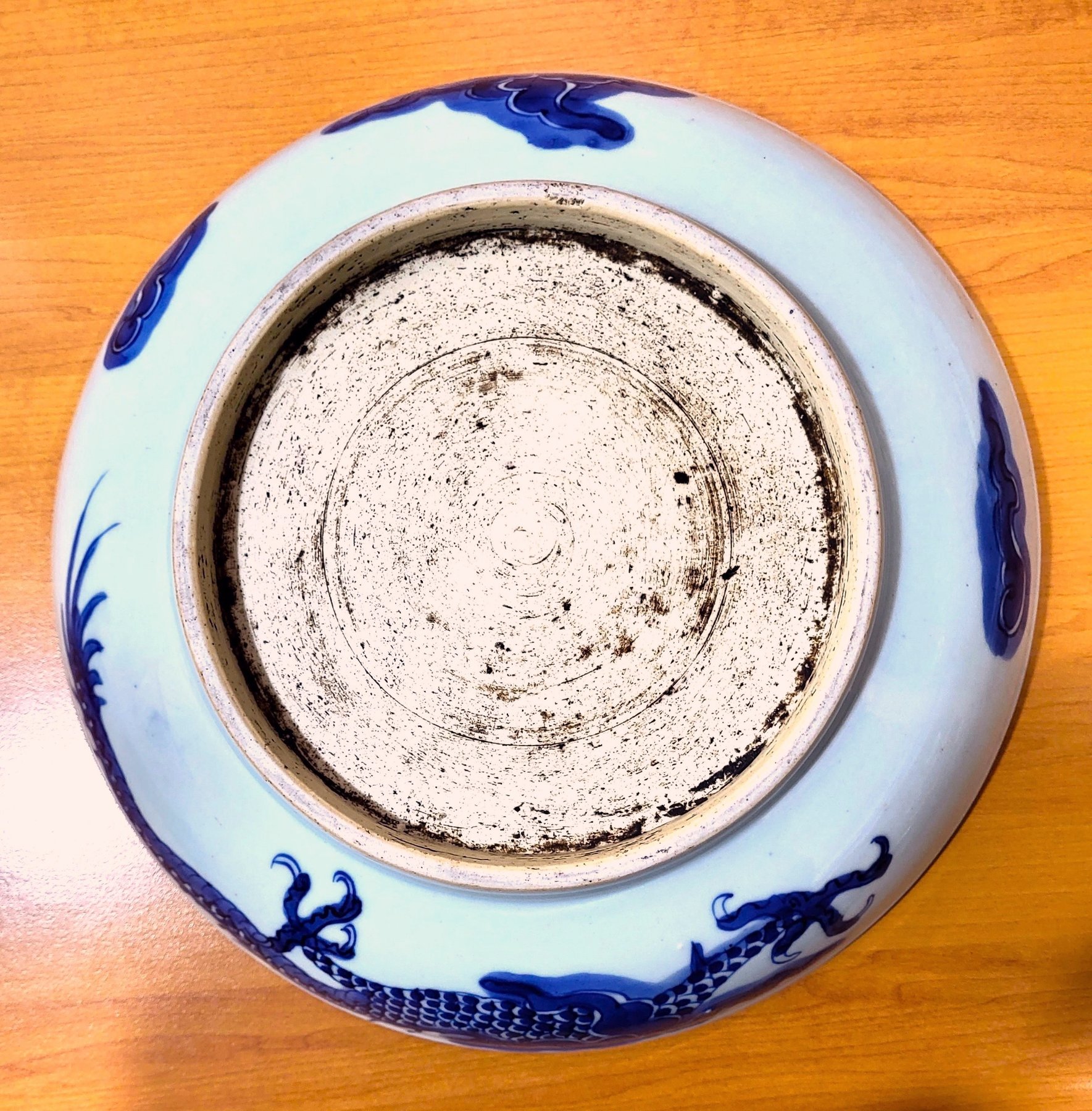 This disc has a diameter of 29.2cm, a base of 18cm and a height of 6.2cm. Wear. Firing defects.