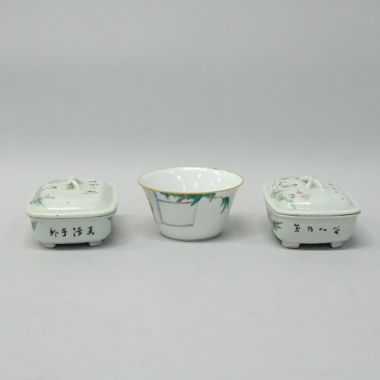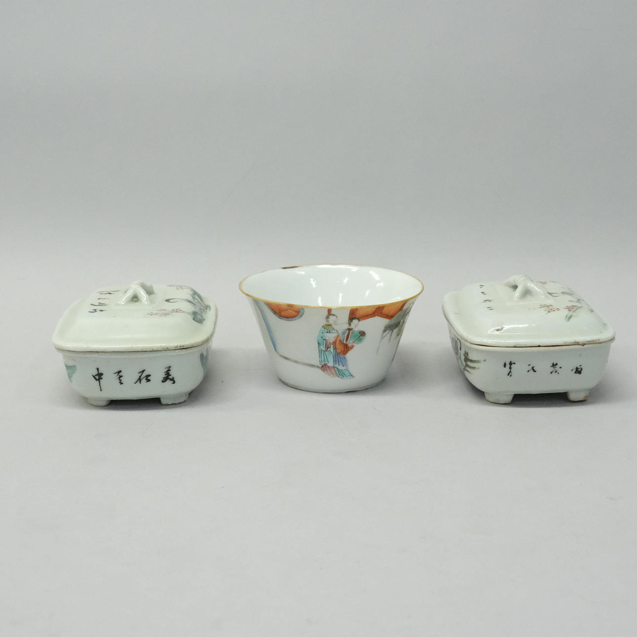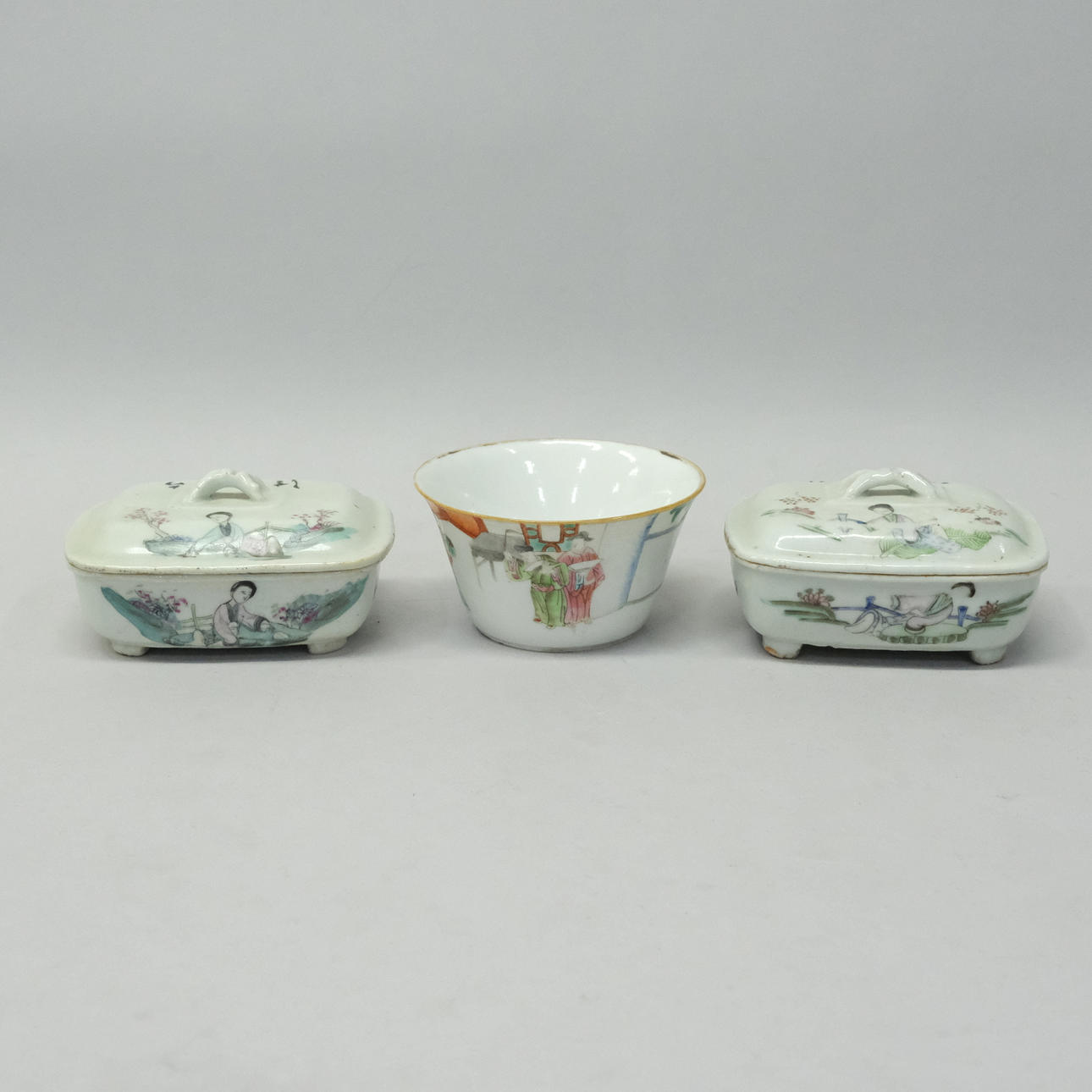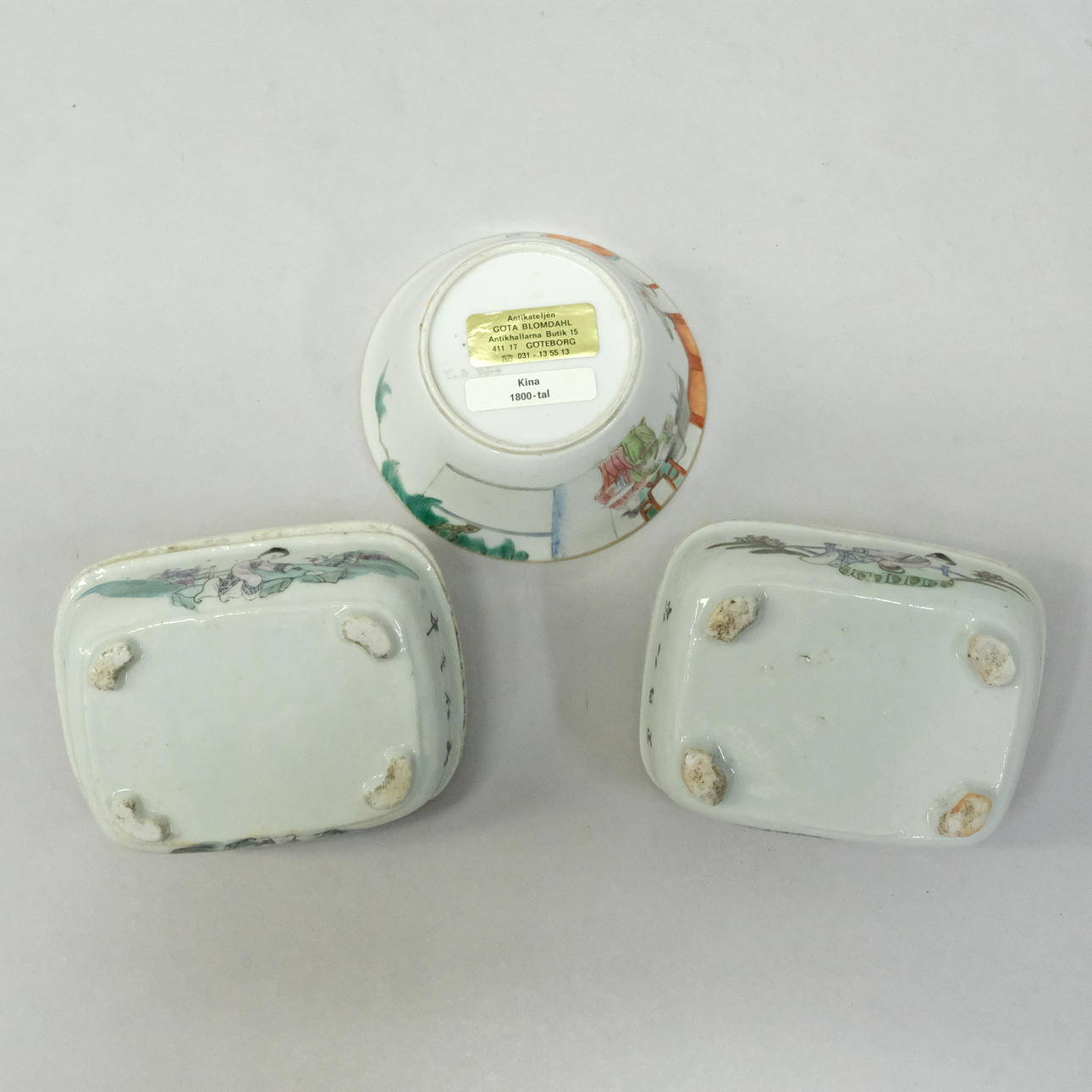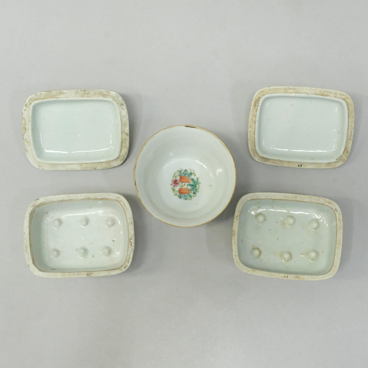 Painted in colours, 19th/20th century: 1 bowl, diameter 10 cm; 1 pair of soap cups, length 10.5 cm; 1 shackle with lid, height 11.5 cm and 2 bowl dishes, diameters 16,5 and 17 cm. Condition Normal wear and tear. 41247