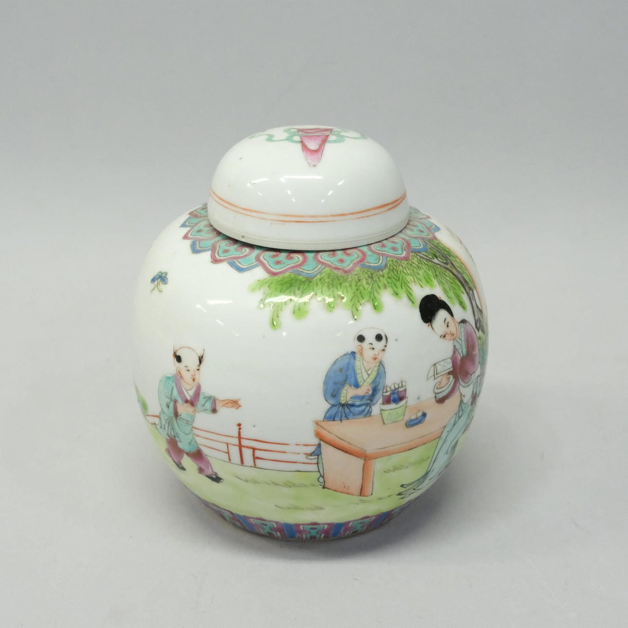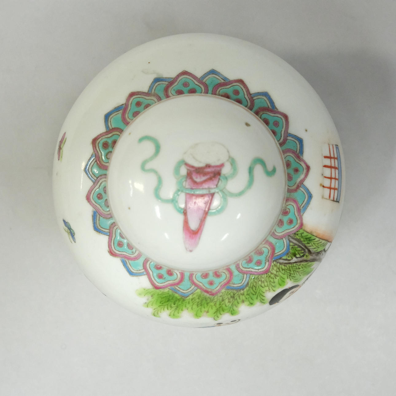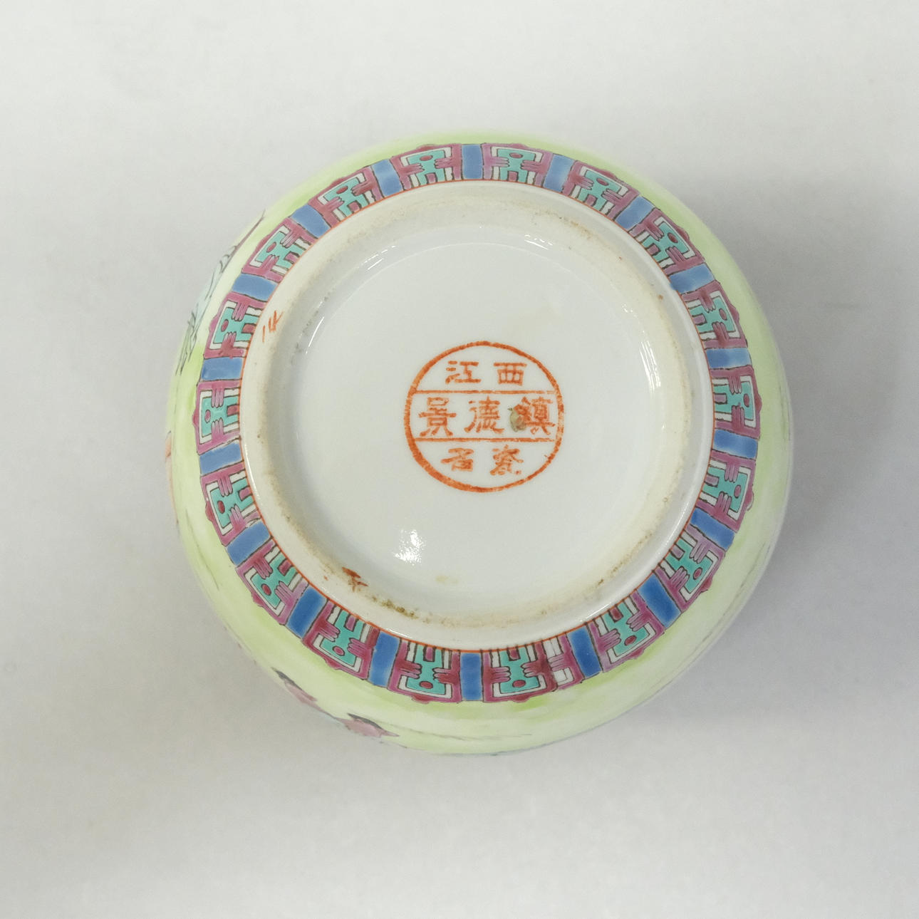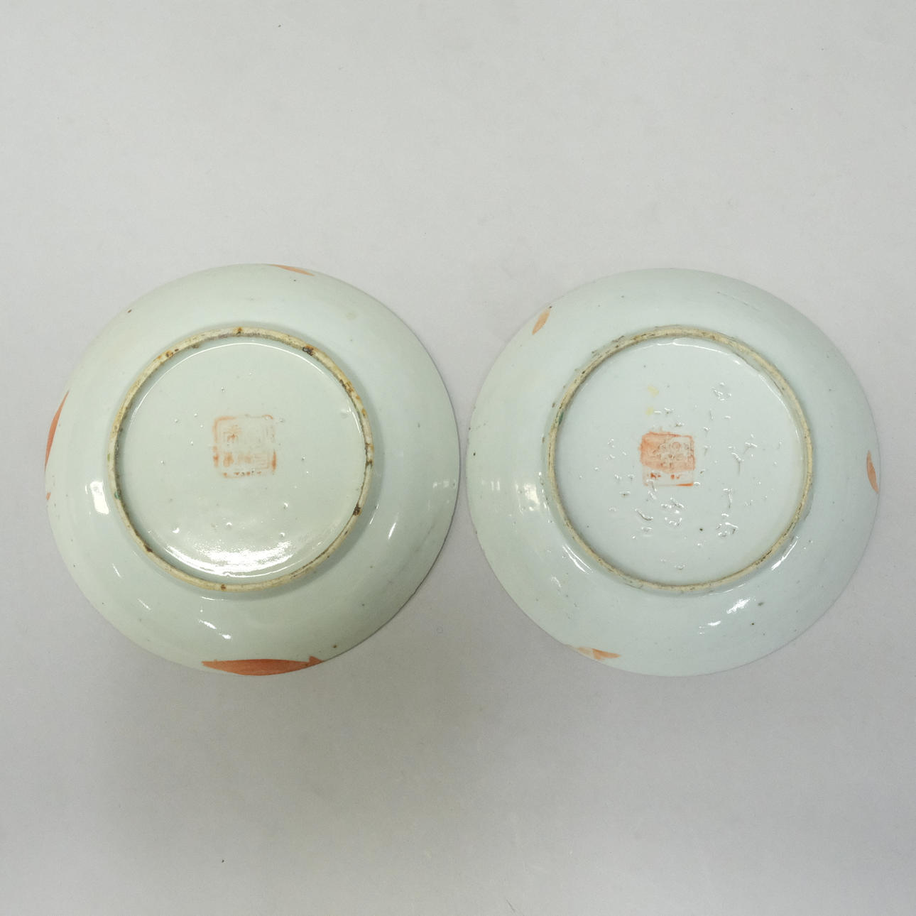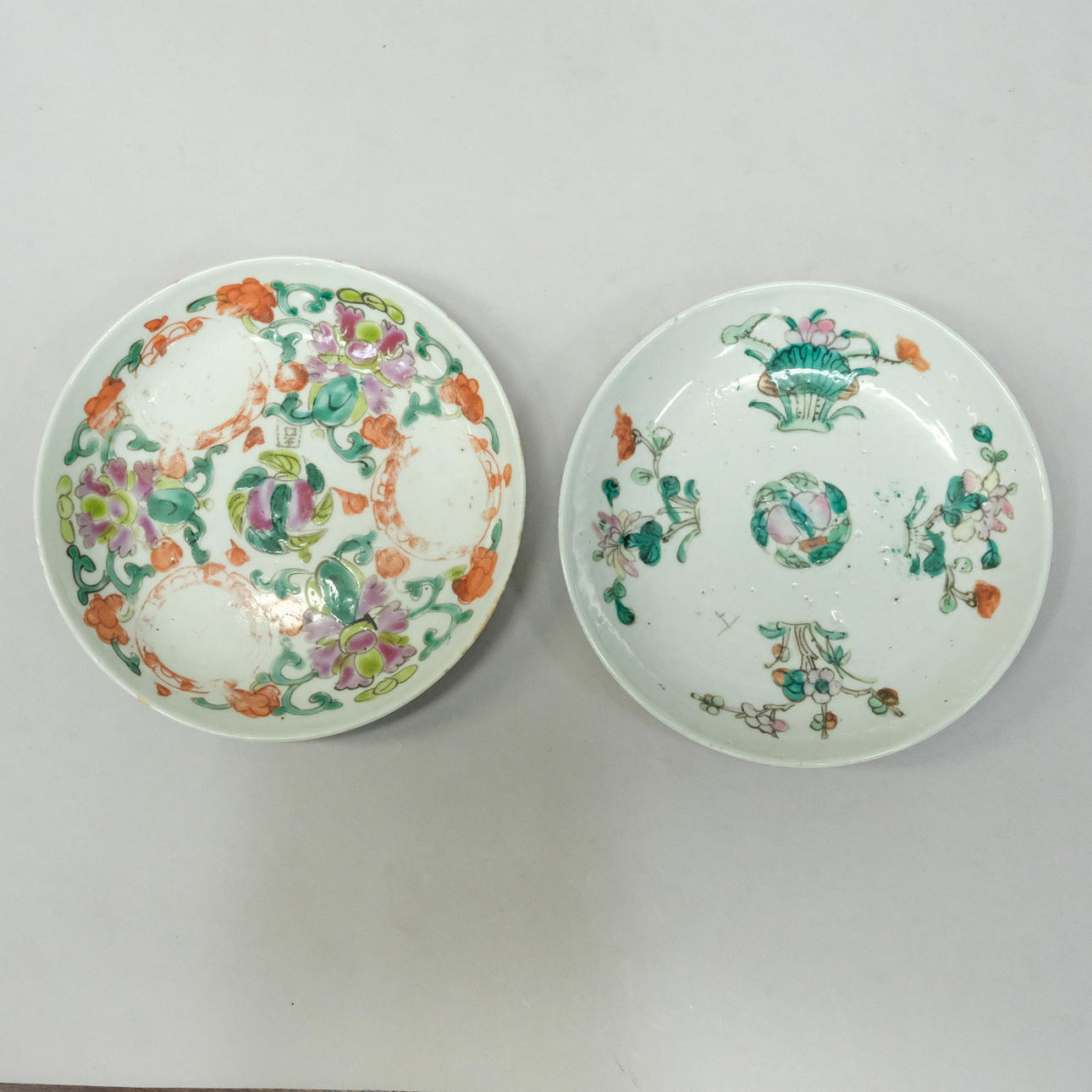 Painted in colours, 19th/20th century: 1 bowl, diameter 10 cm; 1 pair of soap cups, length 10.5 cm; 1 shackle with lid, height 11.5 cm and 2 bowl dishes, diameters 16,5 and 17 cm. Condition Normal wear and tear. 41247
