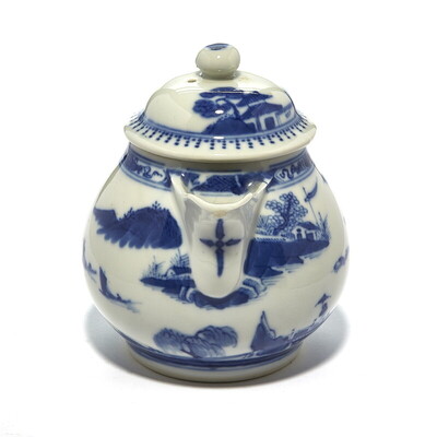 Height 14 cm Length 16 cm Jug with a vaulted lid, a round handle at the side and a pouring spout. Hand-painted décor in cobalt blue underglaze with motifs of fjord landscapes with pagodas, boats and mountains in the background. Combined cider and teapot. PROVENANCE The owner is a member of the Norwegian Society for Oriental Ceramics (NSOK) Swedish private collection, purchased in 2009