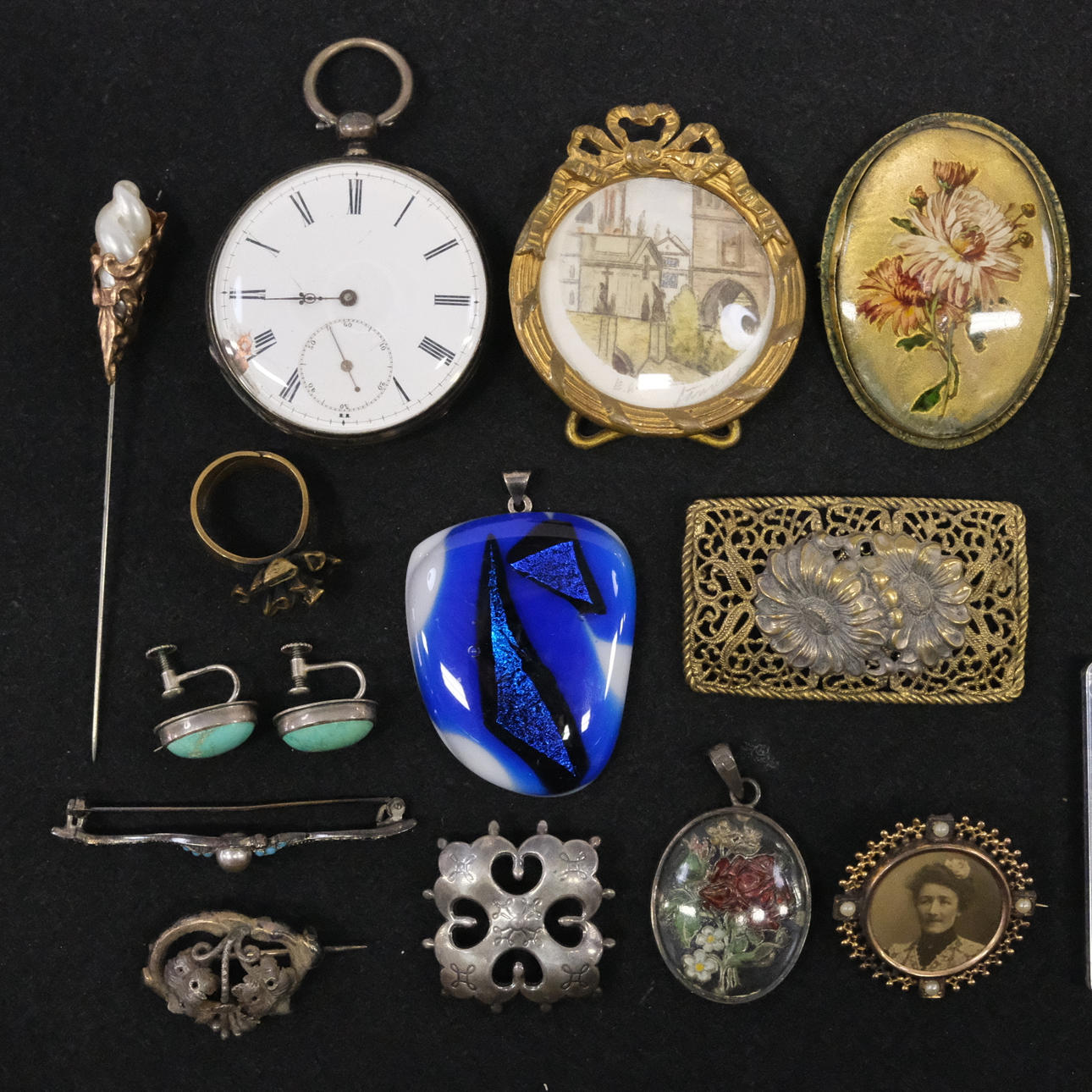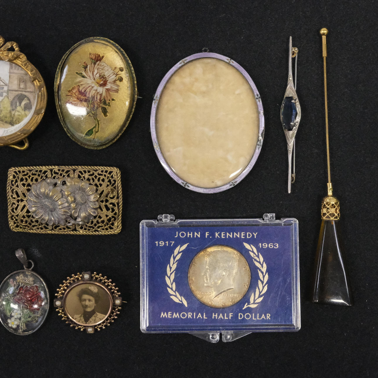 Commemorative coin Kennedy, two frames of which one in silver, seven brooches including in silver, two pendants, ring Finland, pocket watch with silver case, 1 pair of silver earrings, two hat pins. Condition Age-related wear, a frame with enamel damage, pocket watch with damage, the function is not responsible. 40662