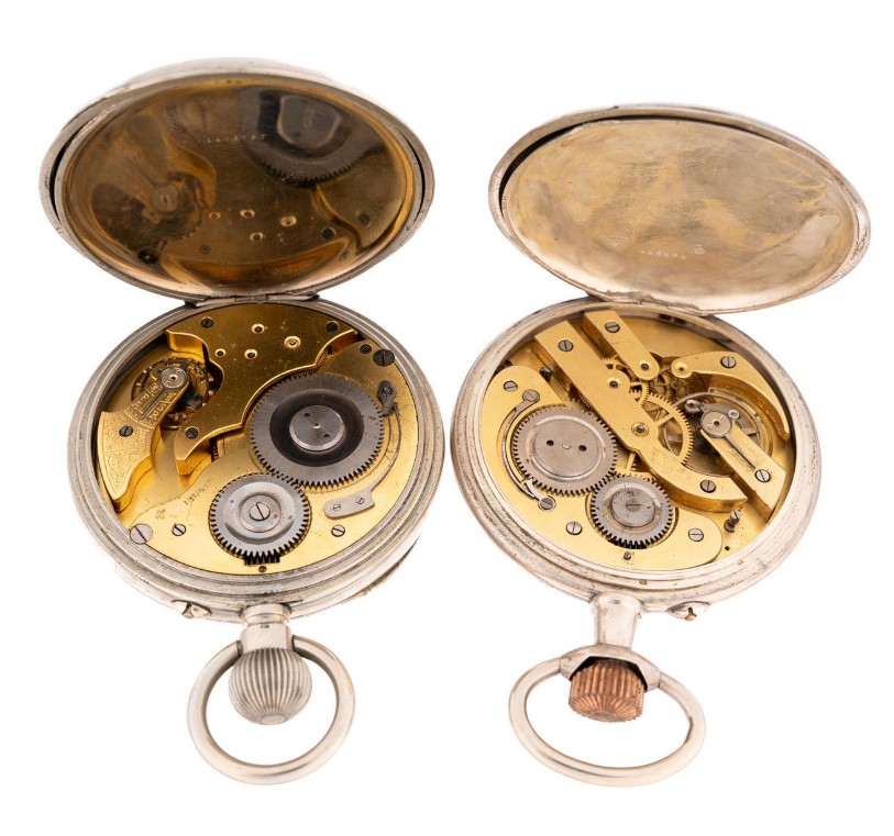 Collection of pocket watches in different sizes with cases made of silver & steel. Country of origin mainly England & France. 2pcs key pullers. Includes case and universal key. Diameter dimensions largest pocket watch: 75 mm Diameter dimensions minimum pocket watch: 45 mm. Condition Not functional tested, Minor scratches & wear, Personalized monograms present, No other remarks. 13979