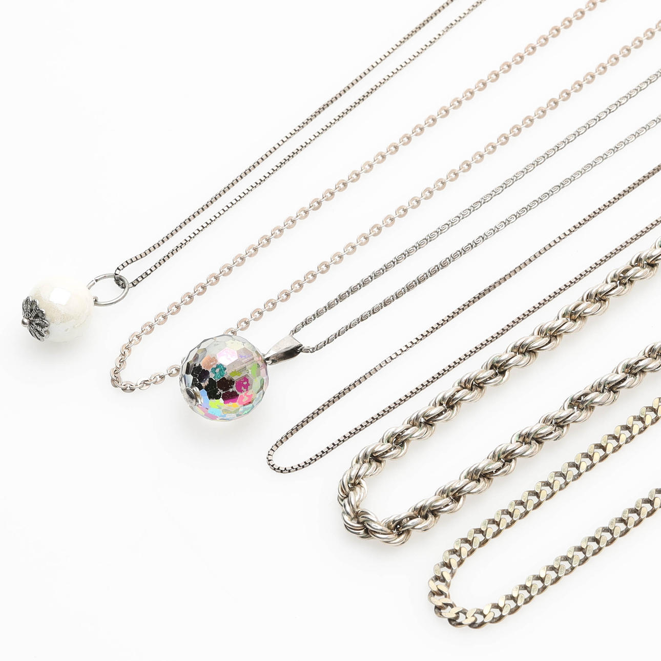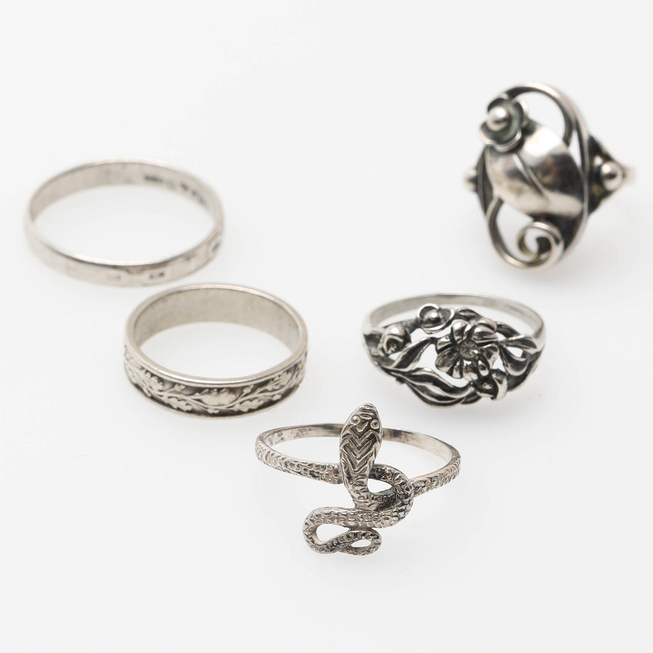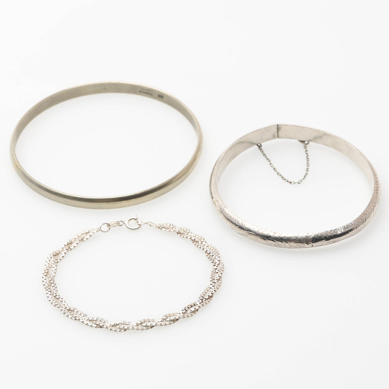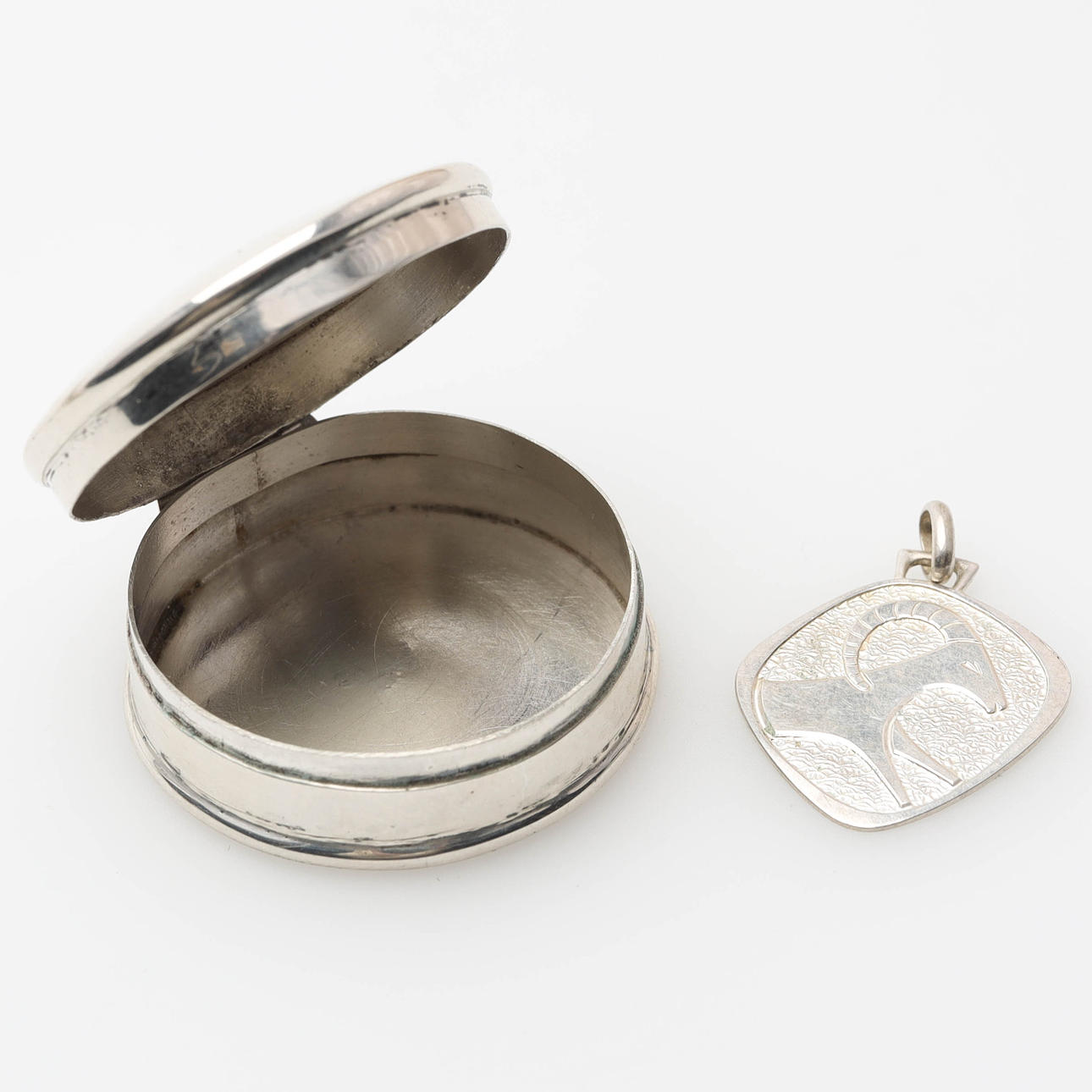 Sterling silver and silver, total weight 140 grams. 5 pcs rings, size 17-21. 1 box, 32mm in diameter. 1 pendant, 18.5 mm in diameter. 1 pair of earrings. 2 rigid bracelets, inner dimensions 71mm and 58mm. 6 pcs necklaces. 1 piece bracelet. Condition Condition of use. 27325