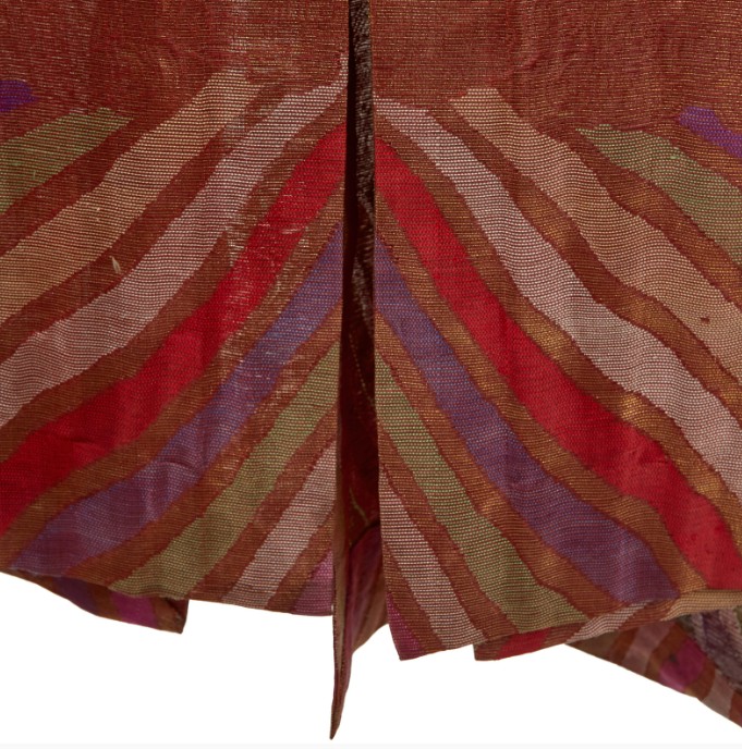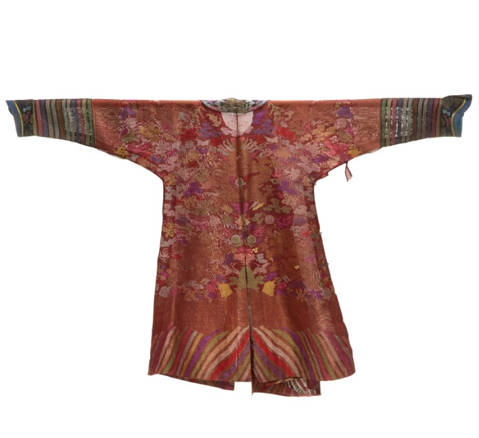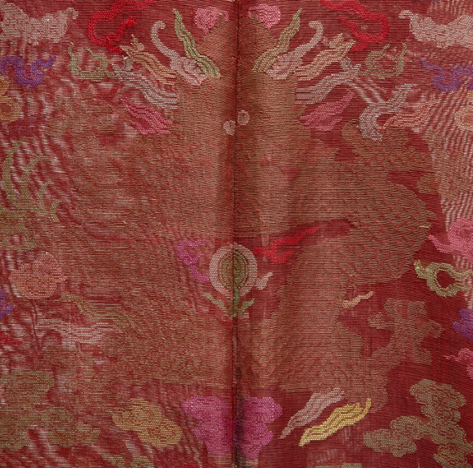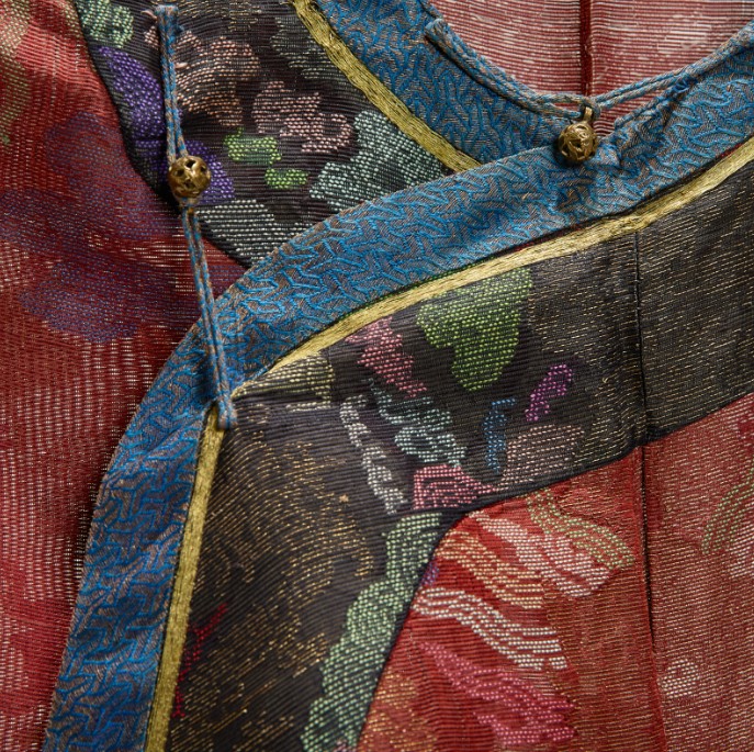 Woven costume with long sleeves and horseshoe cuffs. Rich woven polychrome decoration with metal thread against a brownish-red ground. A total of nine dragons are depicted here: four dragons each on the front and back pieces, and one behind the front piece. The dragons are depicted in search of the burning pearl among ruyi-shaped clouds, tongues of fire and symbols of good luck and cranes. The lower part shows the undulating surface of the sea with various symbols. In the center is the sacred Kunlun Mountain. At the bottom are polychrome lishui ("standing water") symbolizing the deep sea. Horseshoe-shaped cuffs and a neck opening with woven ribbons in dark blue and multi-colored decoration. Slit in the front and back in the center. The costume closes on the side with five flower-shaped, cast metal buttons. Length (collar to bottom) approx. 136 cm Length (sleeve to sleeve) approx. 220 cm PROVENANCE The collection of Sigurd Eliassen (1884-1960). Eliassen worked, among other things, on river projects and infrastructure development in China as an engineer after studying in Michigan, USA. Later, in 1955, he wrote the book "Gamle Drage Wangs Elv: en norsk ingeniørs oplevder i China" in which he describes his years in China. Among other things, he writes about how in 1933, as chief engineer for the Xilan road project between Xi'an and Lanzhou, he was captured by the Red Army near Xi'an and later managed to escape. Eliassen died in Oslo in 1960. Later inherited in the family. Age-related wear and tear. Some wear to fabric on sleeves and cuffs. Some torn seams, including under both sleeves and at the bottom of one side. Some stains on inner fabric and lining on sleeves. Some sun-bleached. Damage to blue decorative band on front at side fastening. Inspection recommended.