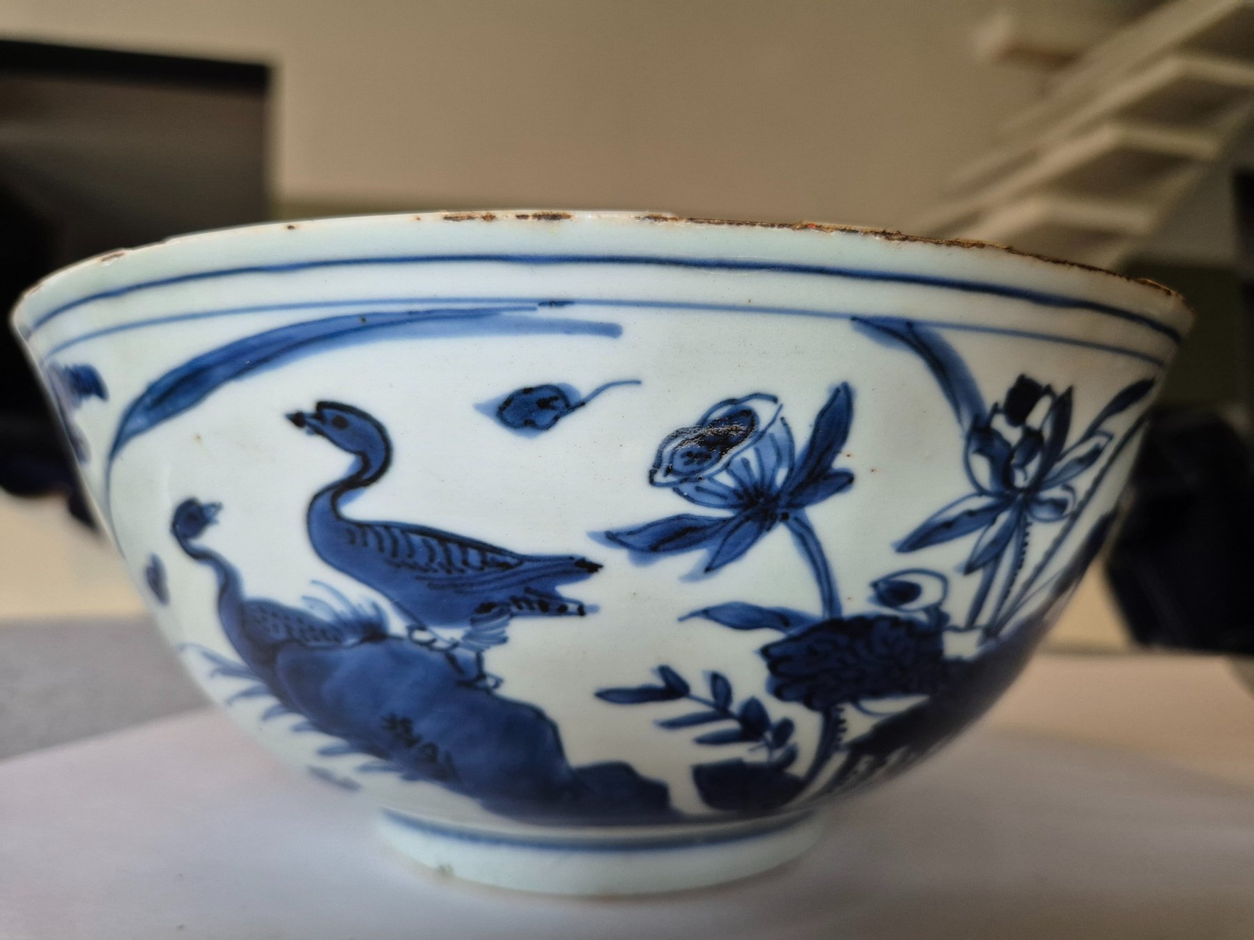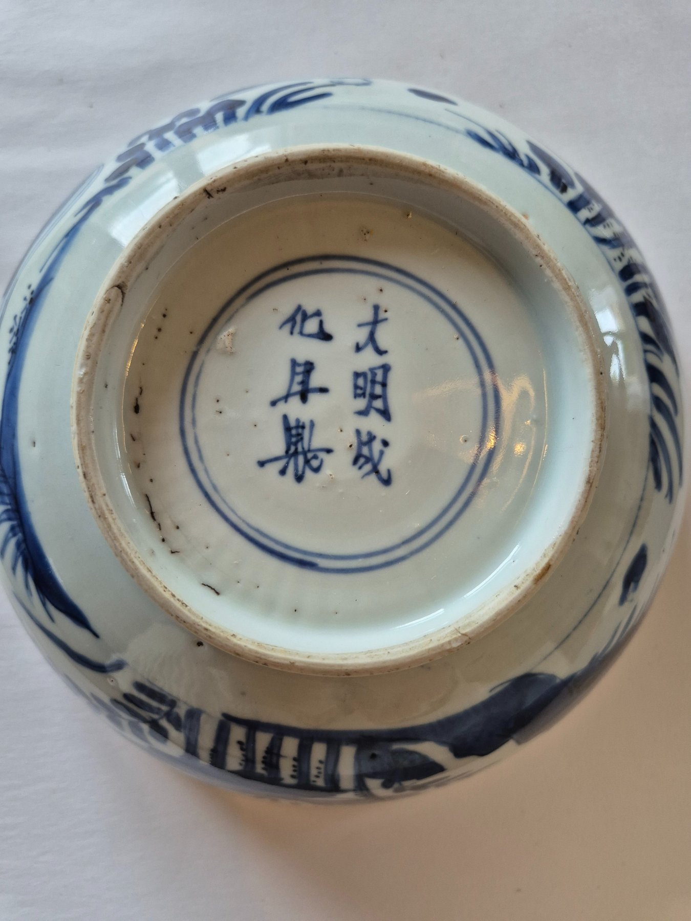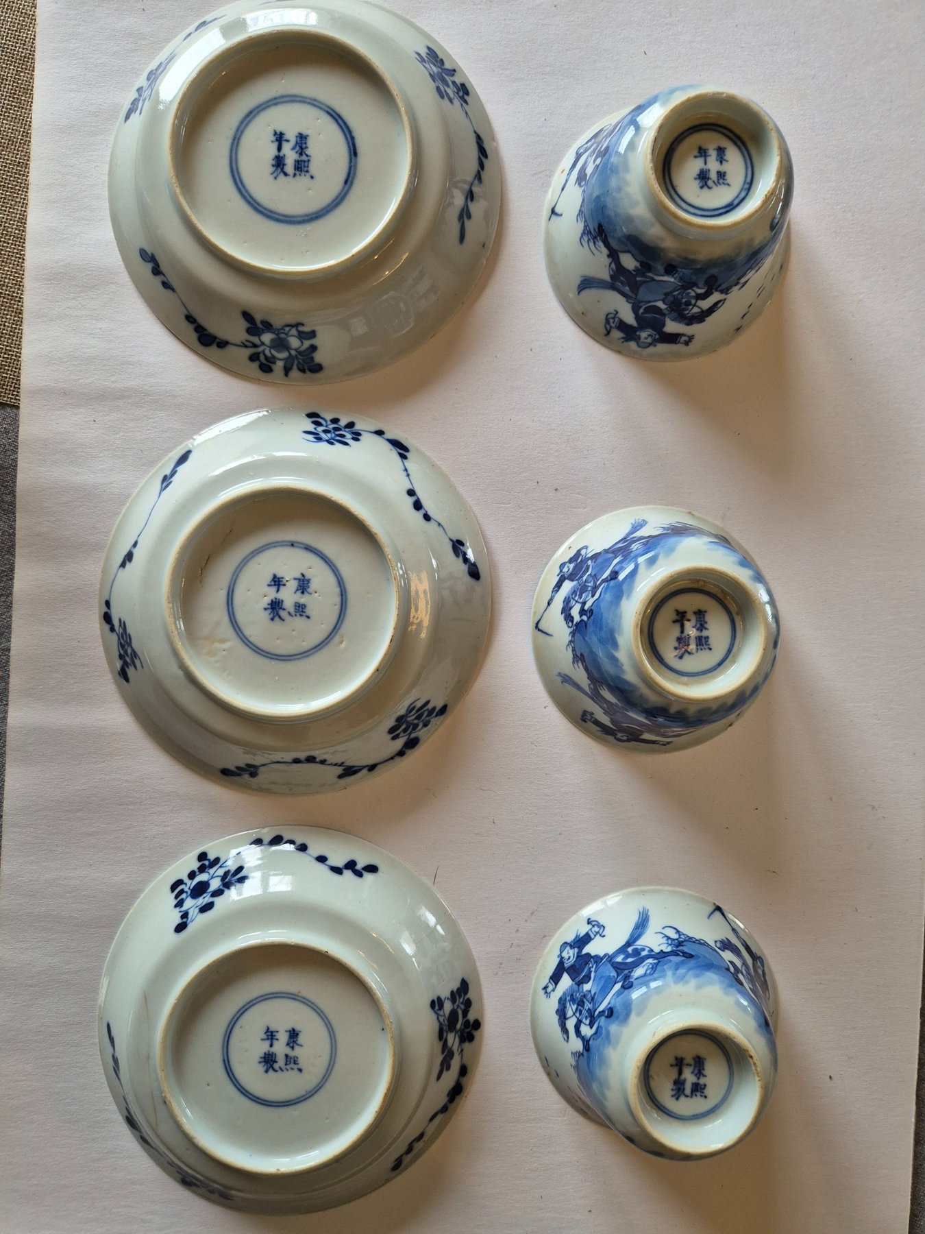 In Chinese Blue And White Porcelain, Kangxi Brand, Probably Late 19th Century Dimensions: Saucers, height 2cm, width 13cm Cups, height 5cm, width 8cm Bowl, height 8cm, width 22cm Good condition Saucers and cups Average condition bowl, slightly chipped on the edge
