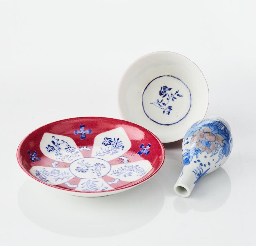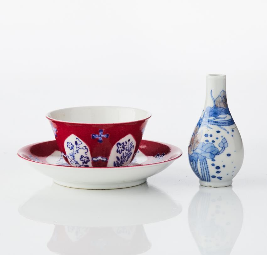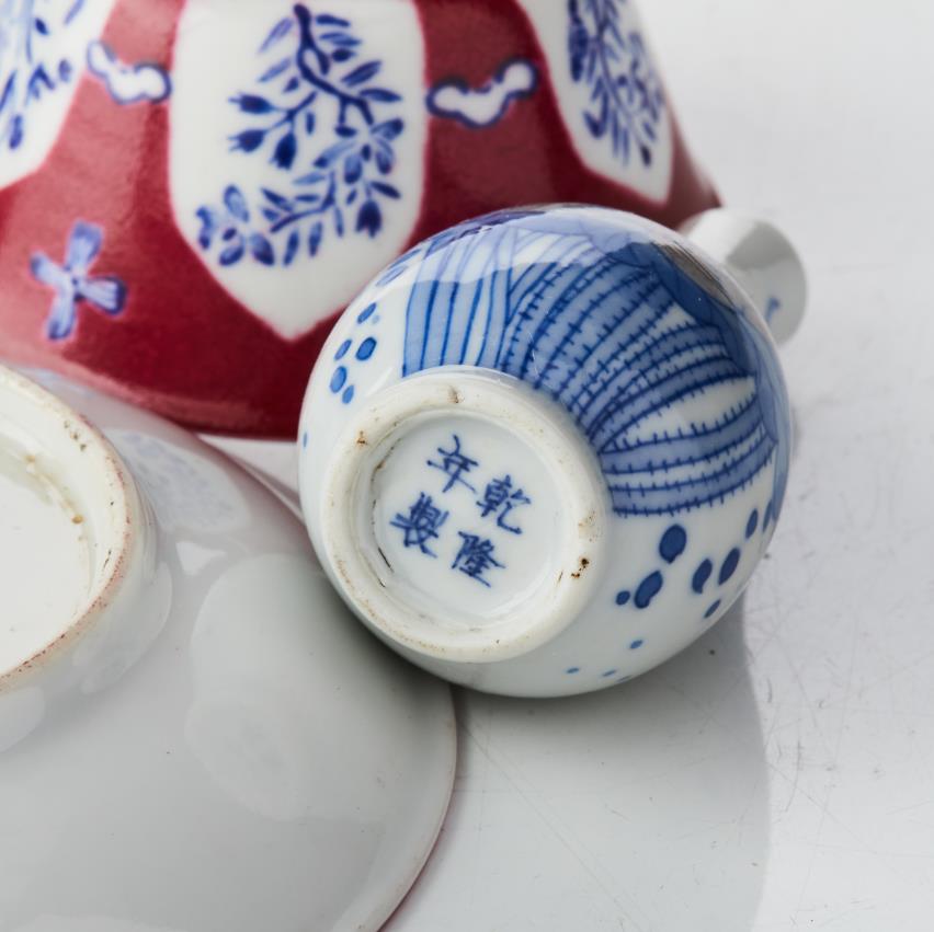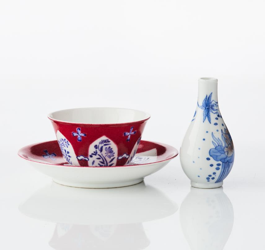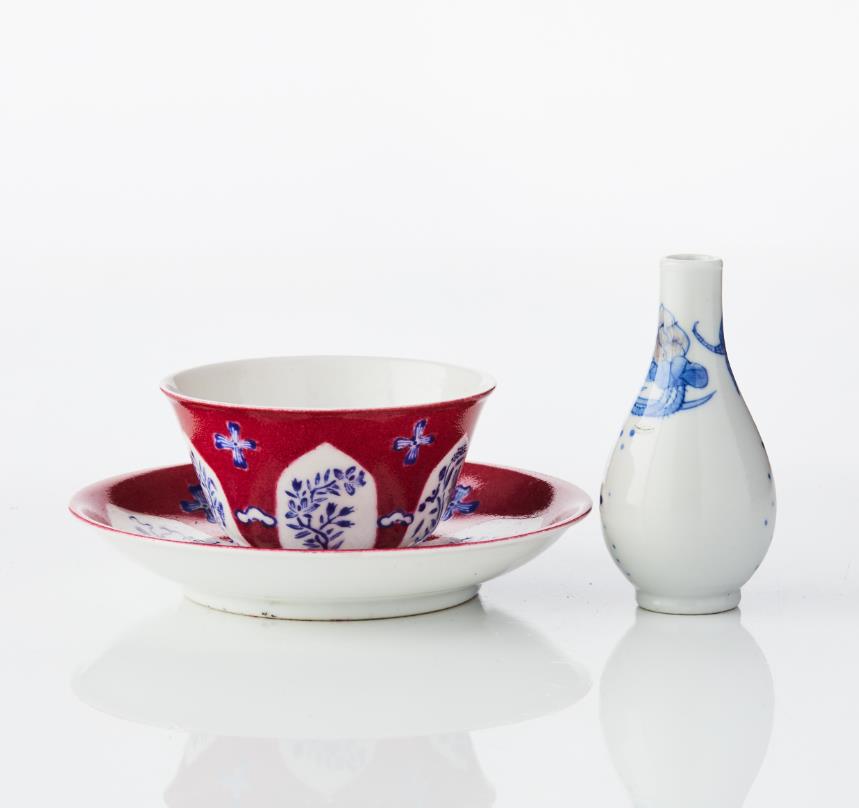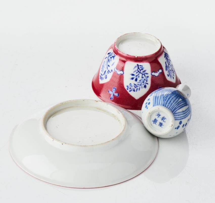 Decoration of flowers and ruyi in blue enamel against a base in pink enamel and decoration of lotus and insect in blue-and-white underglaze with hints of copper red. Snuff bottle with four-character brand of Qianlong. H 4.5 & 7.5 cm. Condition report Wear. The snuff bottle with minor chips to the foot ring. The cup with chips and defects to the foot ring.