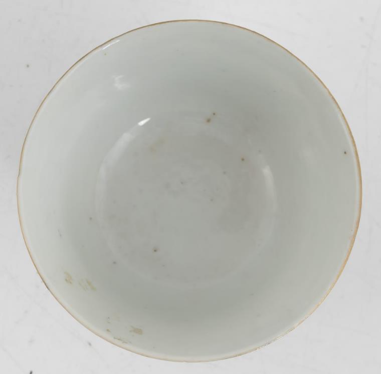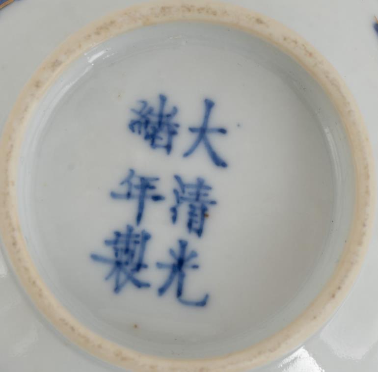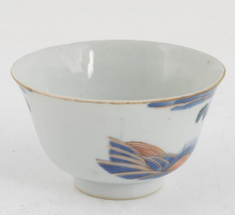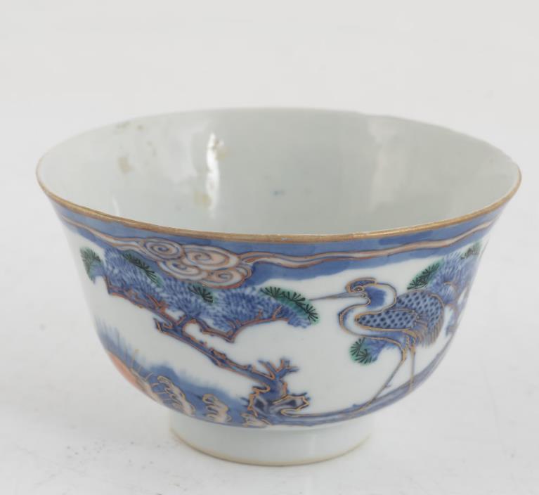 Flared mouth, standing on a straight foot ring. Decorated in underglaze blue, enamel green, iron oxide red and gilding. Motif of crane standing by pine surrounded by foaming waves and cloud formations. Guangxu's mark underneath. Height 6, diameter 10.2 cm. Wear. Glaze mist.