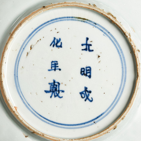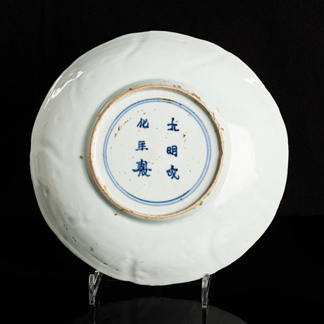 Carved decoration of fohund and painting in blue-white underglaze, brand of Chenghua. Diameter: 22 cm. Fitness report Wear and tear, edge chips and glaze chips, manufacturing defects. 68544
