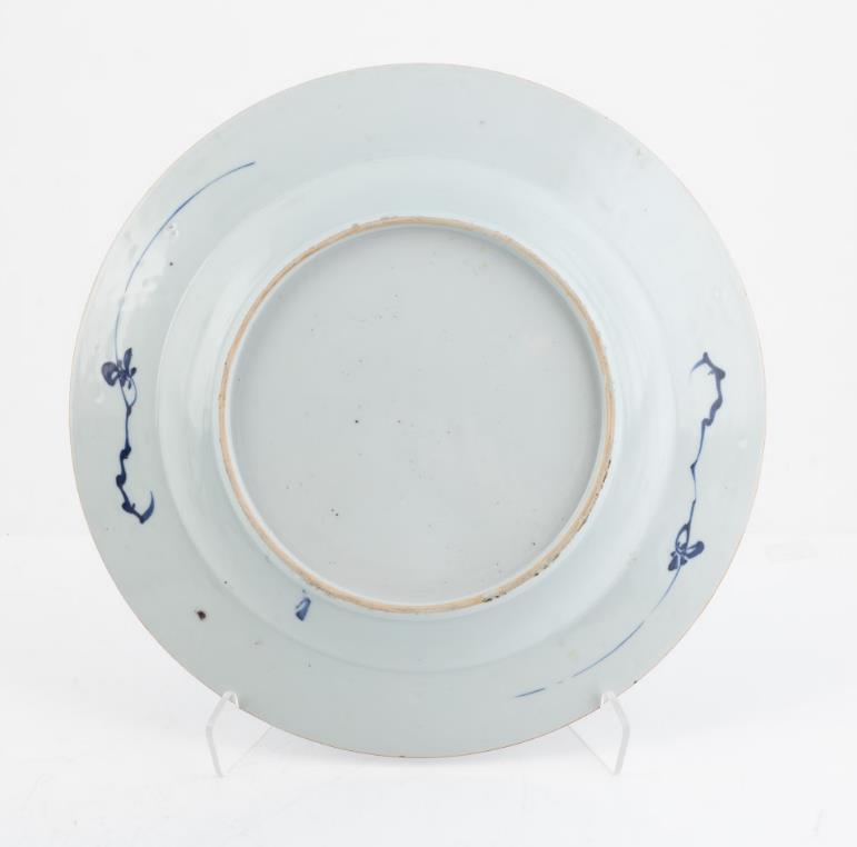 Around. Decoration in underglaze blue with motifs of a flowering garden with chrysanthemums, visteria, prunus and peonies, as well as garden rock, the brim with auspicious objects and chrysanthemums. Diameter 35 cm. Minor wear and tear.