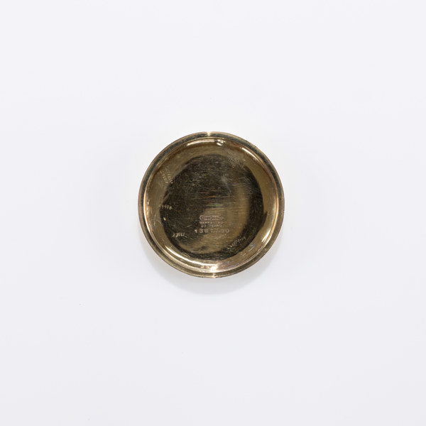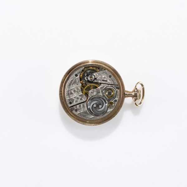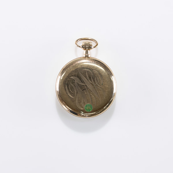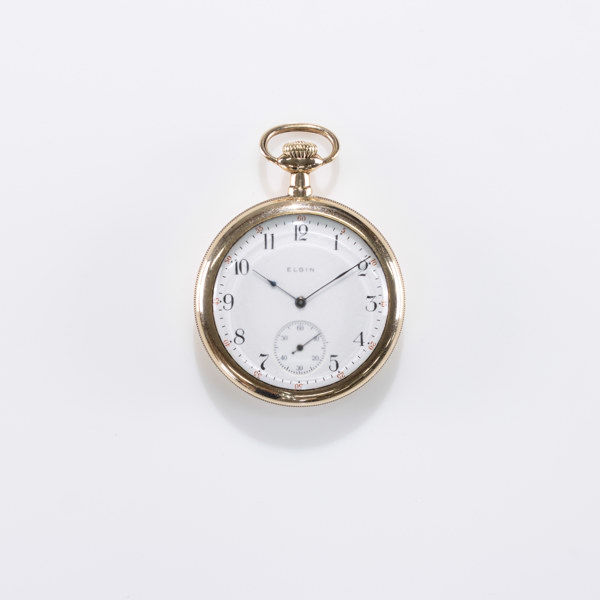 Pocket watch, Elgin, 50.5 mm, screwed case in rolled gold, monogram engraving, white enamel dial with painted Arabic indexes in black, sub-second, blued hands, caliber 291, circa 1910, USA, watch chain with pocket knife in gold-plated metal included Serial number 14070895 Condition: Functional, wear from use