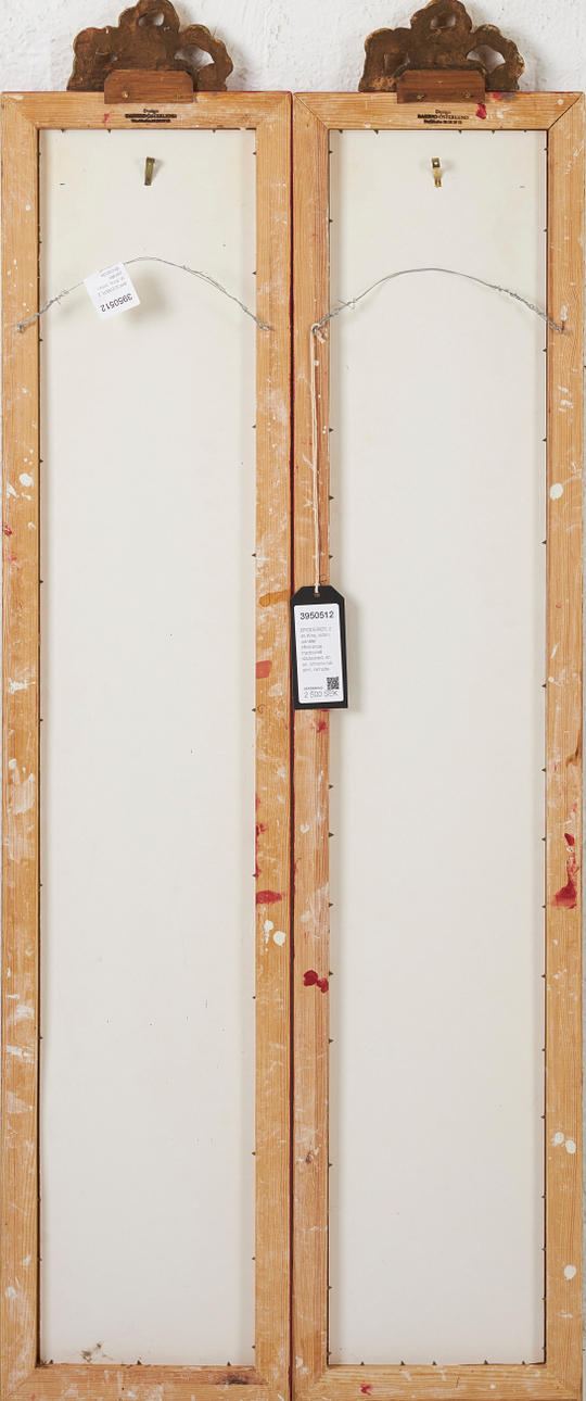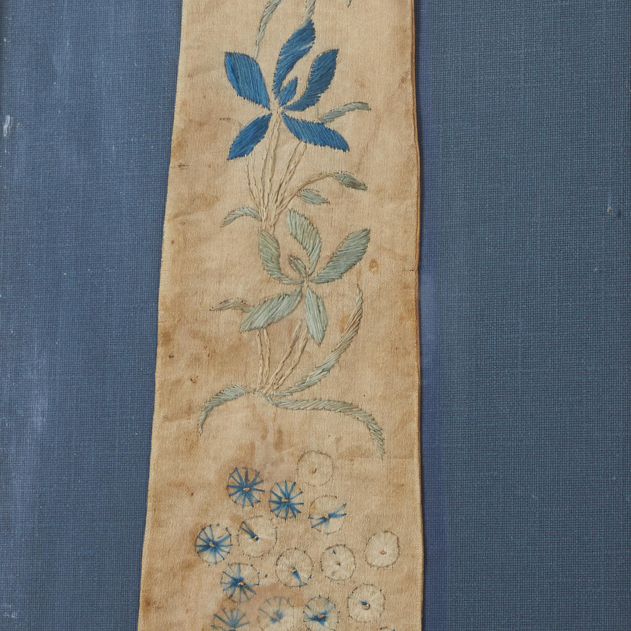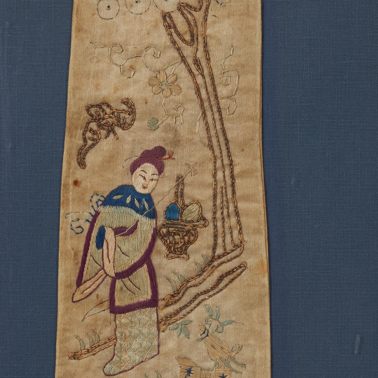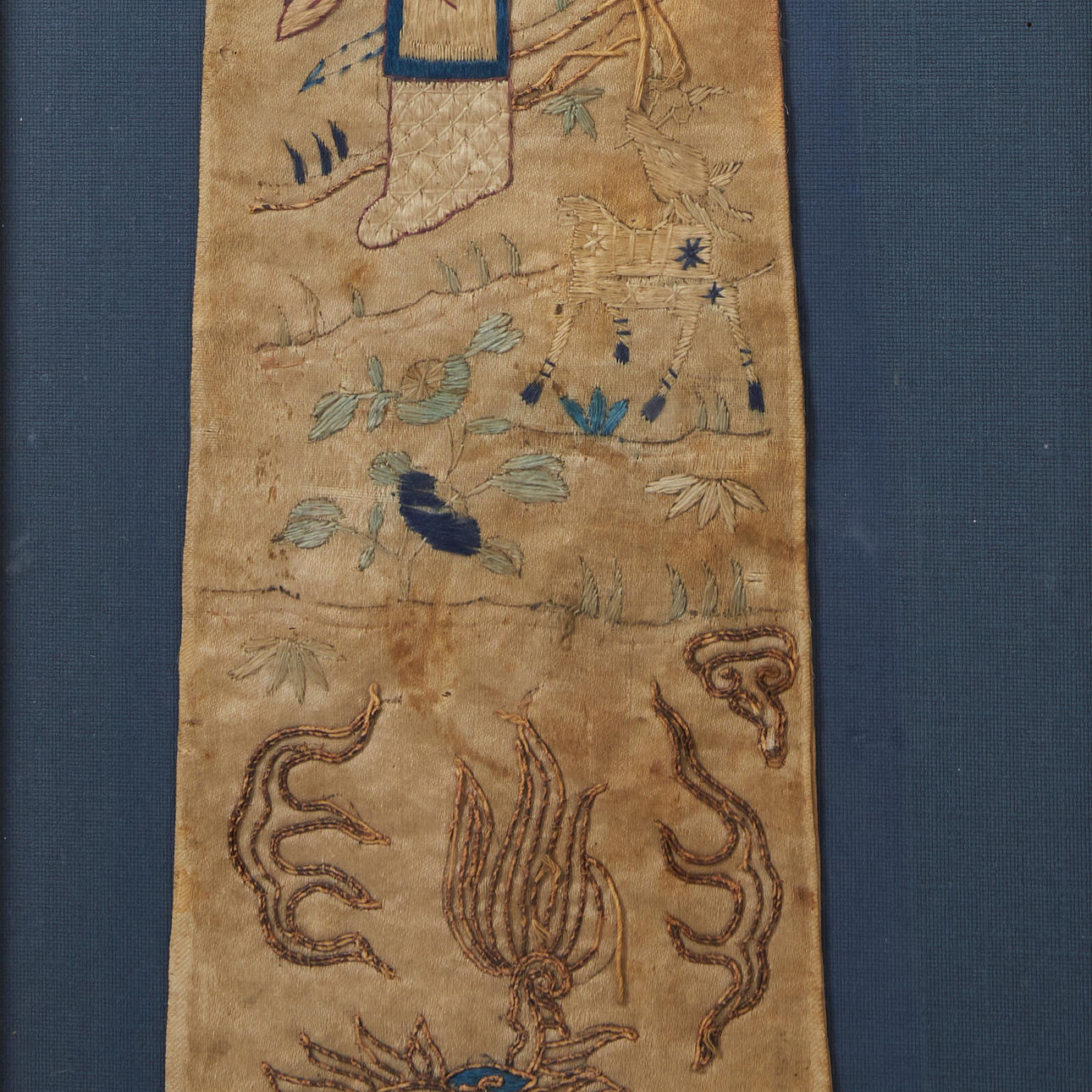 Panels belonging to traditional clothing, a so-called. phoenix tail skirt, framed. Length approx. 95 cm each Frame dimensions 126x27 cm. Condition Wear, damage, discoloration. 229887