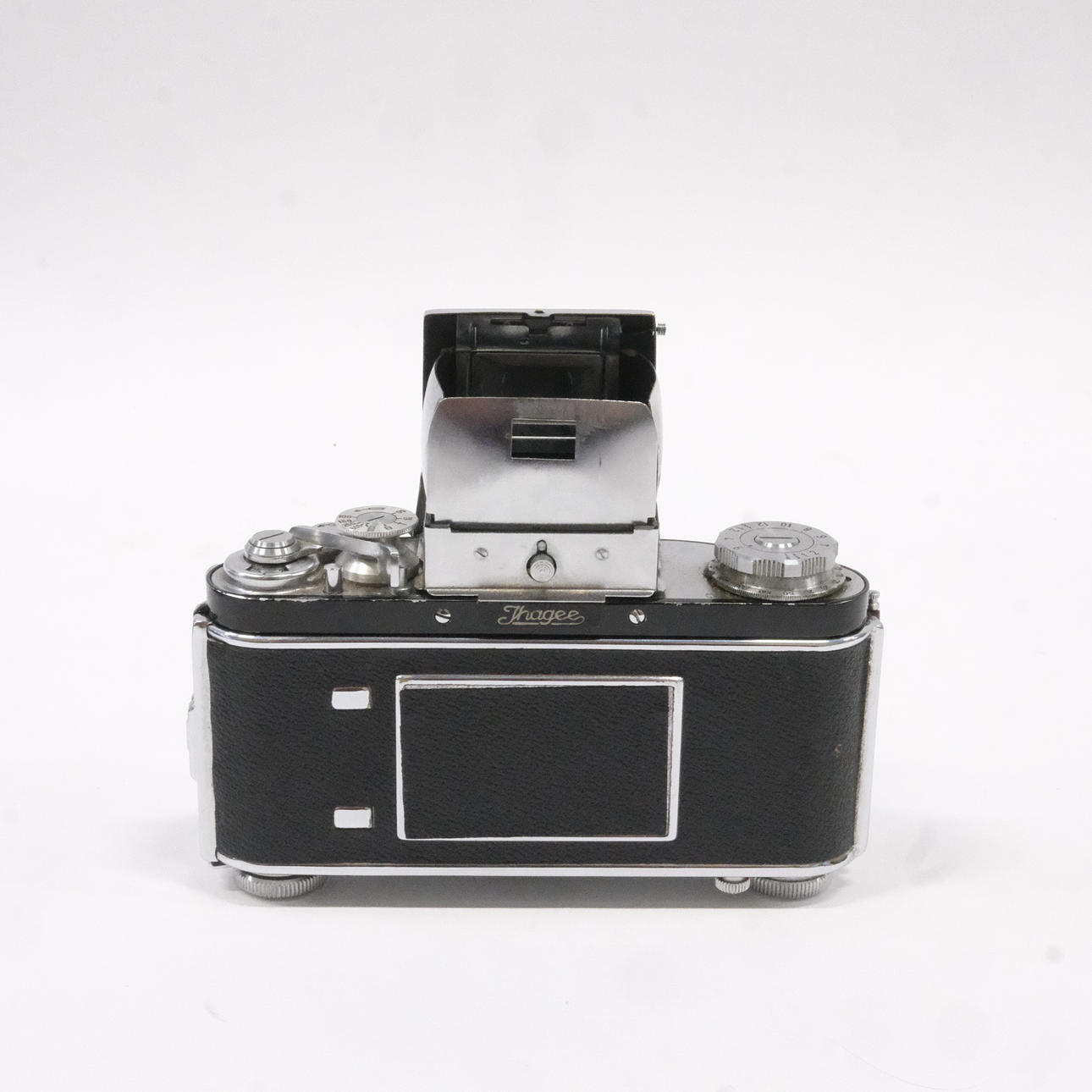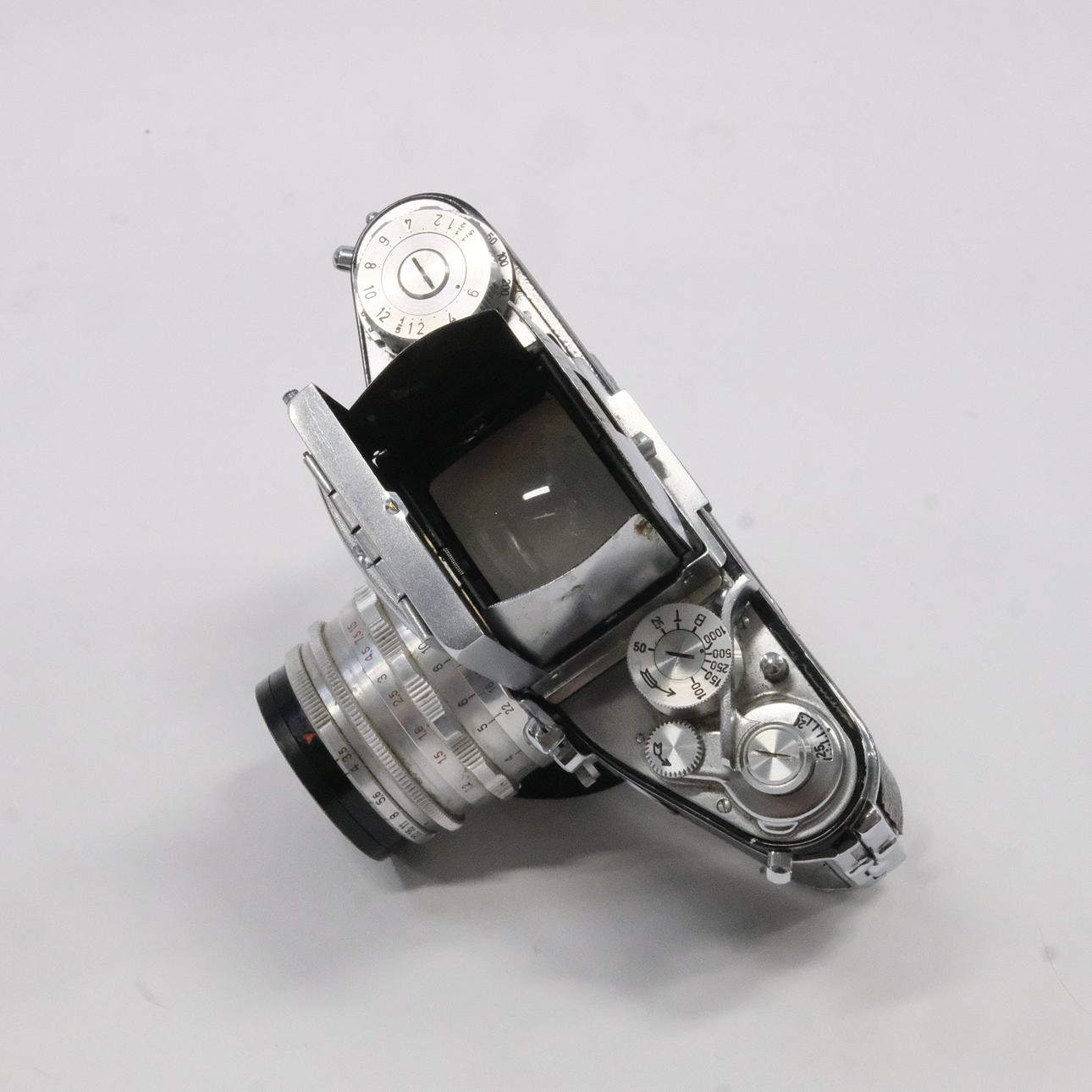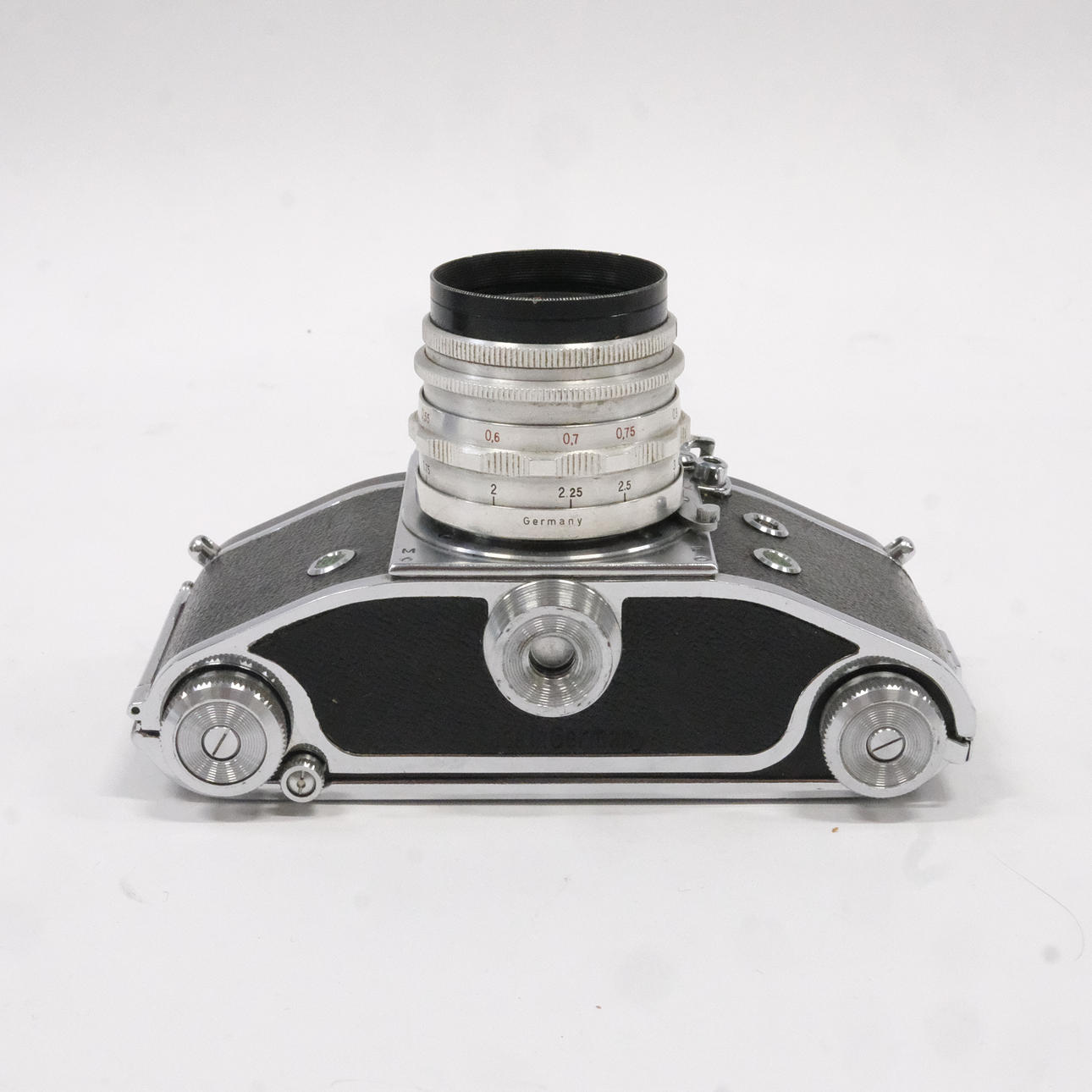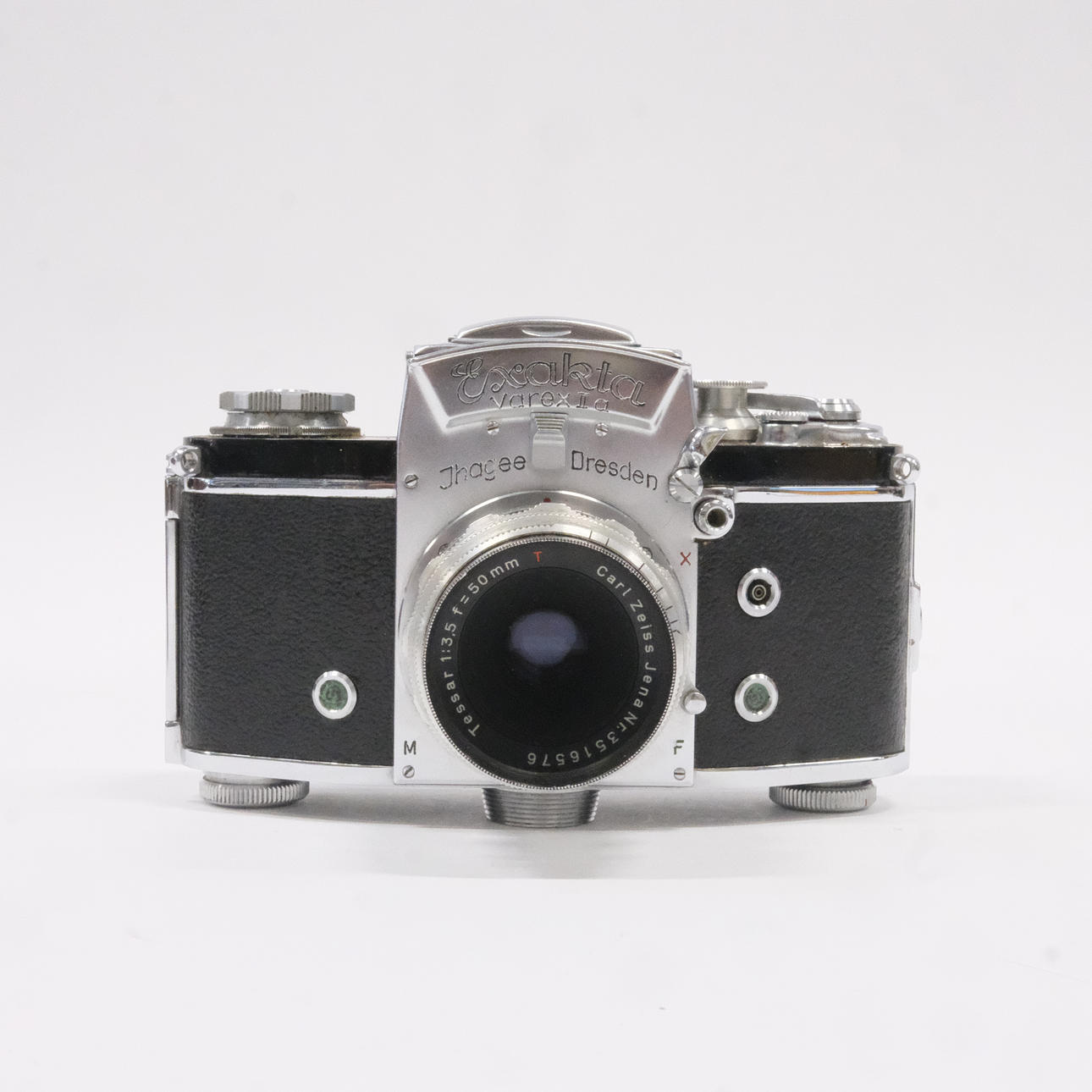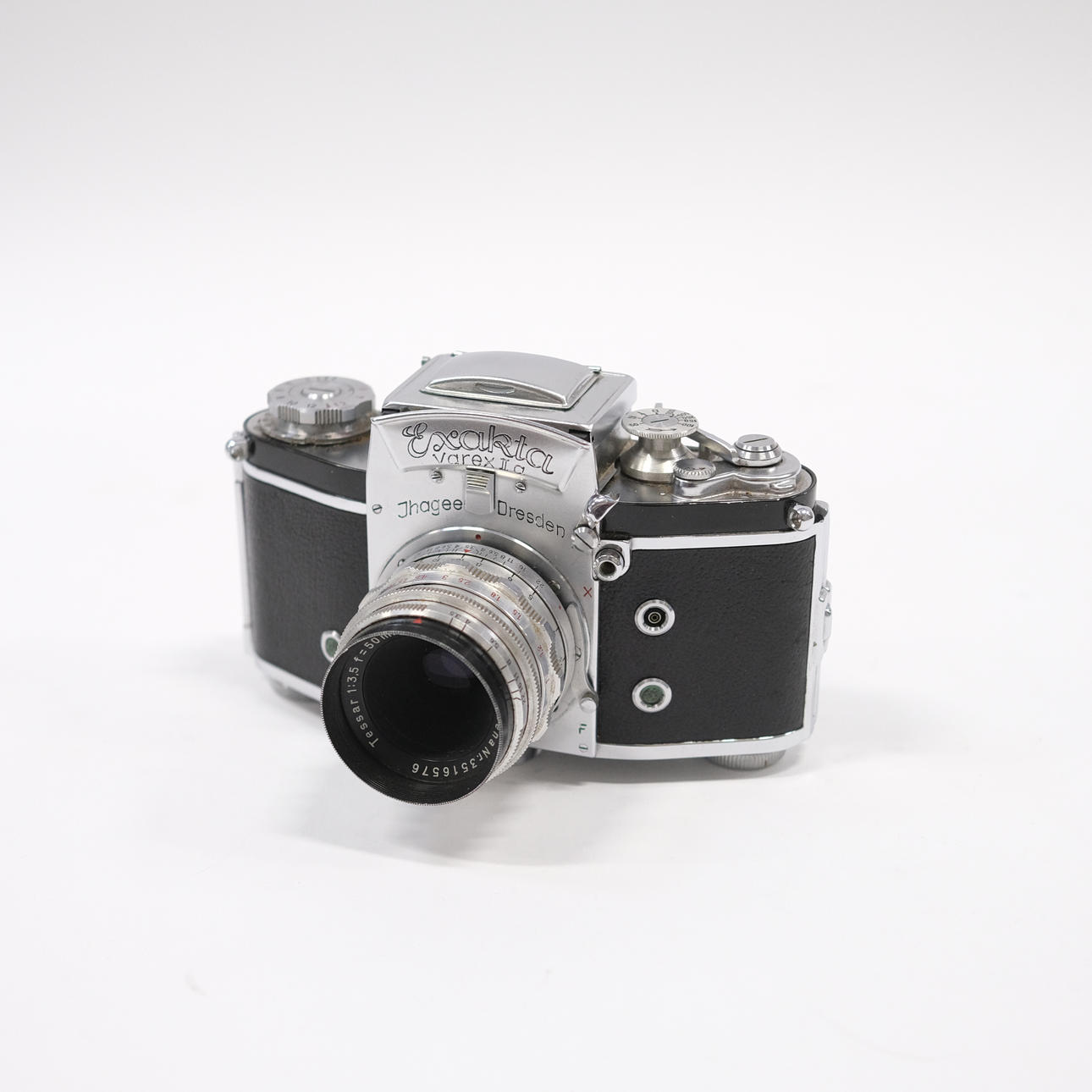Camera, Varex II a, made in Jhagee/Dresden, serial no.: 836106, length: 15 cm. Lens, Tessar, 1:3,5 f=50mm, length: 5,3 cm. Included camera case. Condition Normal wear and tear, the cover of the viewfinder slightly sagging, the function is not responsible. 44230