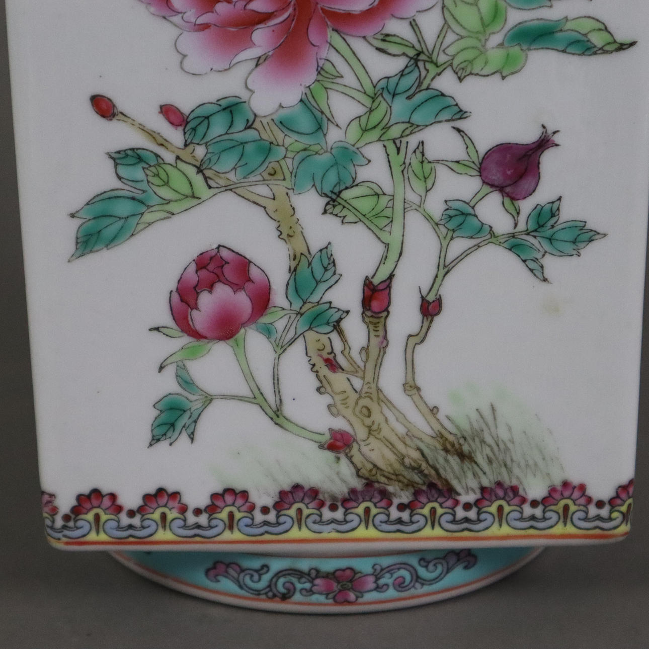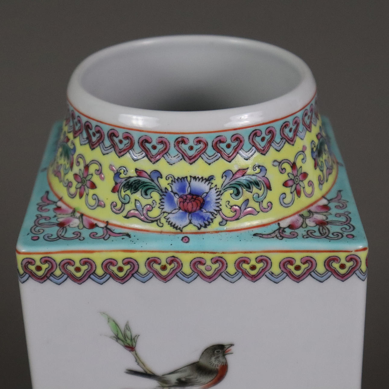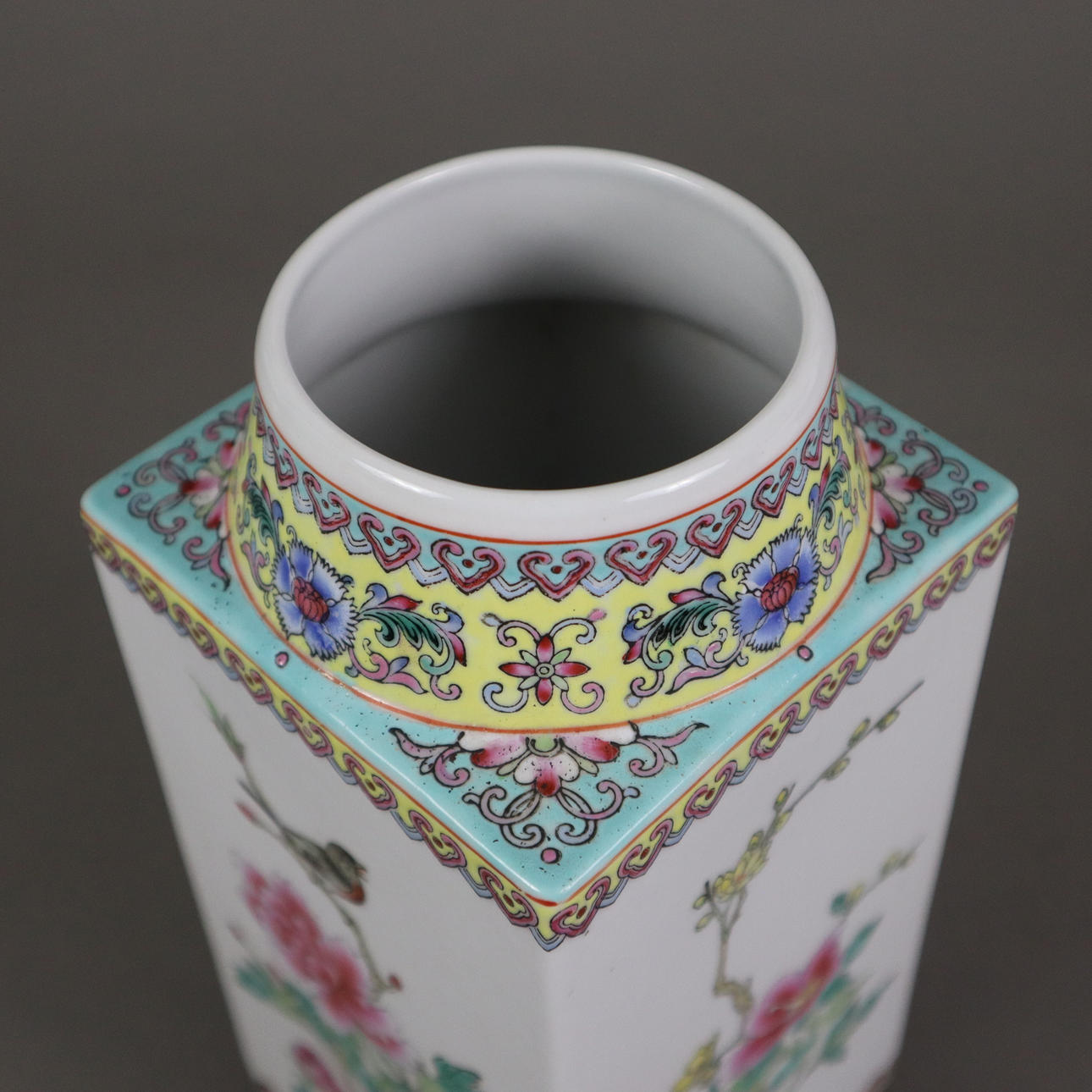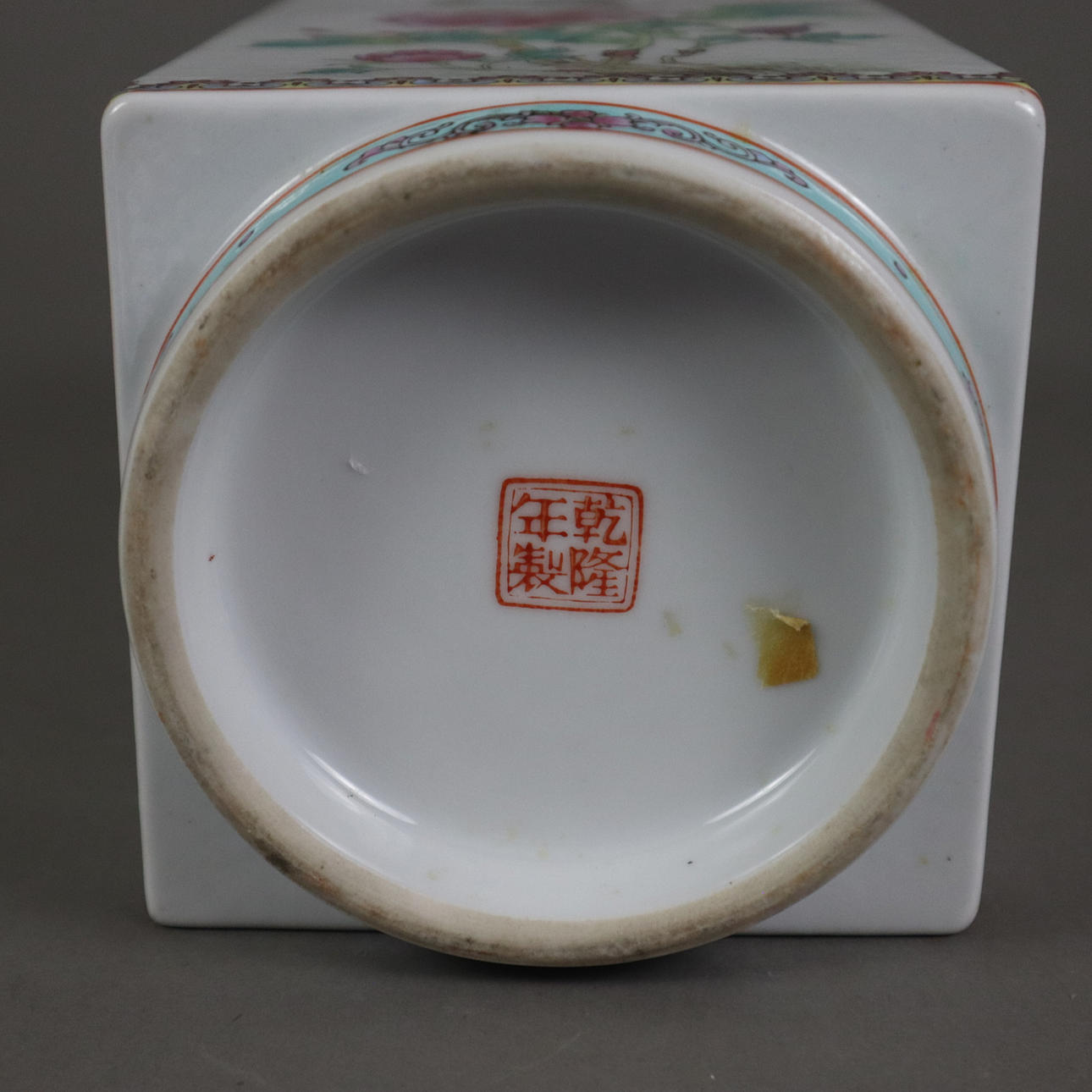 Porcelain with polychrome decoration using glazing technique. Description above round standing ring square body with cylindrical conical tapering mouth, sides with flowers of the four seasons: peony, lotus, chrysanthemum and plum, mostly floral ornamental bands on colored background, red four-character floor mark Qianlong, H. approx. 26 cm, Weight approx. 1220 grams. Fitness report minimal paint wear. 20599