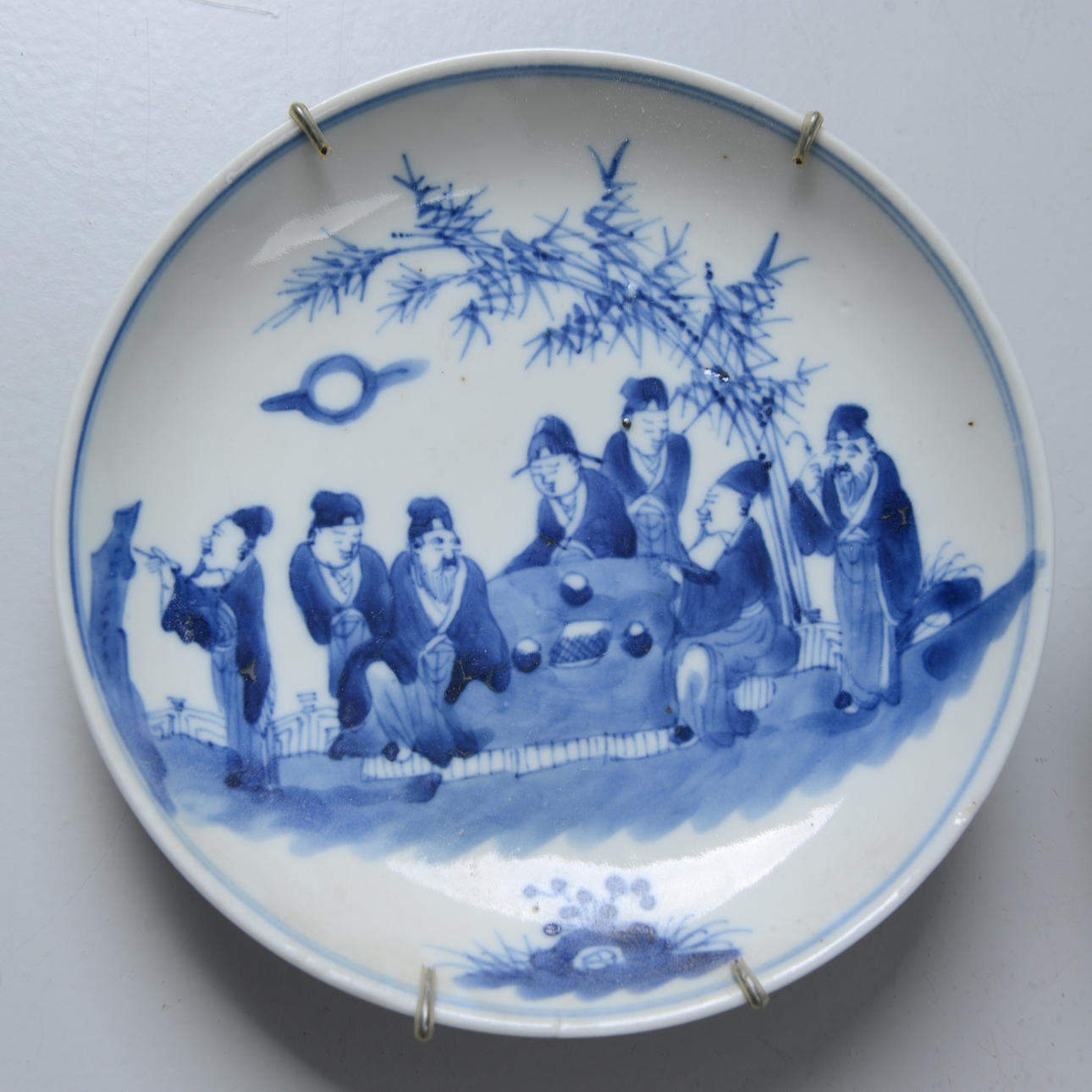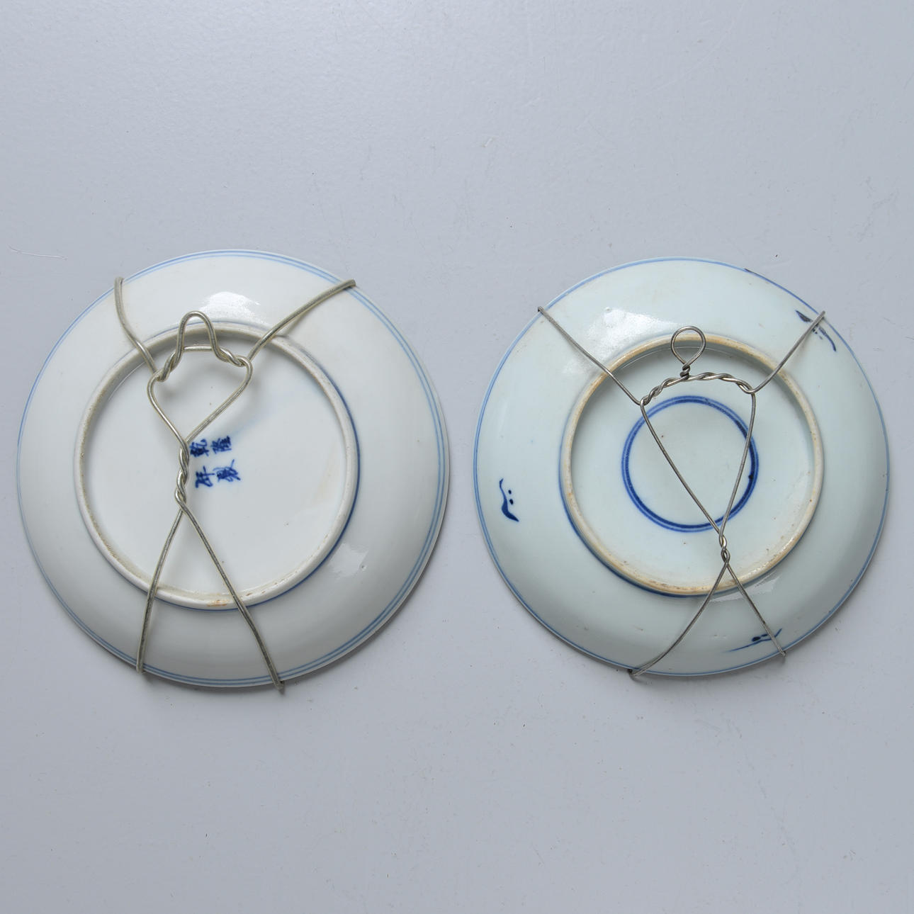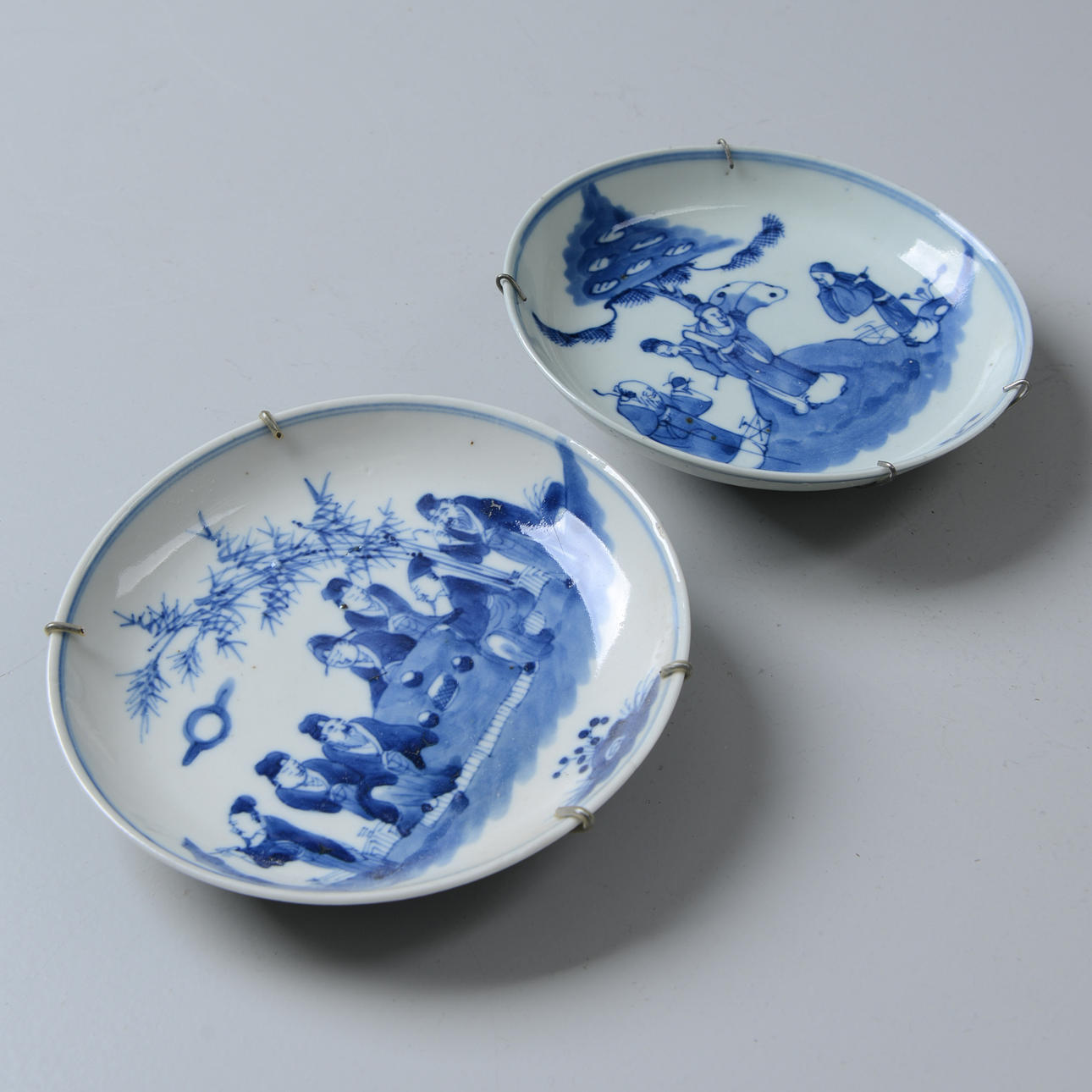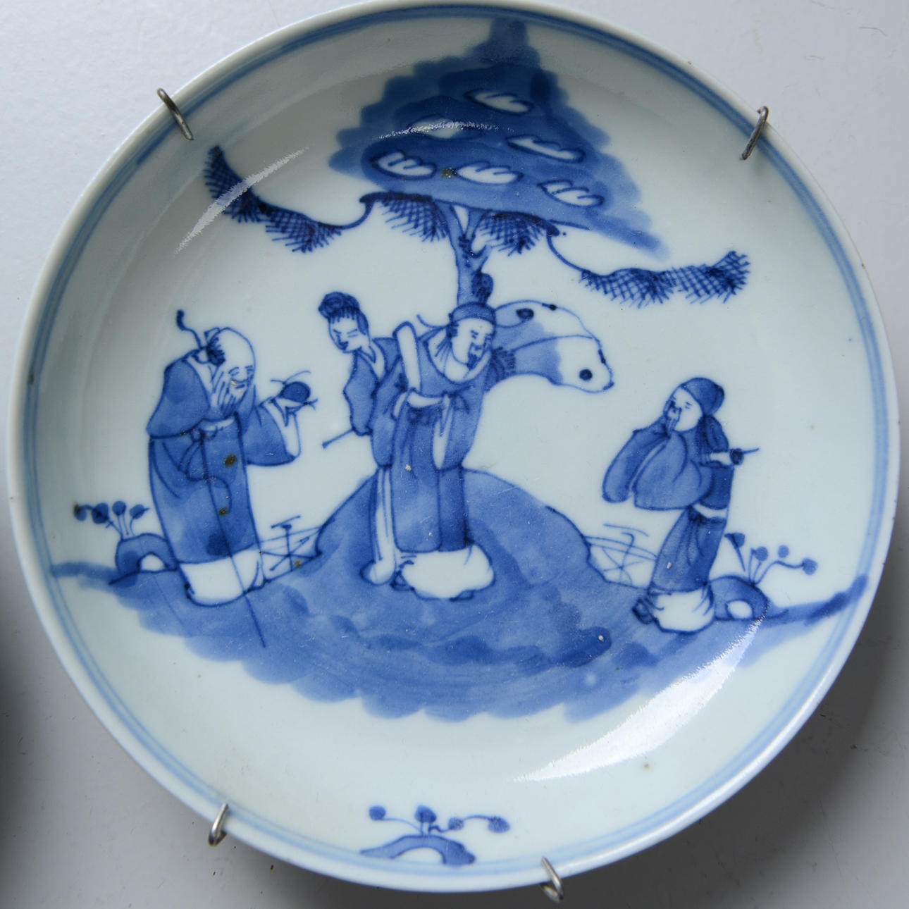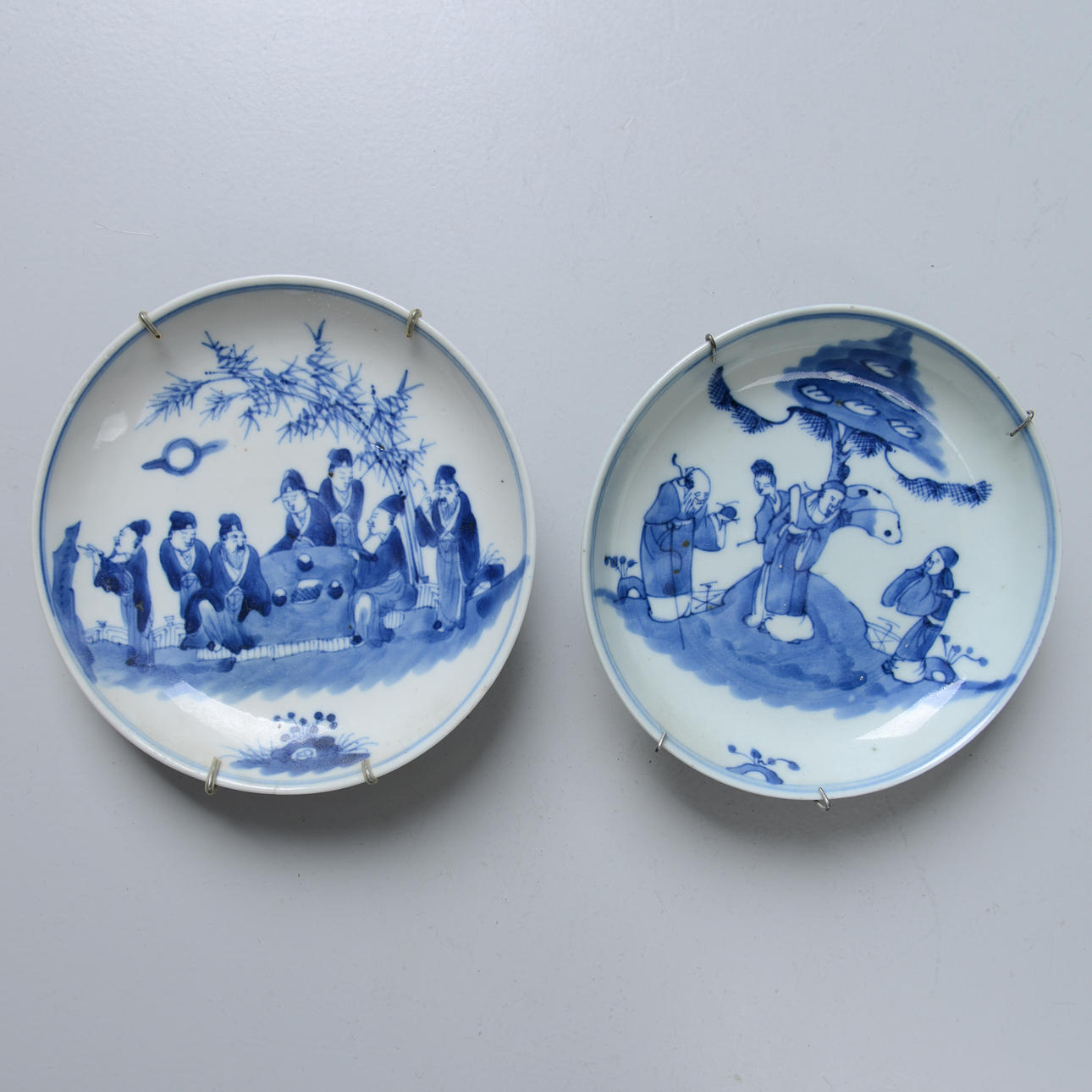Porcelain with blue underglaze. Figural motif. Diameter 14-14.5 cm. Condition report Insignificant edge chips. Wear. 22515