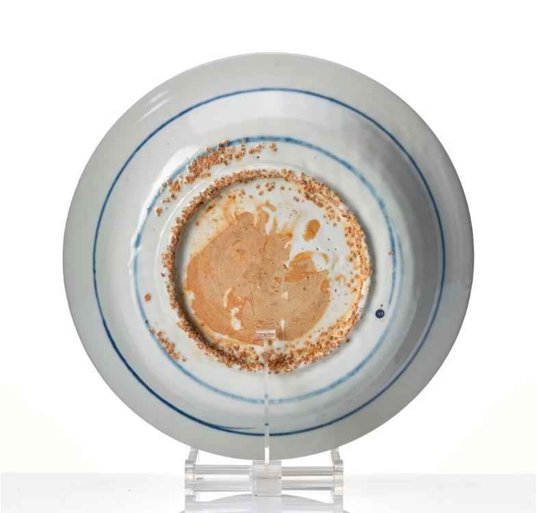 Dekor i underglasyrblått föreställande en fågel i blommande trädgård. Diameter 29,5 cm.