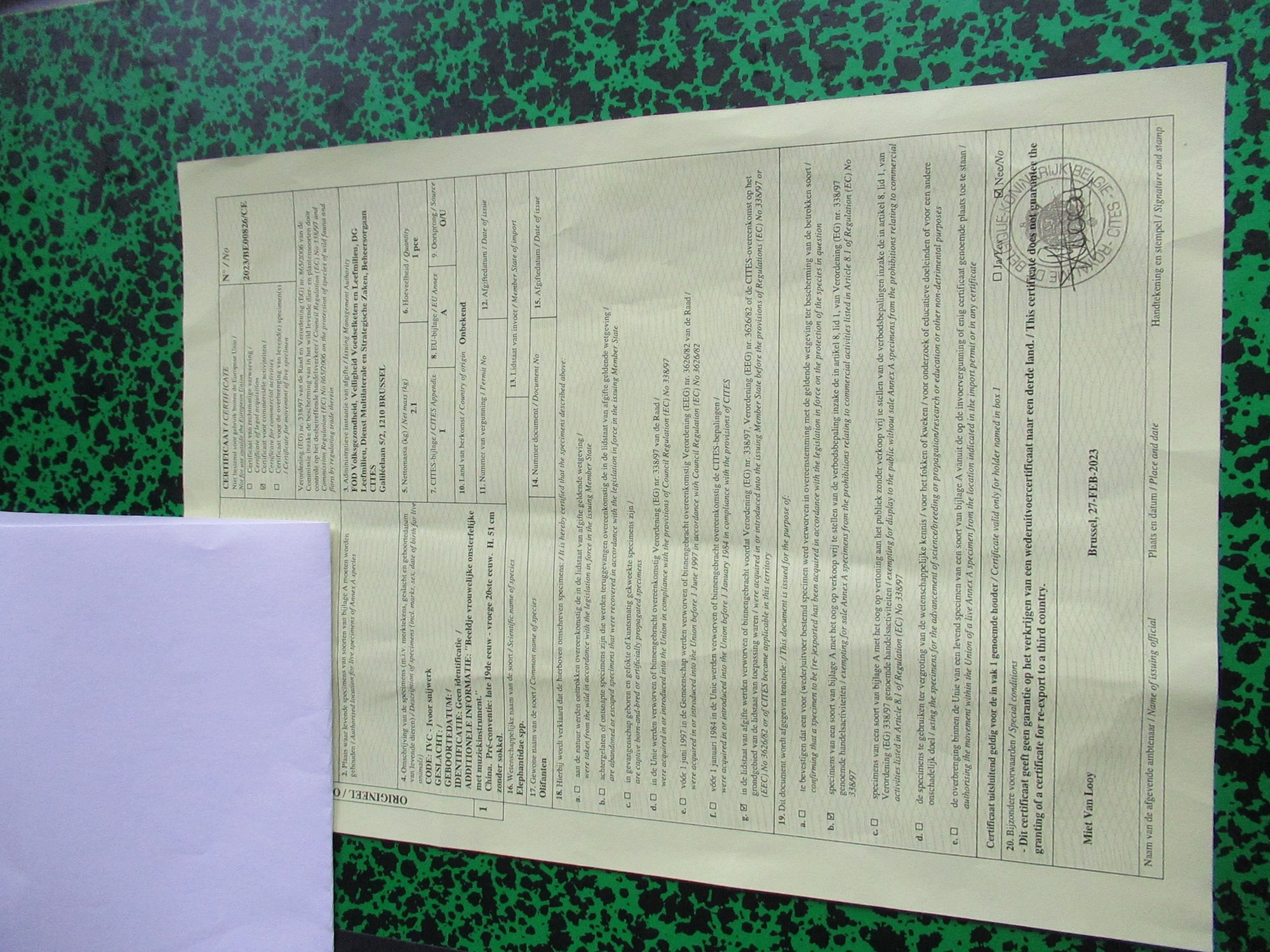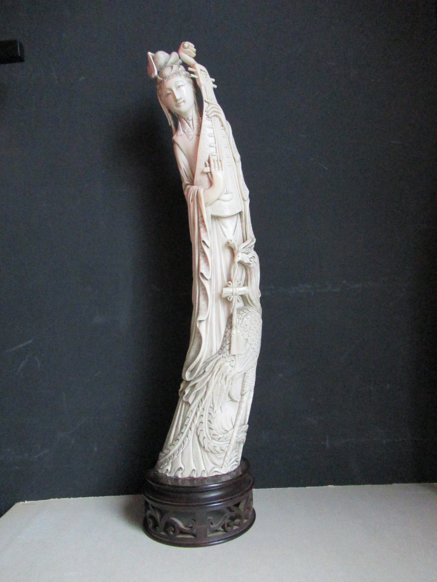 ivory statue of a female immortal with musical instrument. at her side a phoenix. stands on a wooden pedestal 6 cm. total 57 cm. 2100gr. cites 2023/BE00826/CE requested by a certified appraiser. NO EXPORT OUT OF EU 32840129