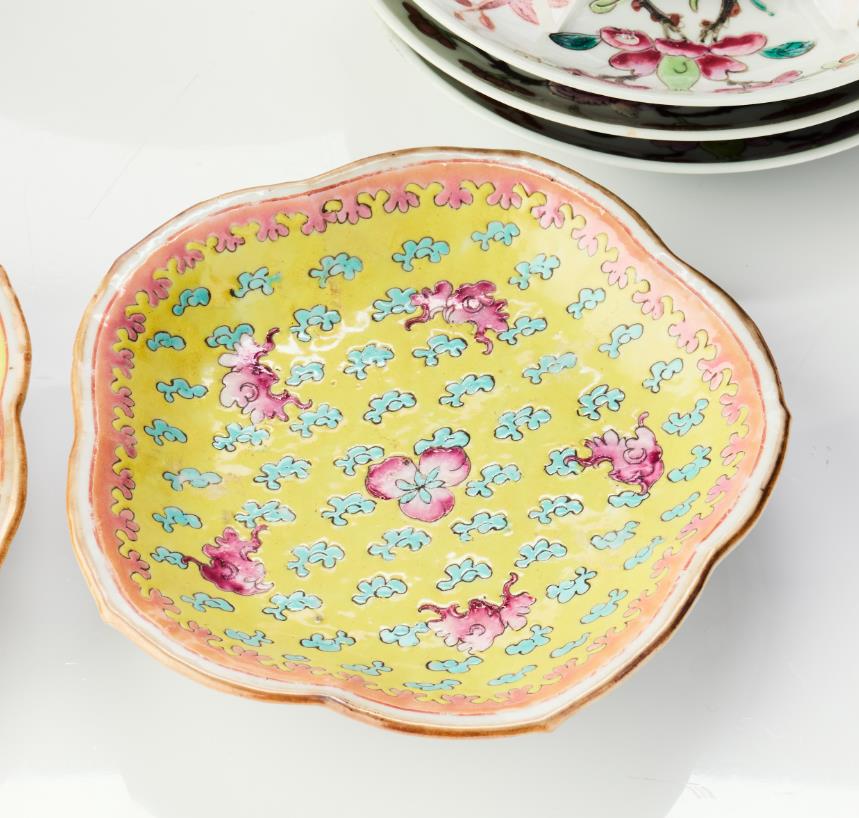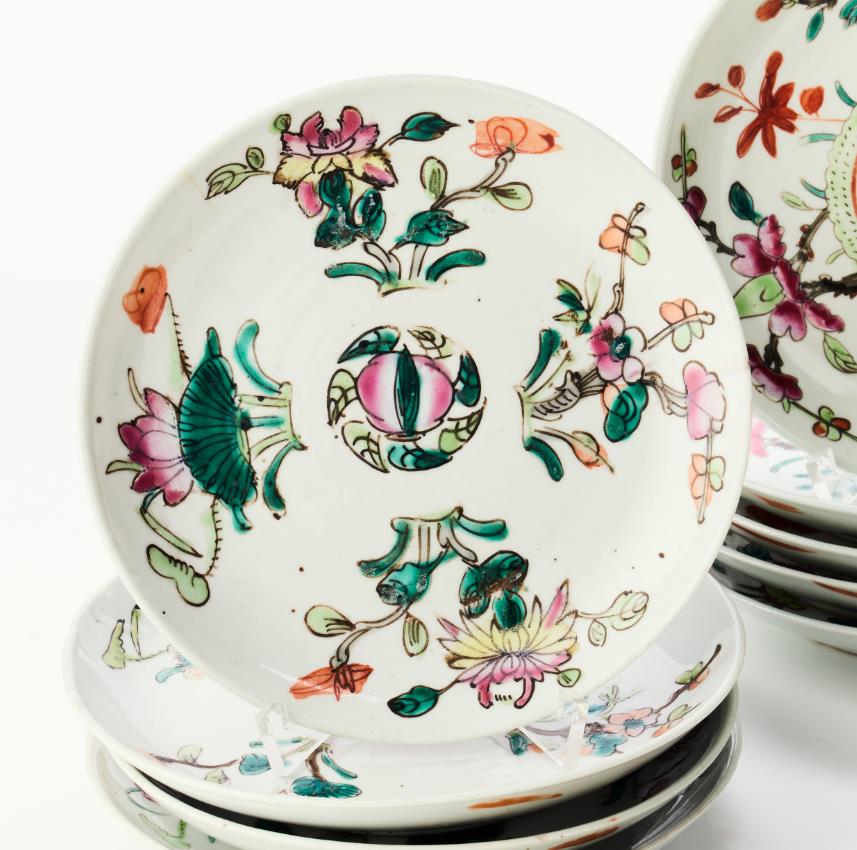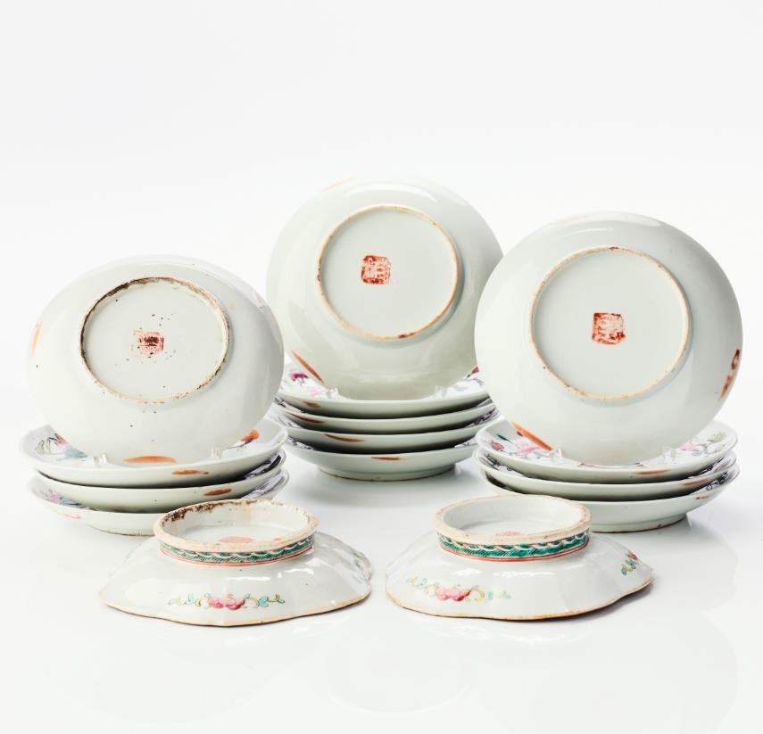 Fifteen Chinese Famille Rose Porcelain Dishes Period: early 20th century. Diameter: 16-17 cm. Konditionsrapport Wear. A few with cracks and chips. Firing defects.