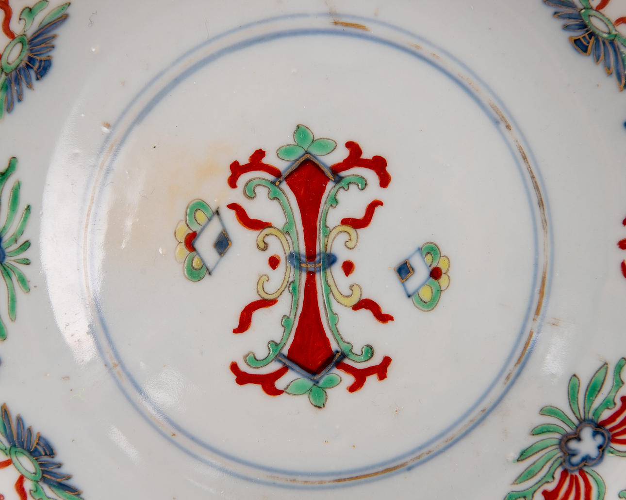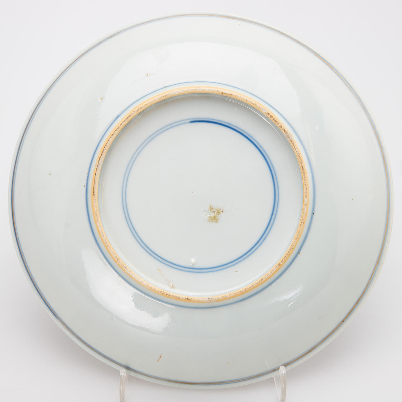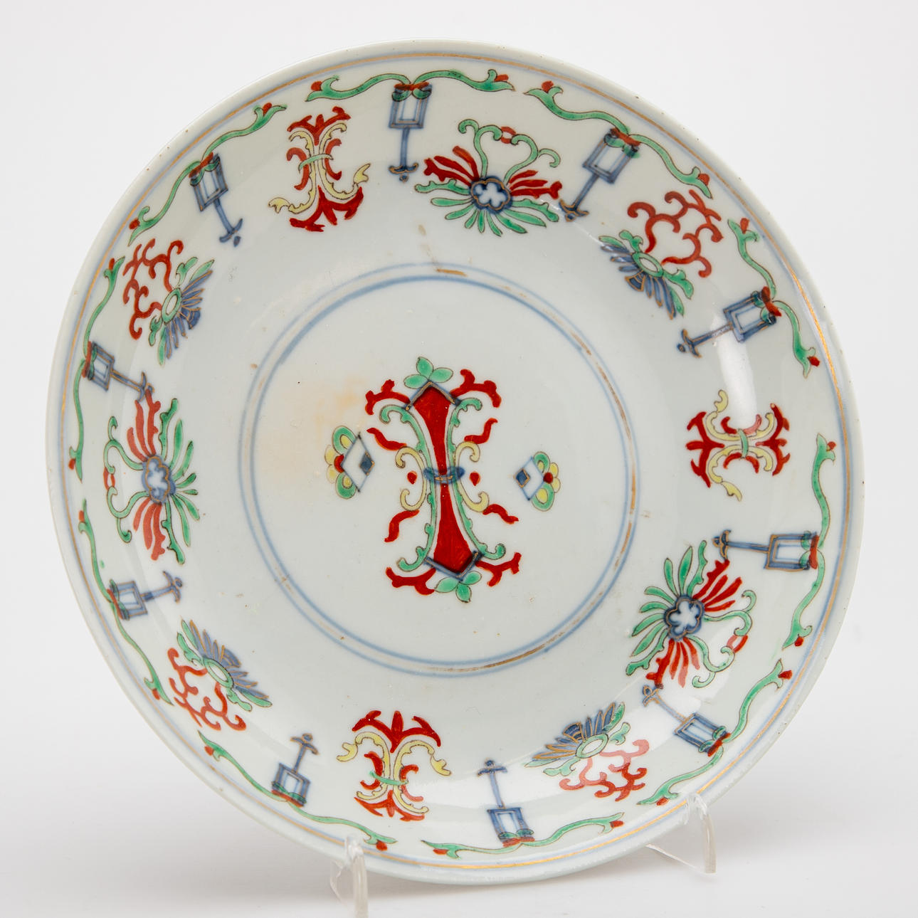 Stoneware, underglaze blue and coloured enamel paintings in light green and light yellow. Iron red overglaze painting and gold staffage. Round shape with a slightly curved wall on a standing ring. Double ring brand Diameter 19 cm. Condition signs of wear. Gold and paint abrasion. A hairline crack on the edge approx. 1 cm. 26490