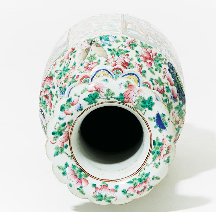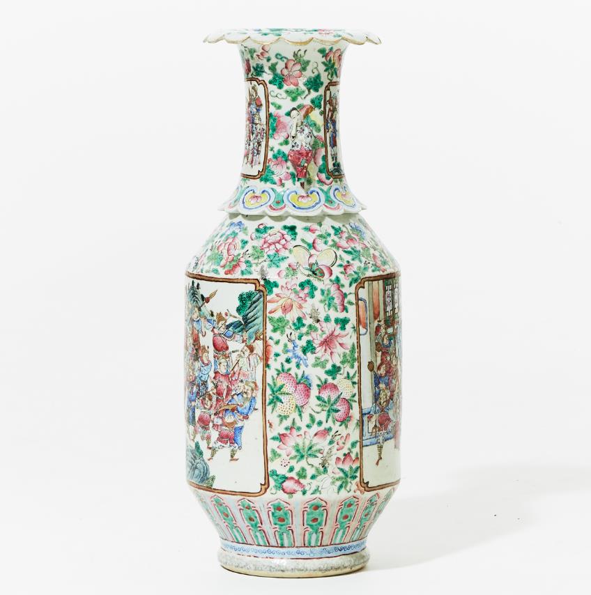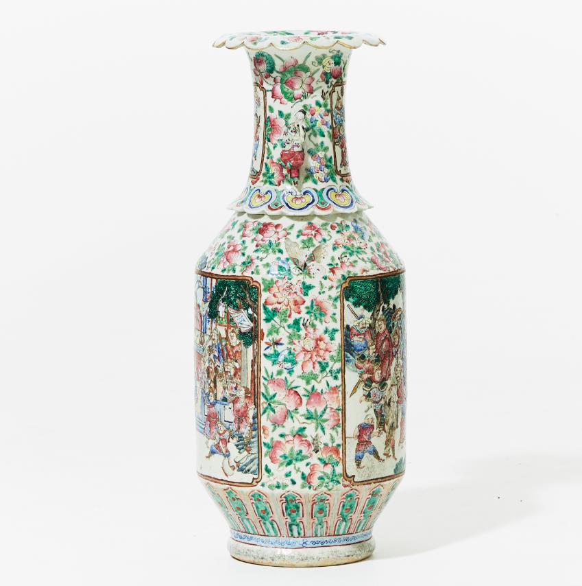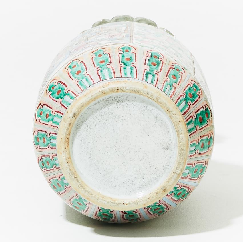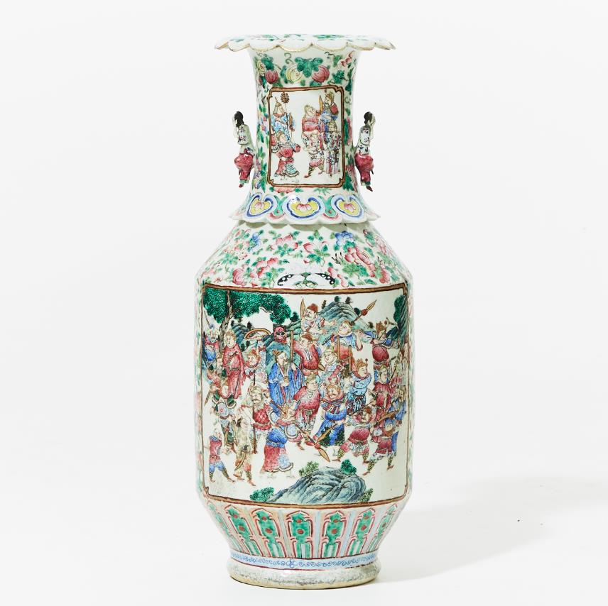 Mid-19th century. Decoration of figure scenes within cartouches as well as flowers, insects and fruits in famille rose. Handles in the form of female figures. H 63 cm. Condition report Wear. Glaze defects. Chipping occurs. Restored mouth edge.