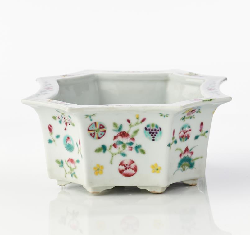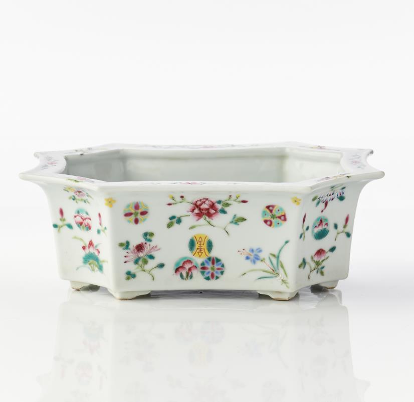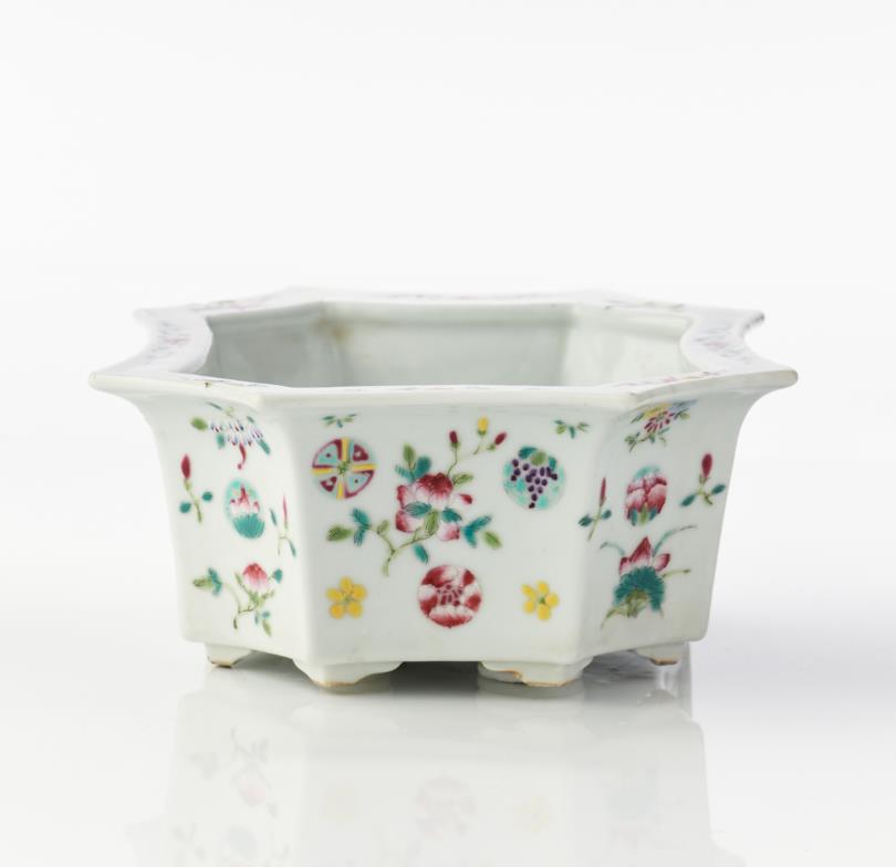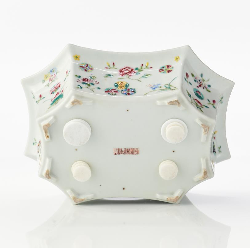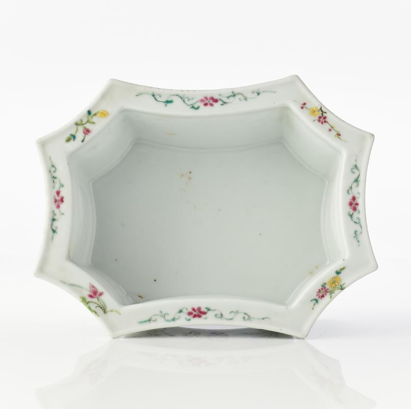 Octagonal shape. Decoration of scattered flowers and emblems in famille rose. Brand of Qianlong in iron red. H 8 cm, L 24 cm. Condition report Minor wear. Insignificant glaze defects. Minor firing crack.