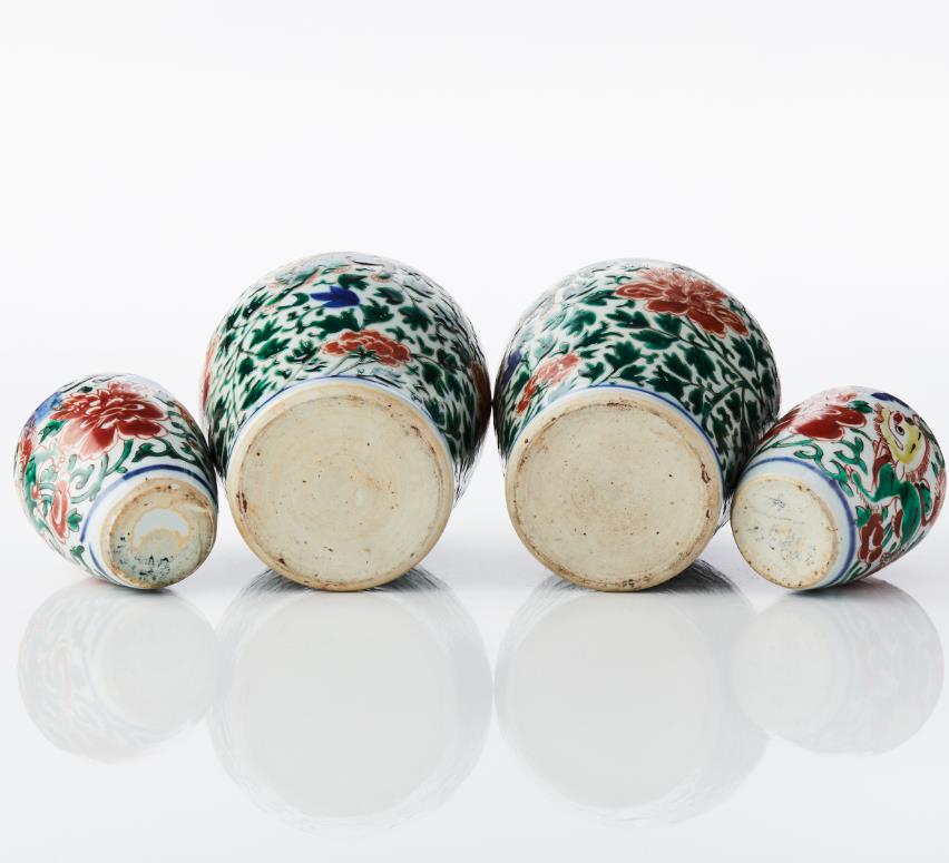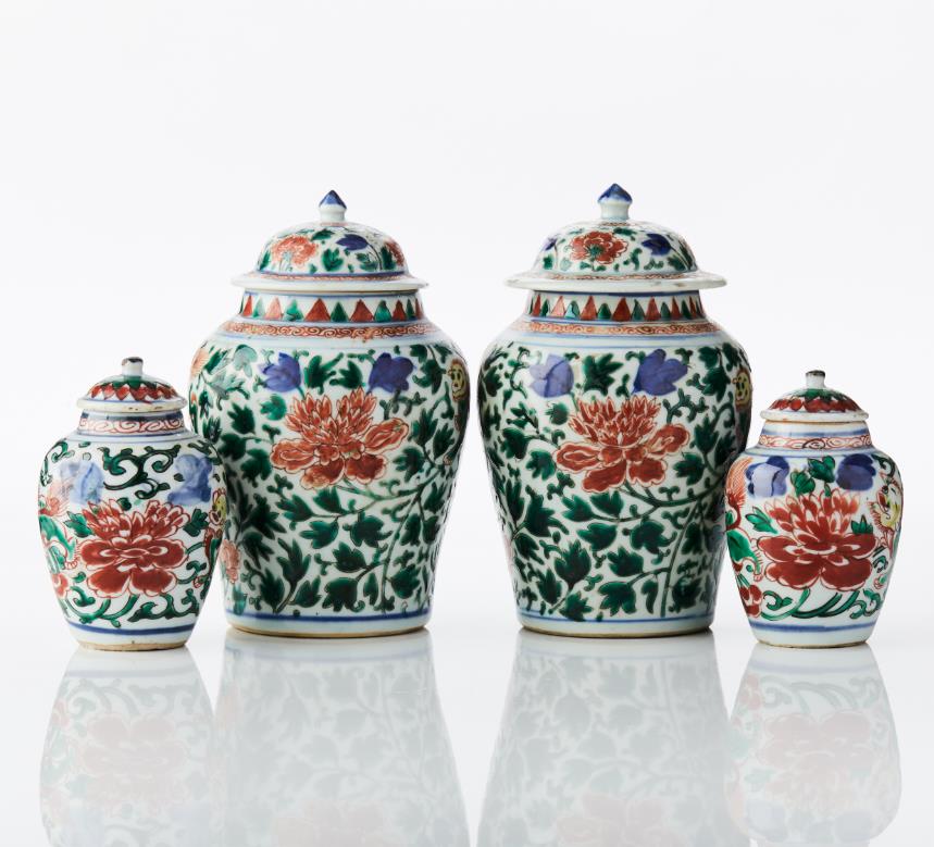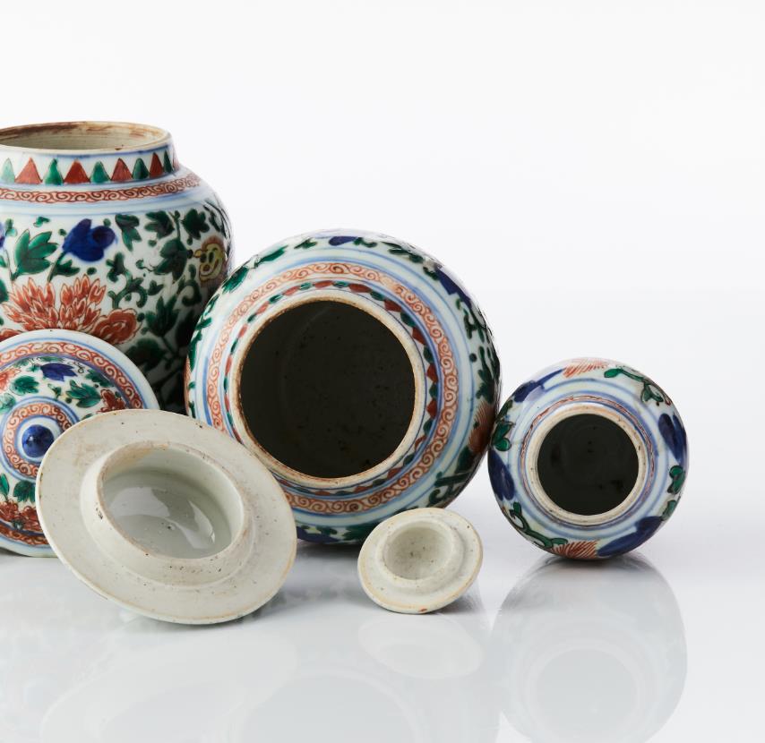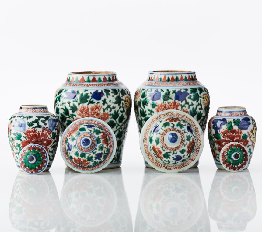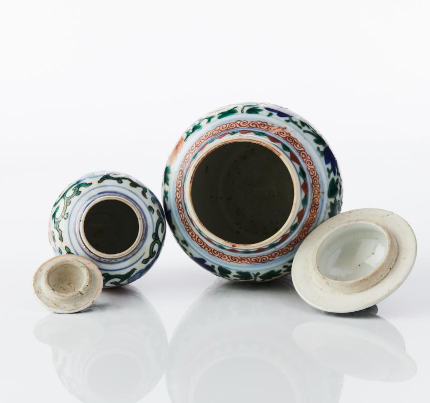 Four Chinese Wucai Jars and Covers Comprising: one large pair and one smaller pair, all decorated in wucai enamels with a design of foo lions gambolling among dense scrolling peony and tulips, the larger pair with spiral work around the shoulder and flame pattern around the neck, the domed cover with knop finial and decorated with peony, the smaller pair with stylised wave scroll around the neck, the covers with petal decoration. Period: 17th century and later. Height: 12‑20 cm.